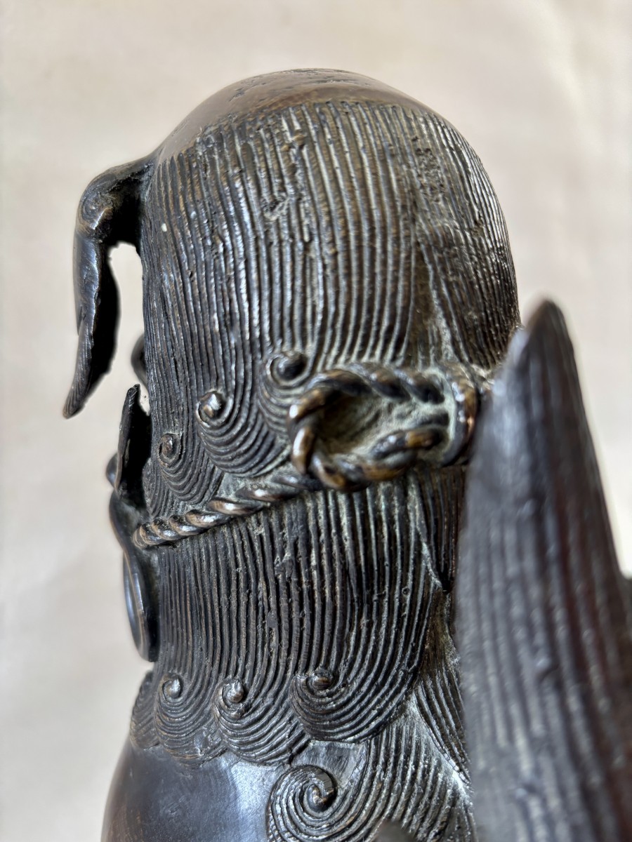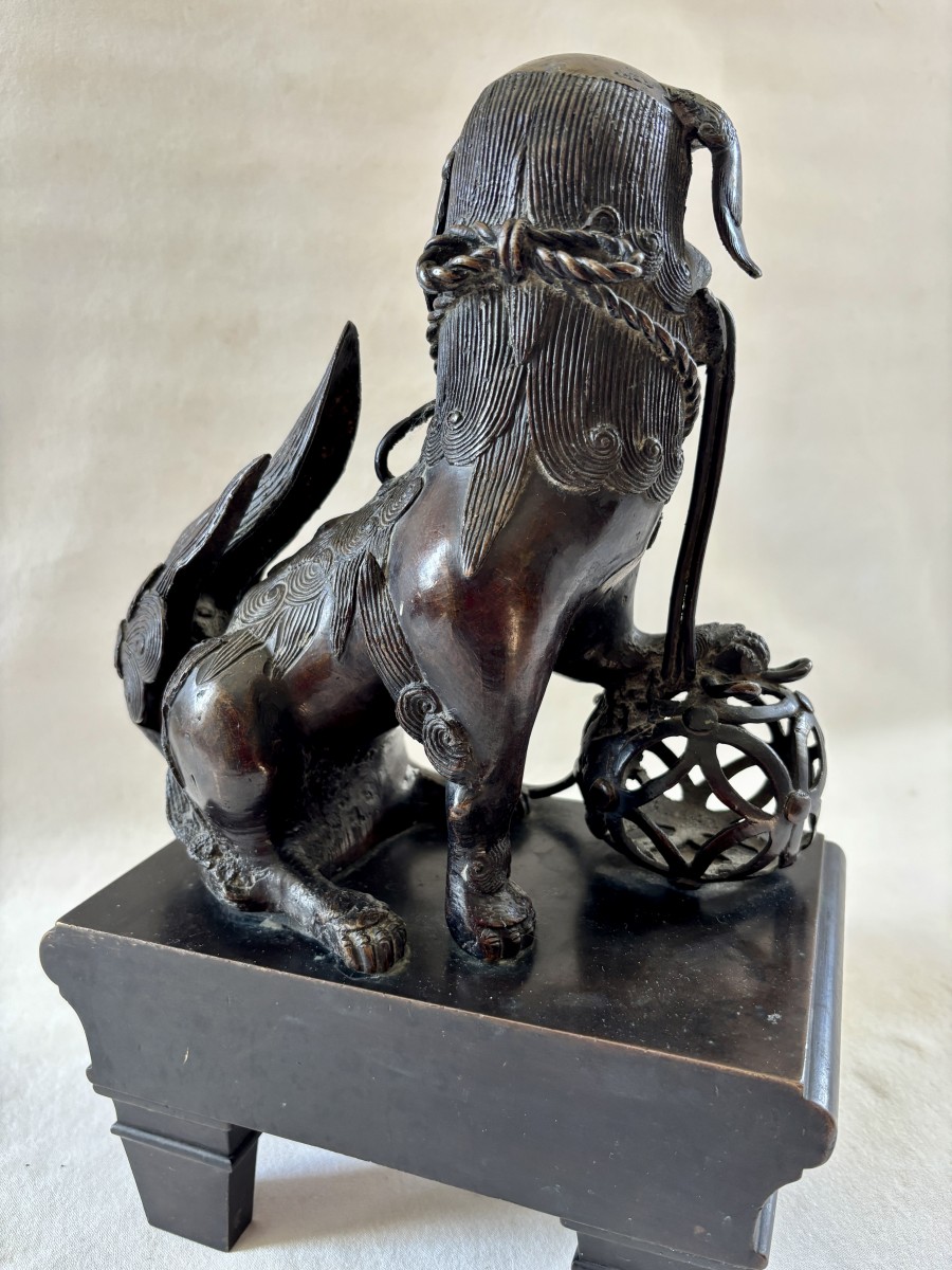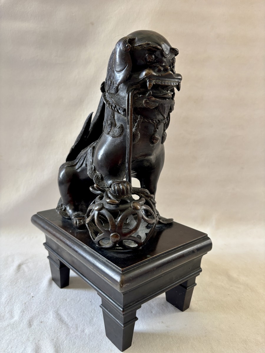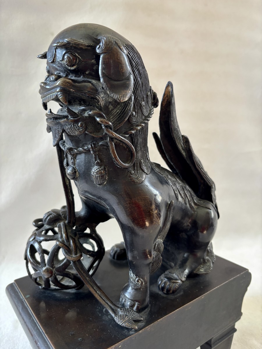 Grande paire de sculpture asiatique représentant des chiens de Fô en bronze patiné, la patte reposant sur une boule de canton ils étaient les gardiens du temple.