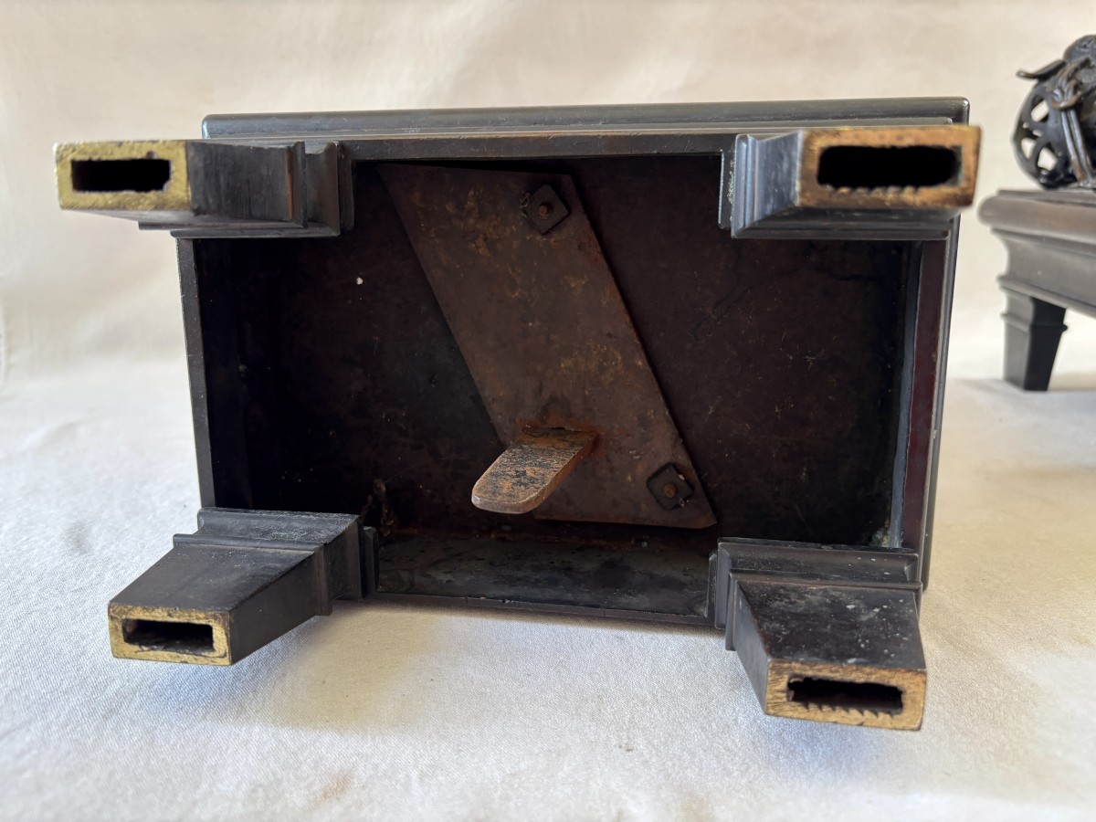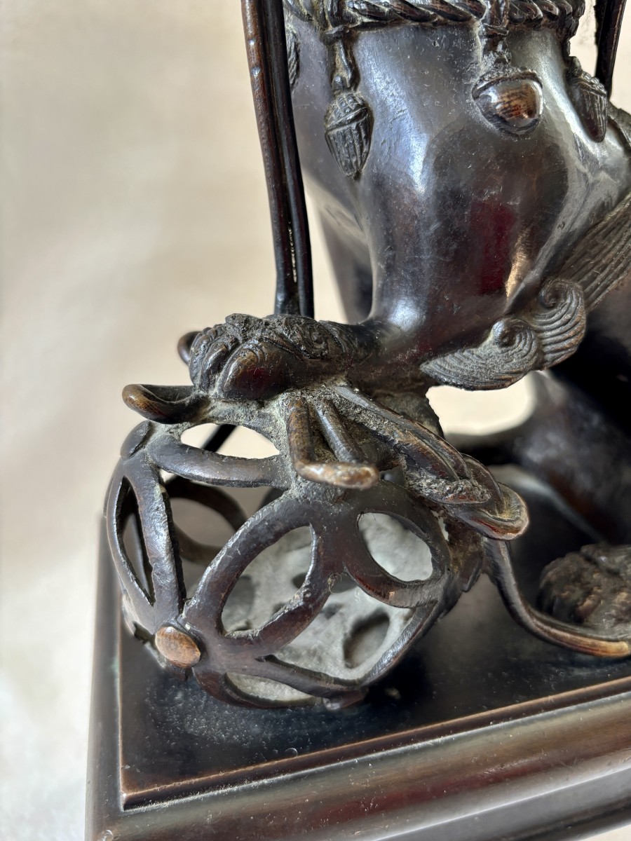Les bronzes sont d'origines asiatique datant de la fin du XVIIIe siècle ou du XIXe siècle et montés sous la seconde moitié du XIXe en France sur des socles de bronze patiné de grande qualité certainement réalisés sur commande par Barbedienne pour en faire des devants de chenets.