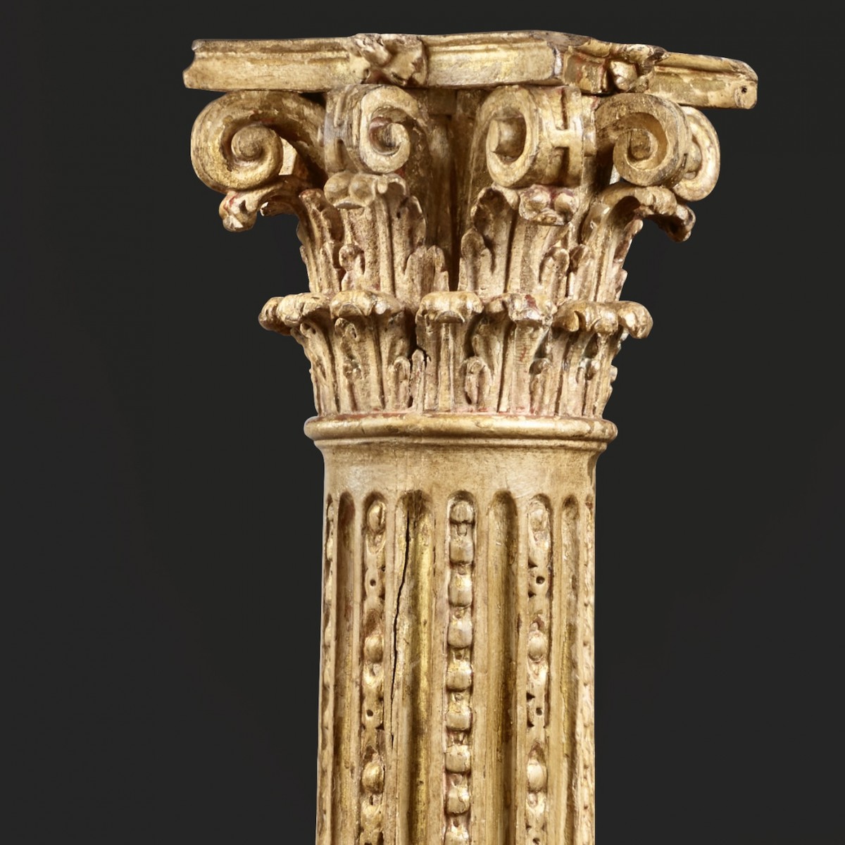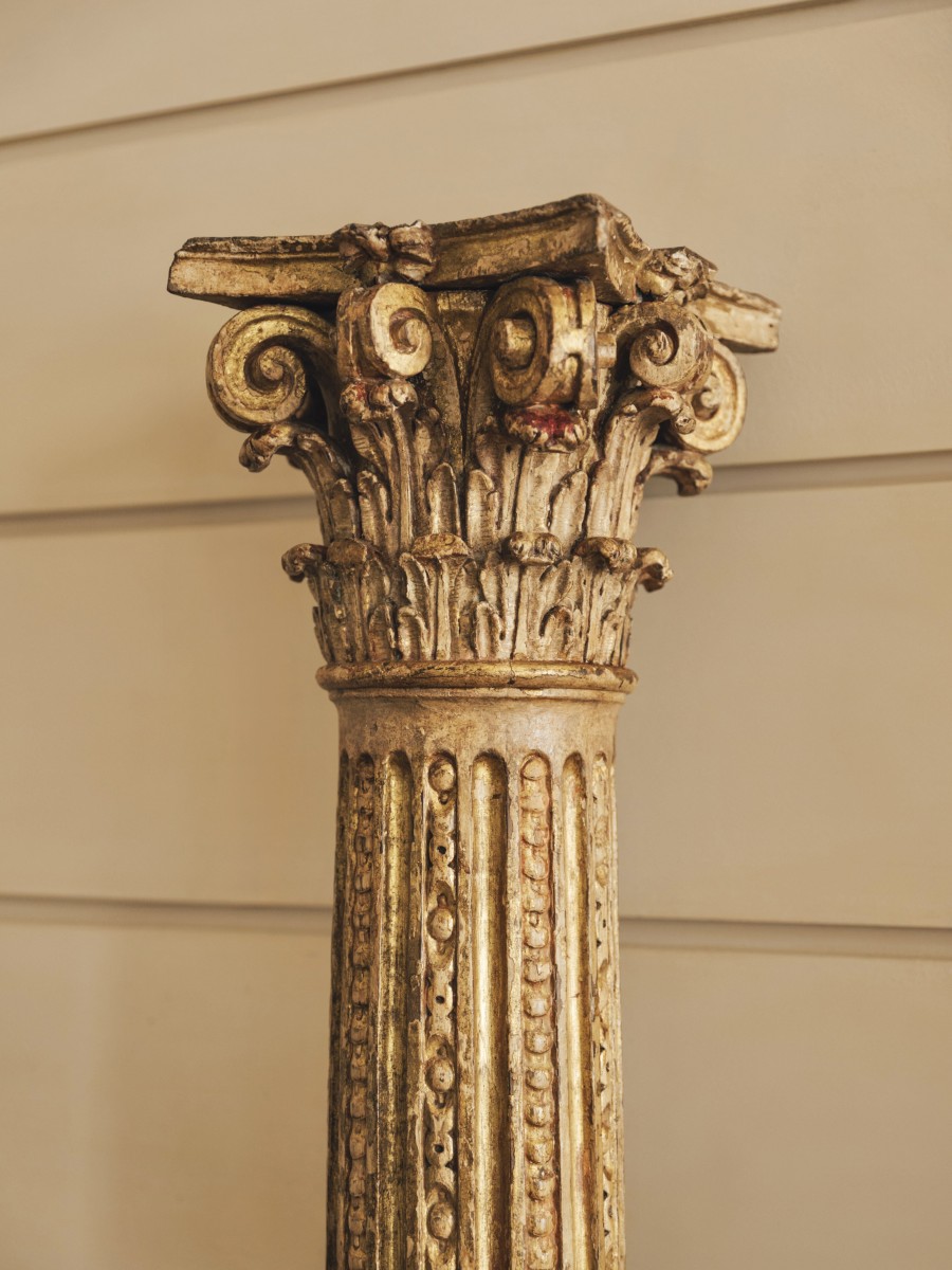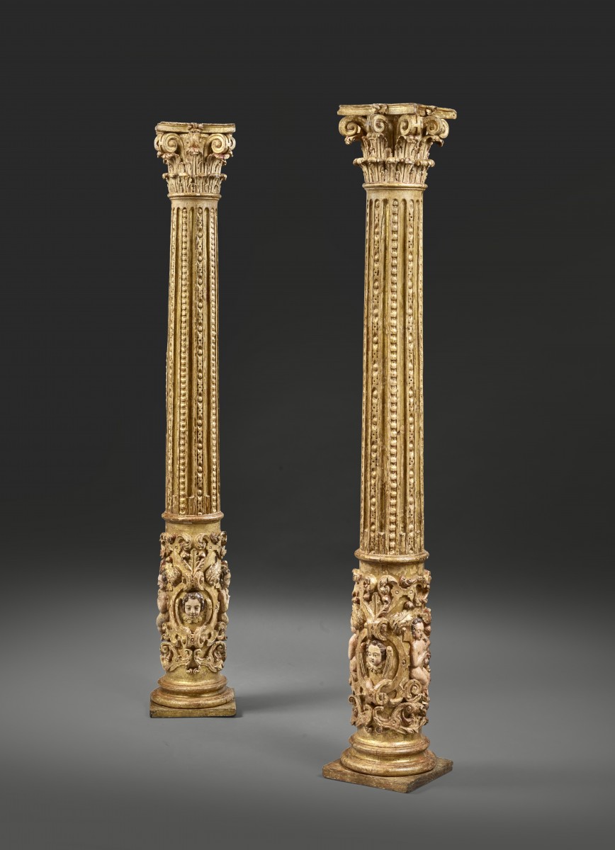 Élément d’architecture récurant depuis l’Antiquité, les colonnes sont également constitutives de certains décors intérieurs. En pierre, marbre ou bronze doré elles peuvent être déployées en bois doré en particulier dans les intérieurs espagnols et italien du XVIe et XVIIe siècle où elles forment encadrement de porte ou élément décoratif à part entière.