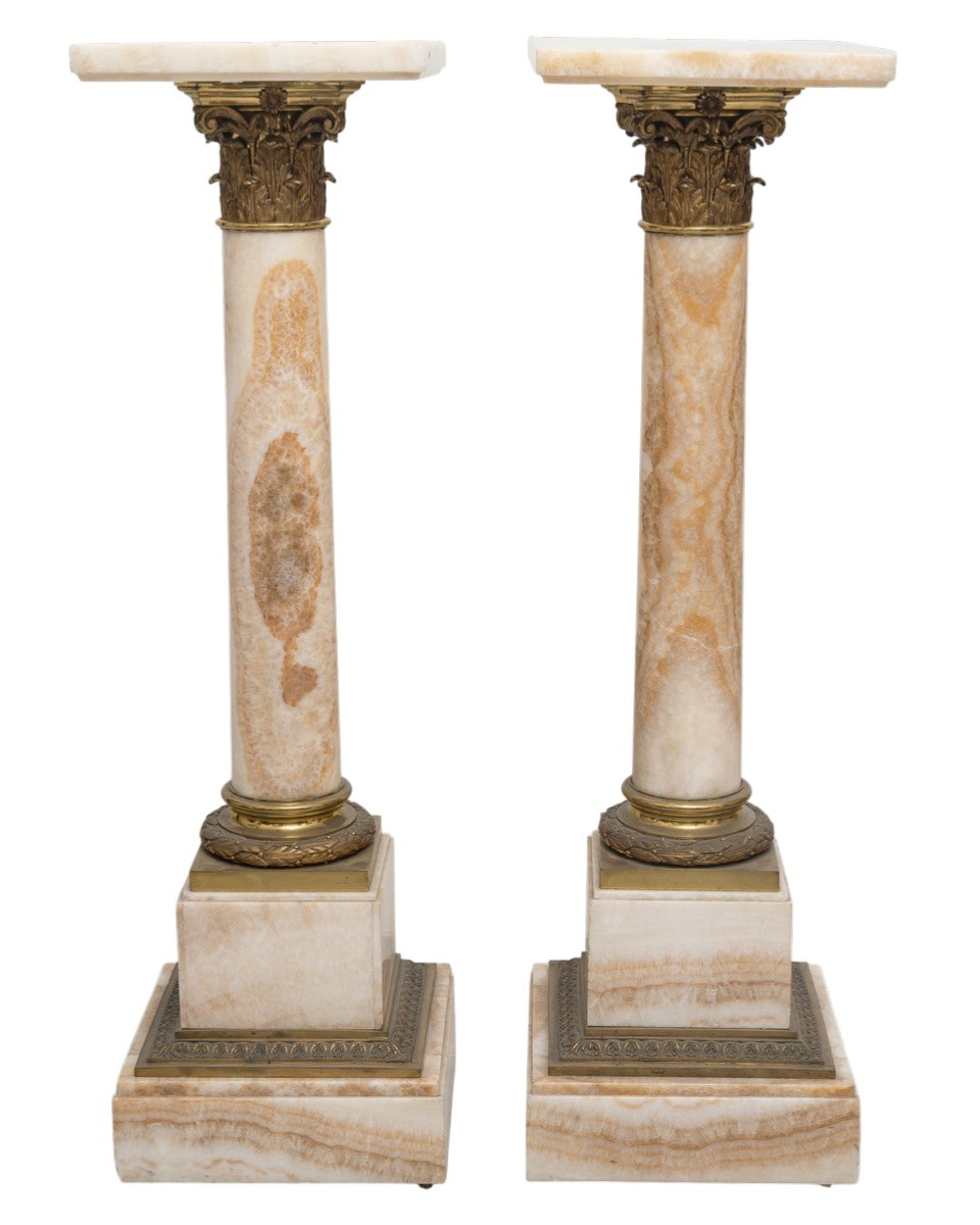 Retrouver le mobilier ou les objets d''art similaires à « Paire de colonnes en onyx du Maroc et bronze doré, Circa 1870 » présenté par Acropole Antiquités, antiquaire à Saint-Ouen dans la catégorie Colonne Piédestal Napoléon III, Objet de décoration.