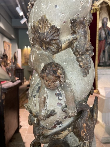 Paire de colonnes de retable, torses en bois sculpté et stuc du XVIIIe.