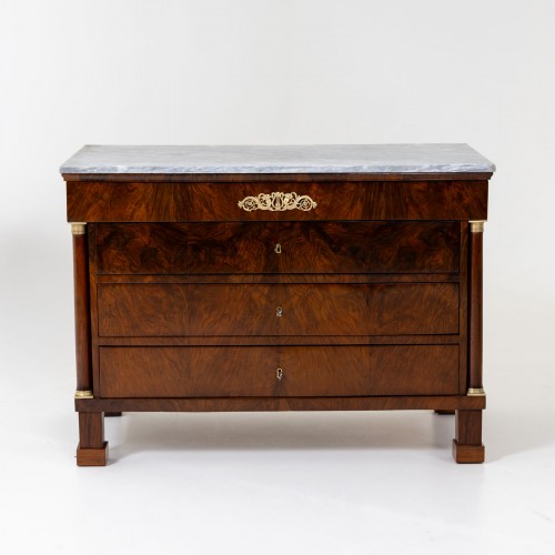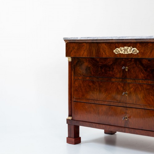Paire de grandes commodes à quatre tiroirs et à colonnes pleines flanquées de chapiteaux et de bases en bronze doré au feu. Les commodes sont plaquées en noyer et présentent un beau motif de placage dynamique. Un plateau en marbre gris clair complète l'élégance de l'ensemble. Le tiroir supérieur, légèrement en saillie, repose sur les colonnes et est décoré d'une applique dorée au feu avec un motif central de lyre.