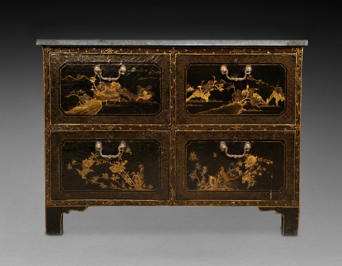 Les panneaux présents sur notre commode proviennent d’un grand paravent réalisé en Chine, dans les ateliers de la ville de Canton, pour l’exportation en Europe.