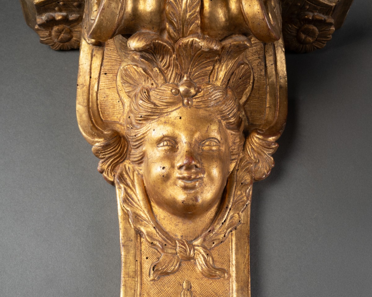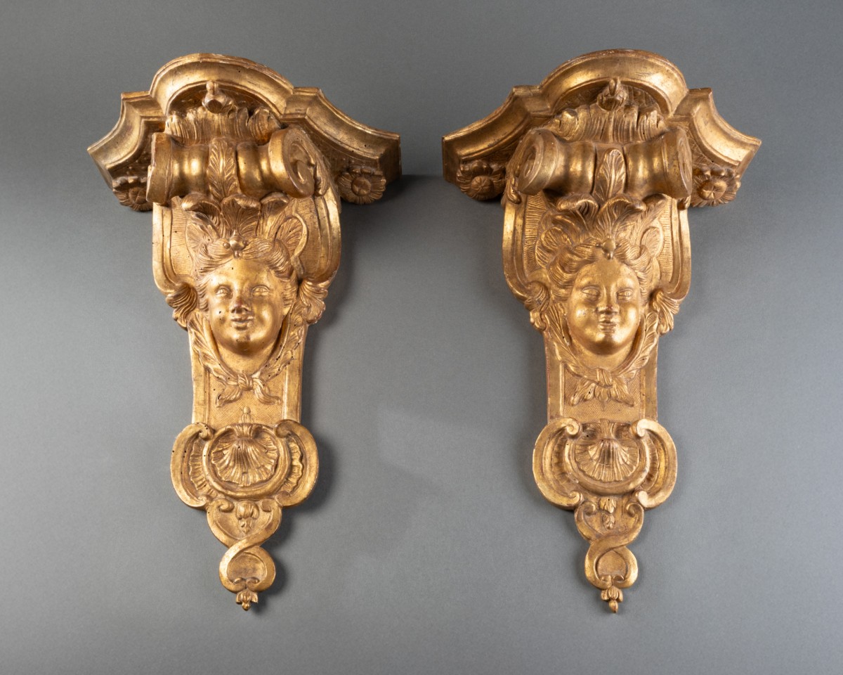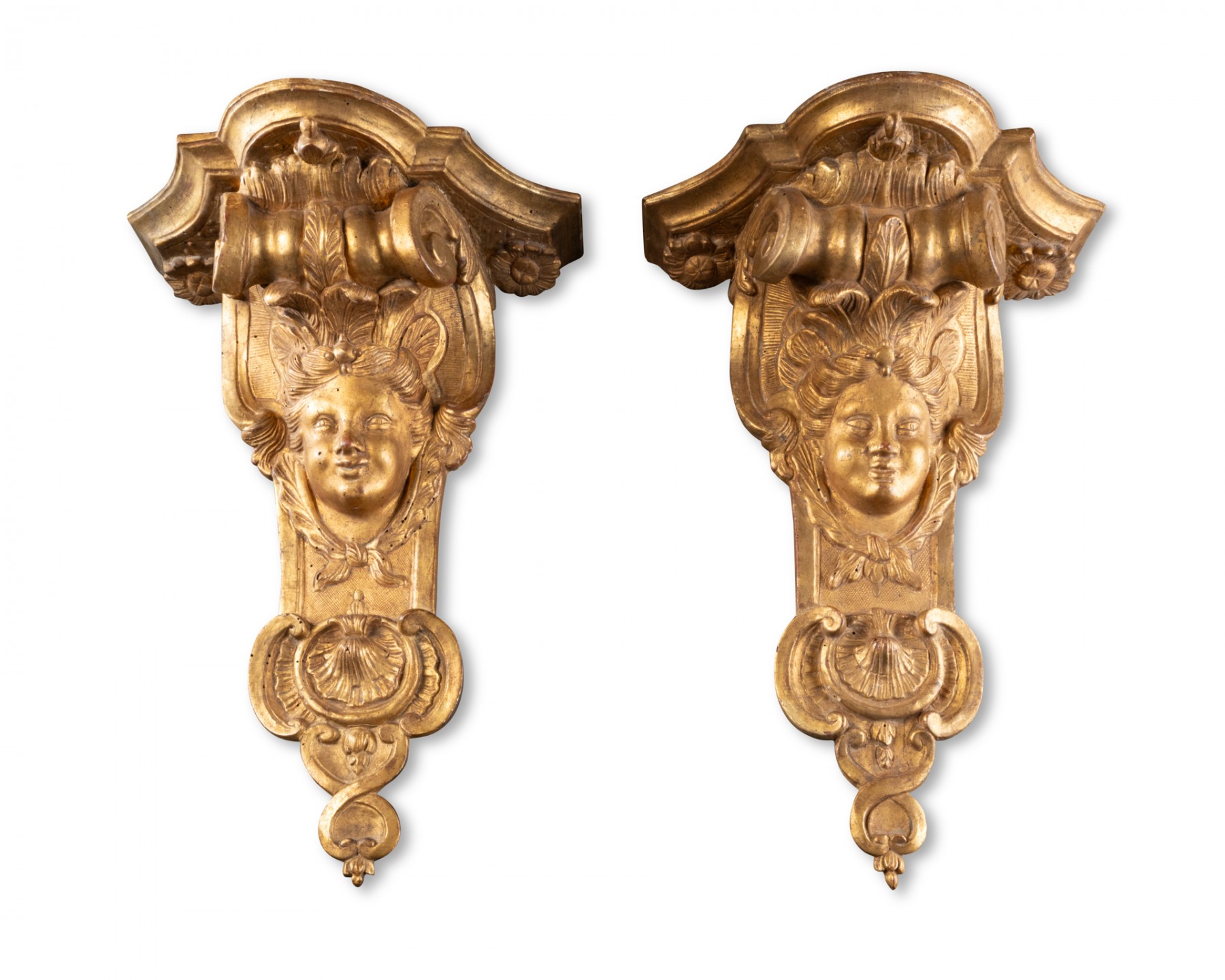 Belle paire de petites consoles d’appliques en bois de tilleul doré à la feuille.