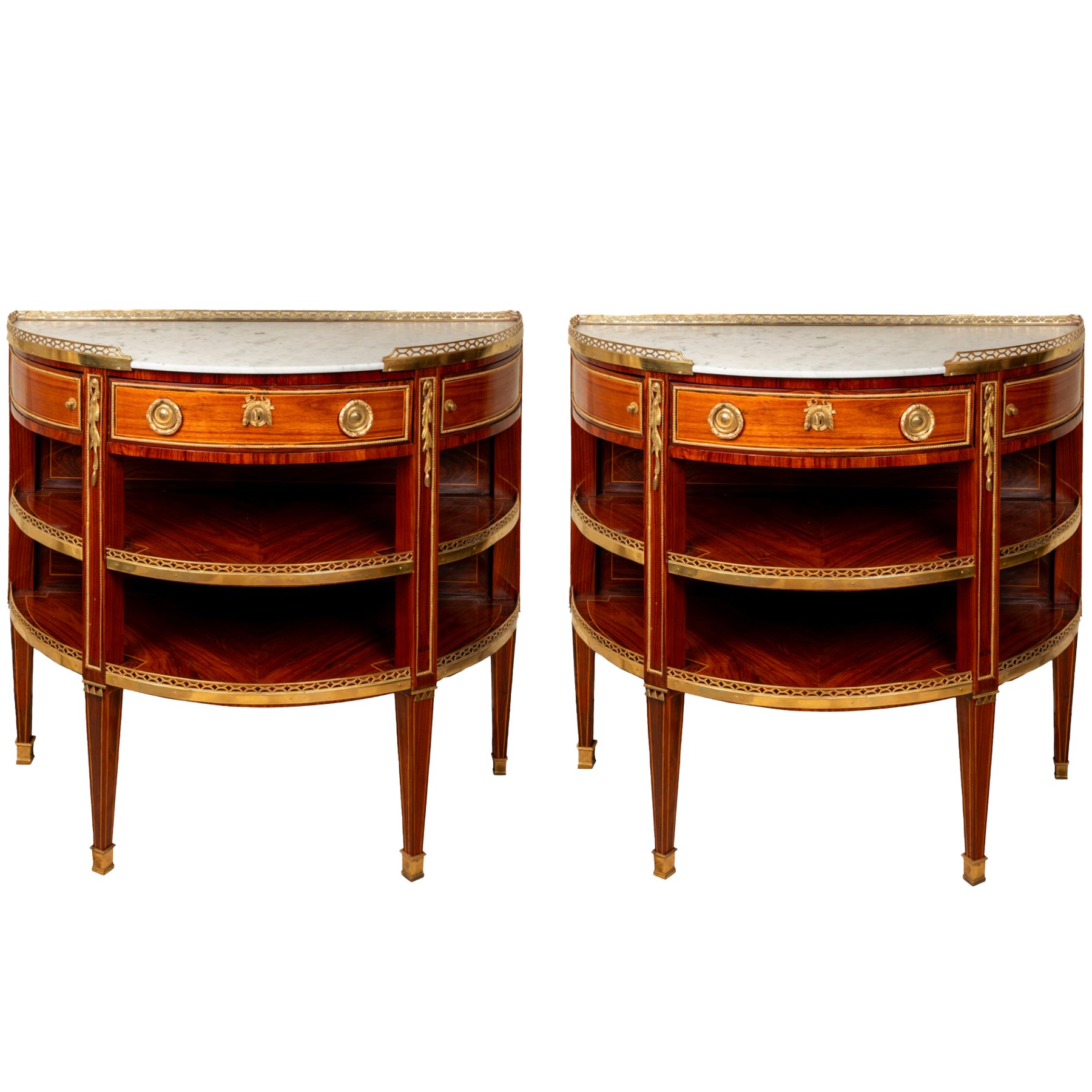 De forme demi-lune , à dos plein ,à trois plateaux ceints d’une galerie ajourée en bronze doré , elles ouvrent en ceinture par trois tiroirs dont deux pivotants . Elles présentent sur les étagères et le fond une élégante hiérarchie du décor en bois satiné et violette encadrés par des filets de citronnier . Ornementation en façade des tiroirs et sur la partie médiane des quatre montants d’un cadre perlé en bronze doré . Une frise de mutules souligne l’articulation avec les pieds en gaine à patins de bronze doré . Le dessus en marbre blanc veiné .Chutes drapées sur les montants , poignées de tirage , entrées de serrure en bronze ciselé et doré .