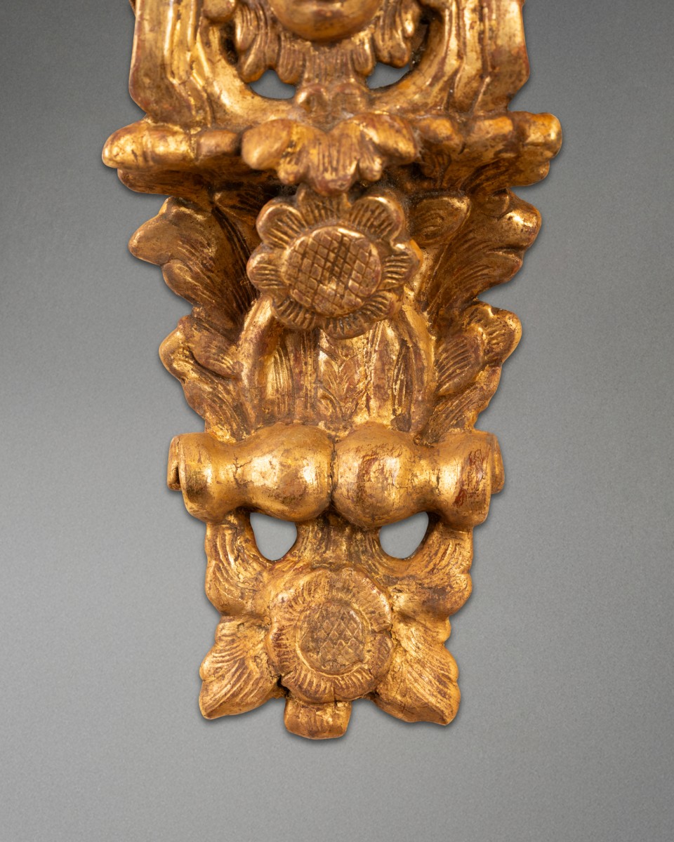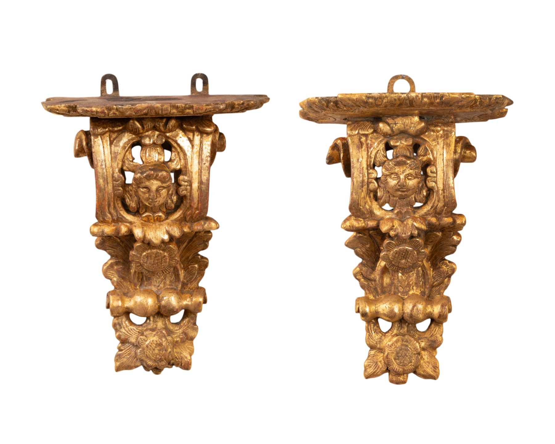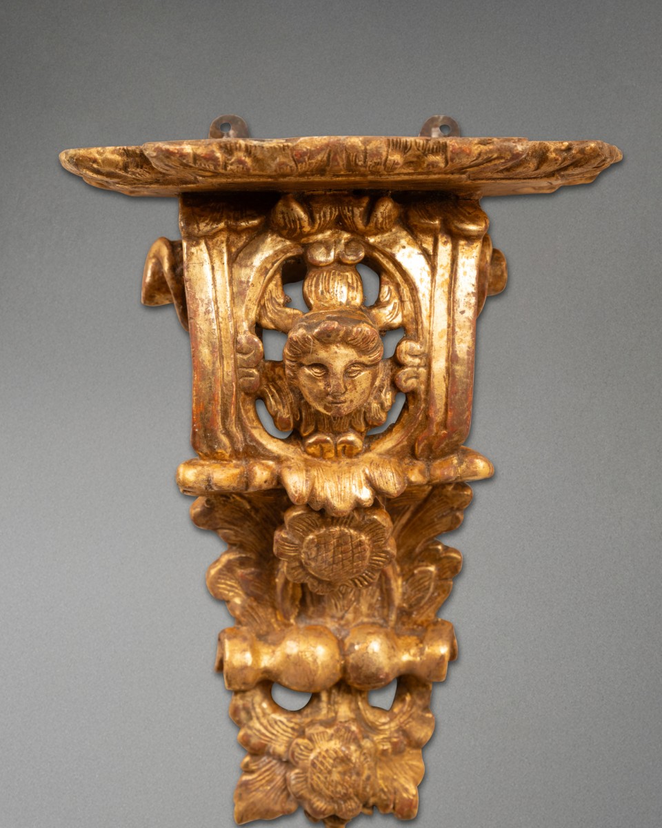 Paire de consoles murales en bois sculpté et doré à tête d'angelot dans un cartouche ; riche décor fleuri.