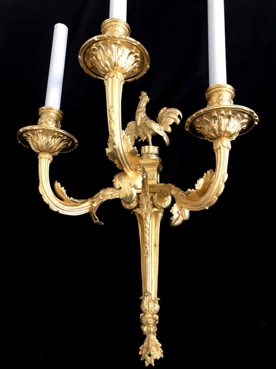 Paire de grandes appliques à trois bras de lumières en bronze ciselé et doré, de style néoclassique surmonté d'un coq.