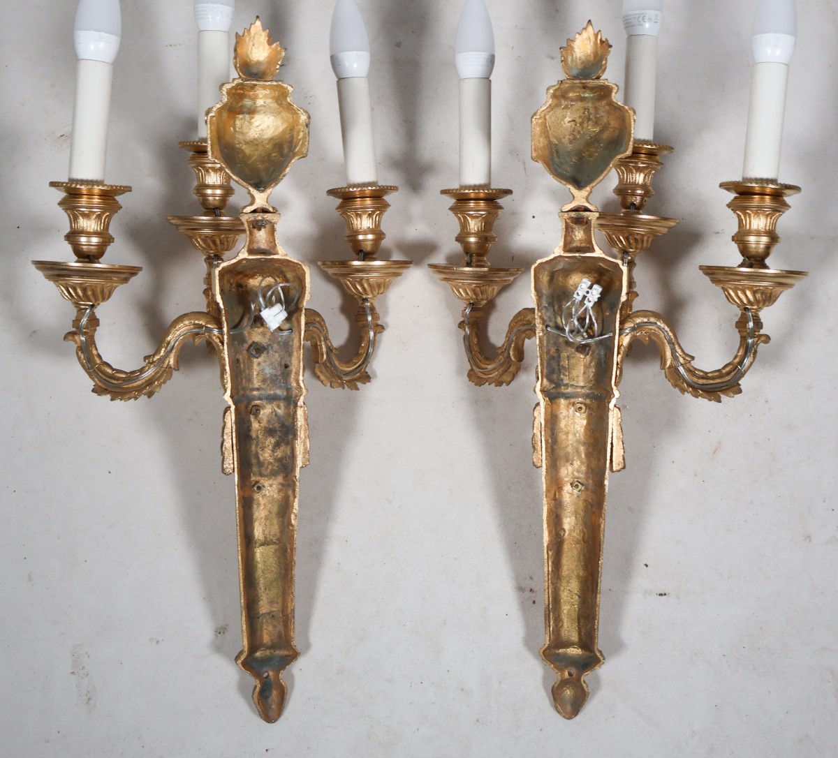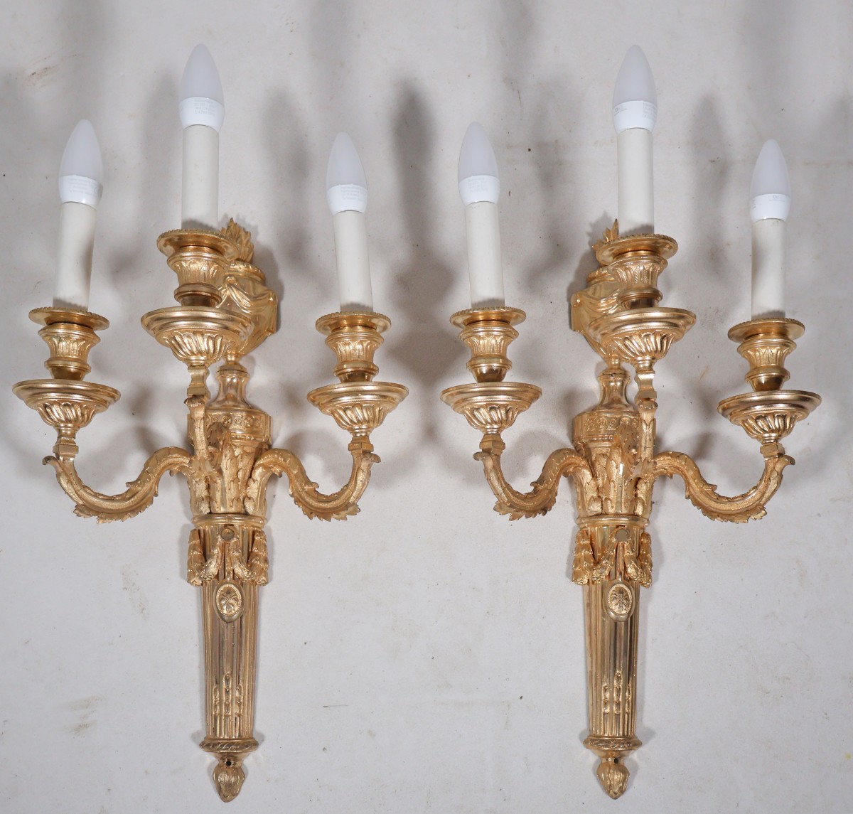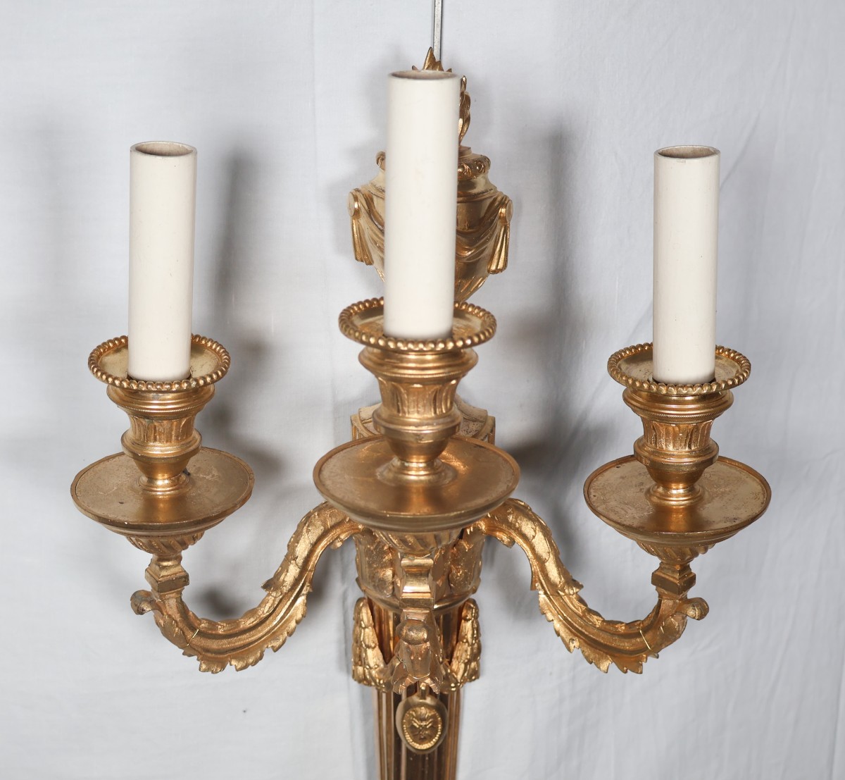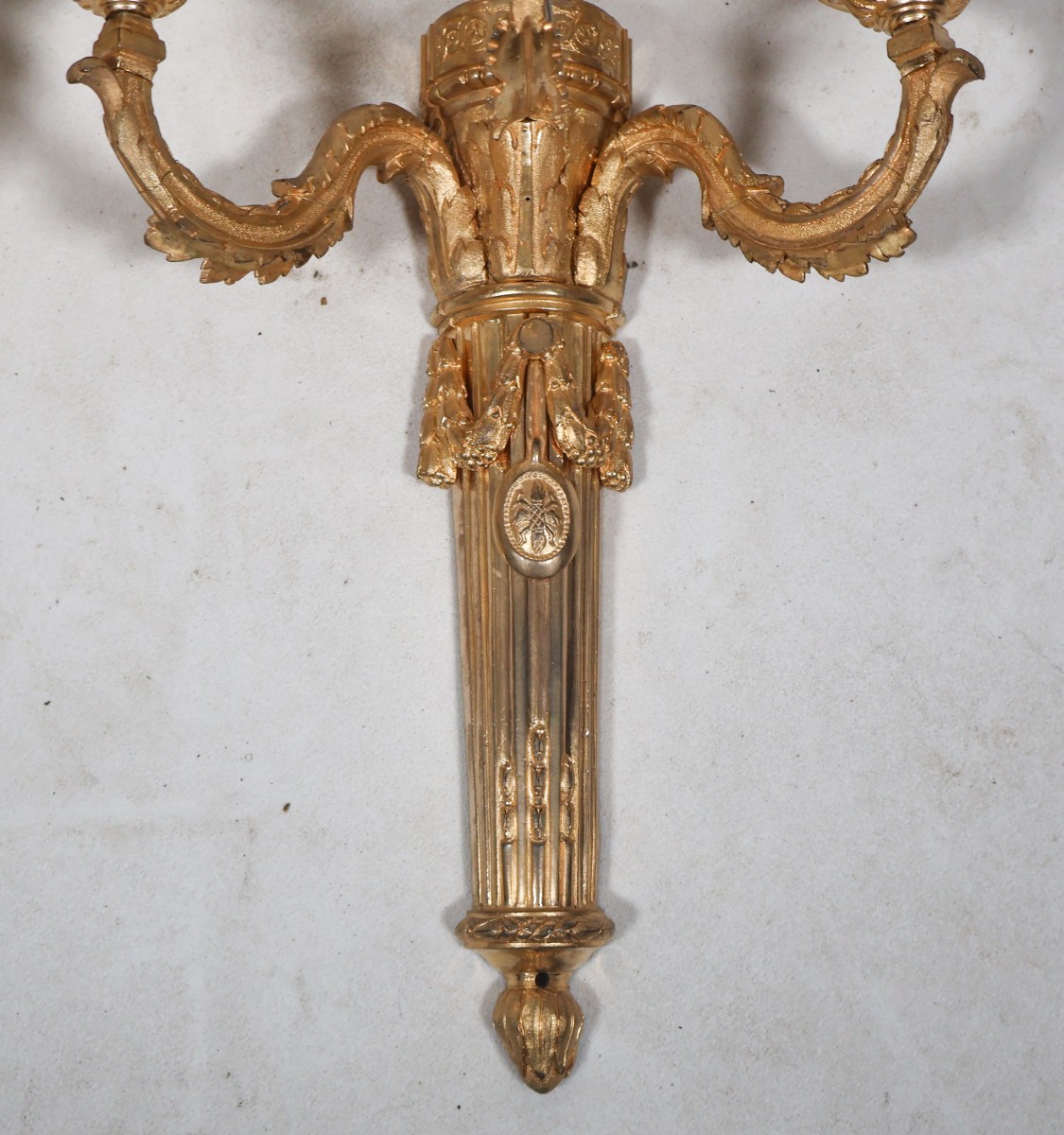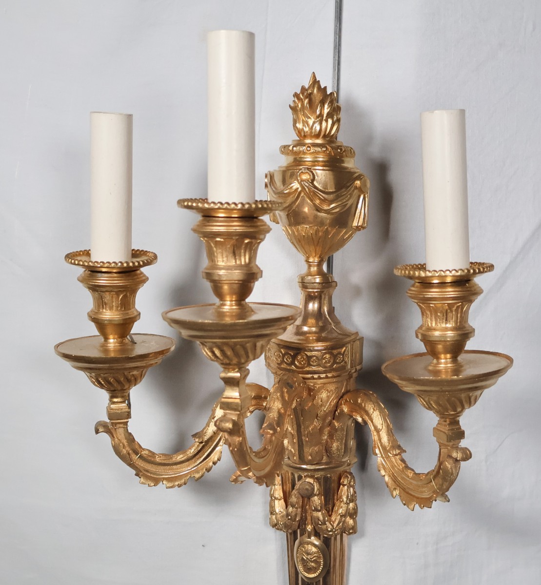 Bras à motifs de feuilles d’acanthe, bobèches à feuilles d’eau, coupelles à cannelures torsadées et rais-de-cœur.