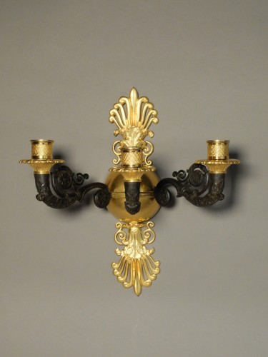 Paire d'appliques en bronze à patine brune et bronze doré, éclairant par 3 feux.
