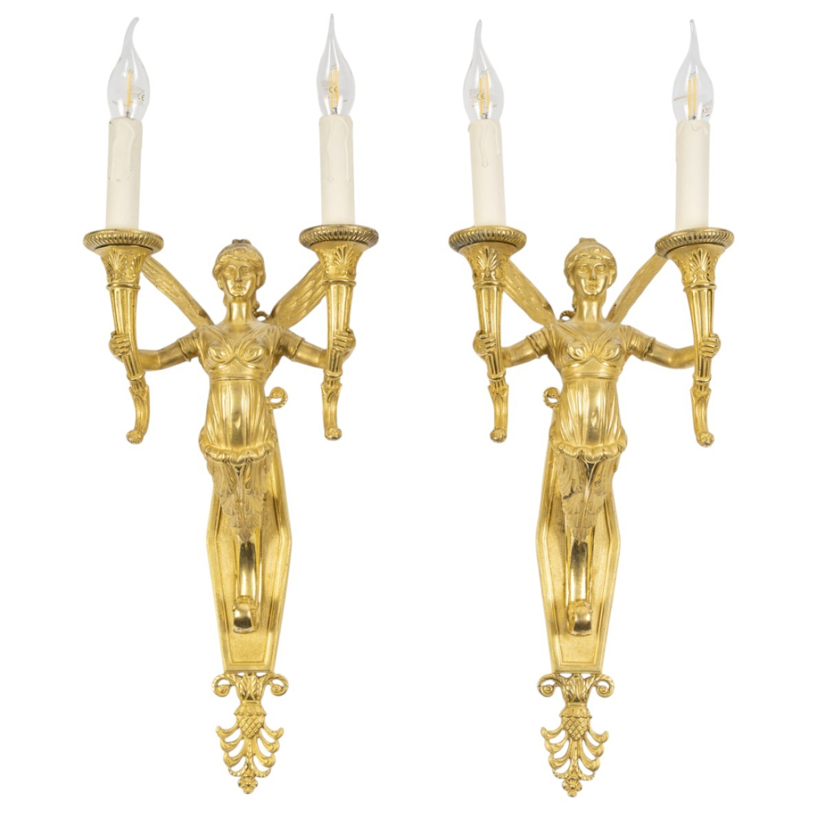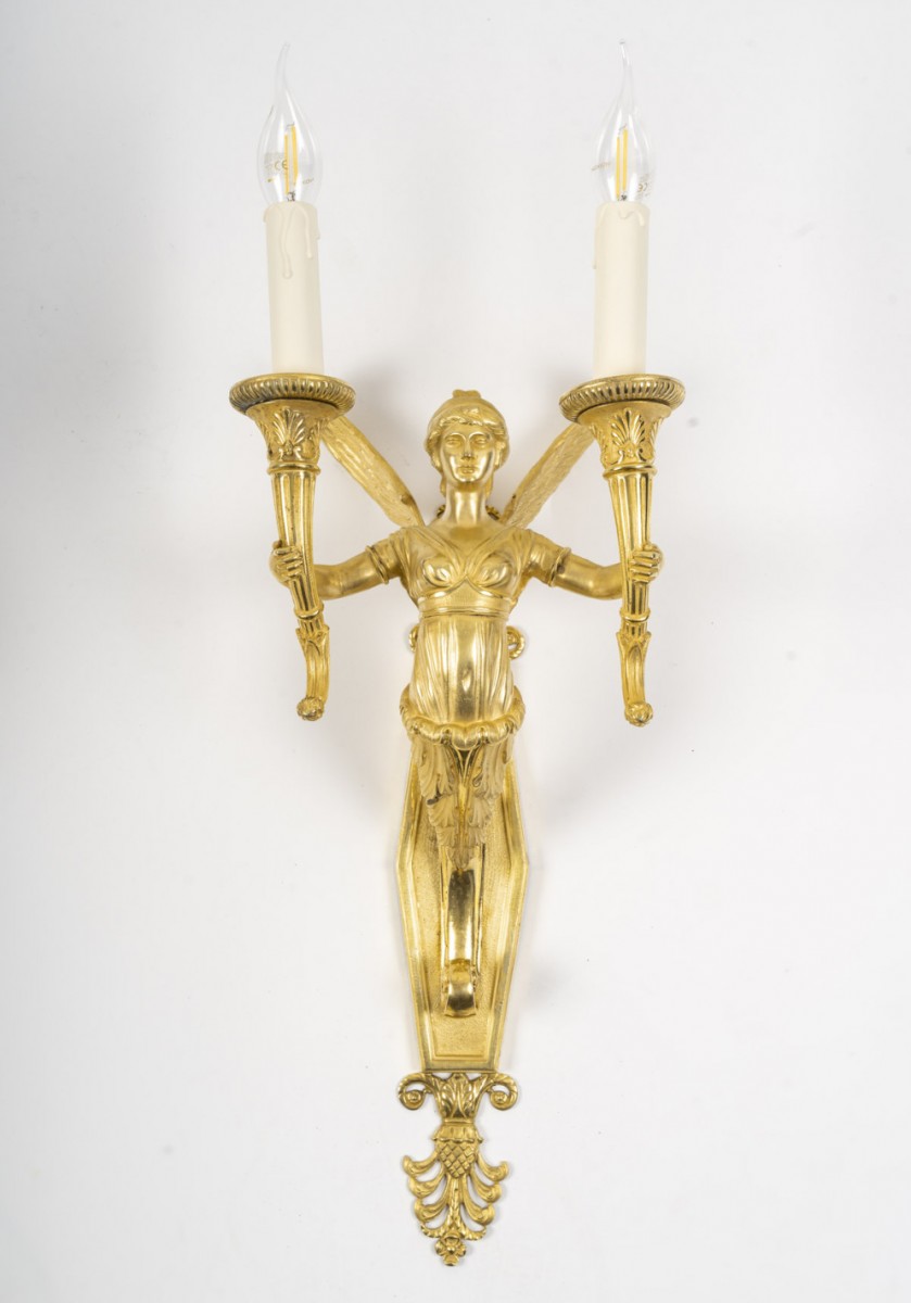 Retrouver le mobilier ou les objets d''art similaires à « Paire d'appliques à décor de cariatides ailées, d'époque Empire » présenté par Catel Antiquités, antiquaire à Saint-Ouen dans la catégorie Appliques Empire, Luminaires.