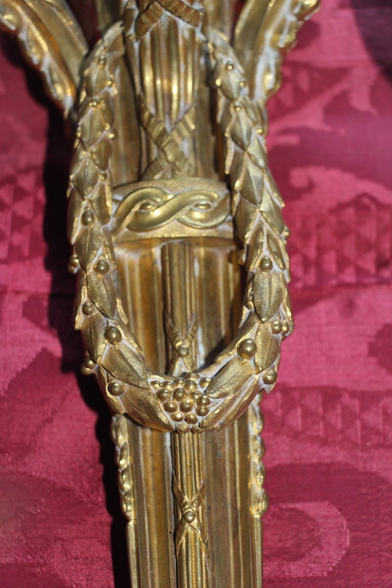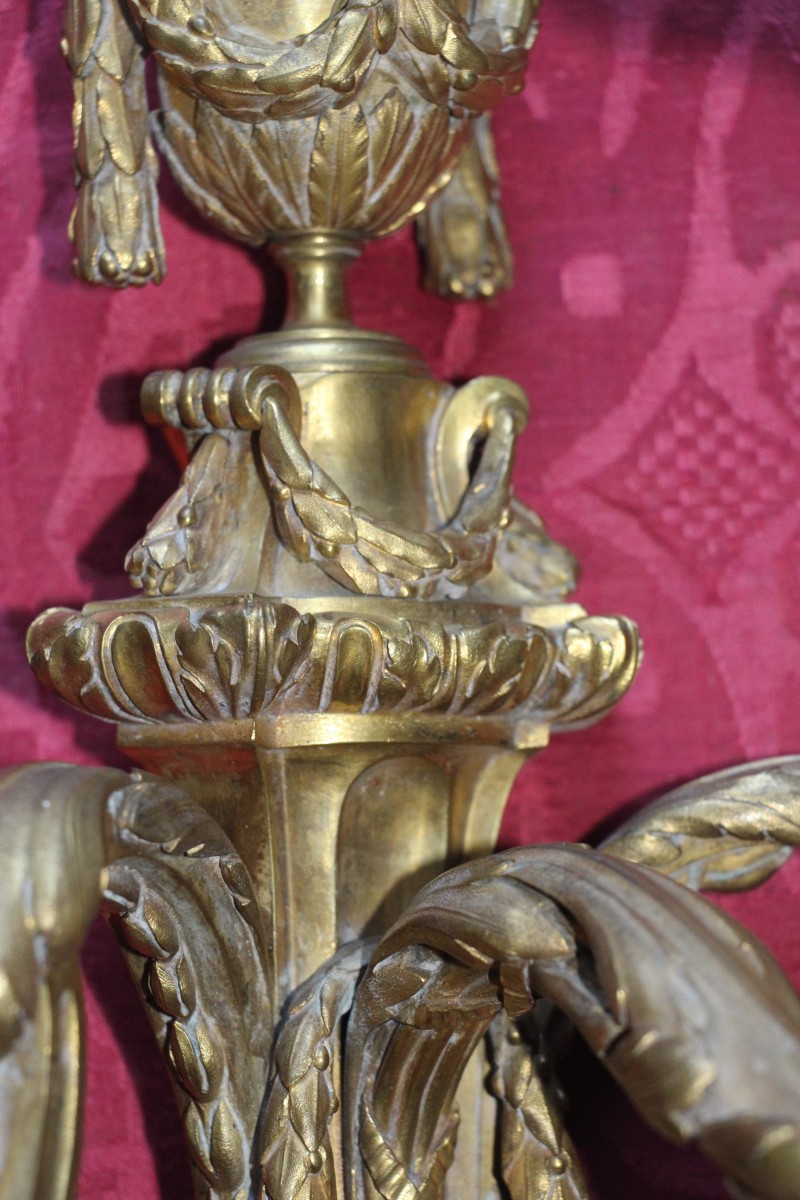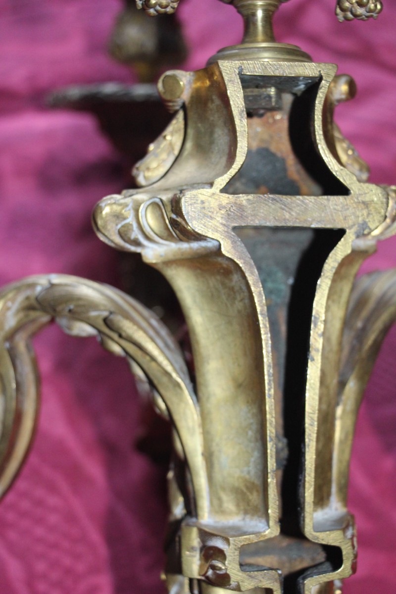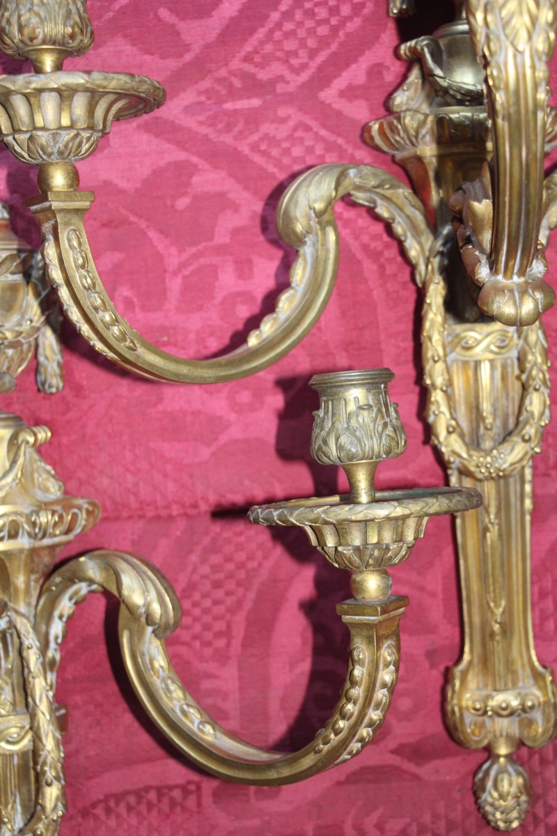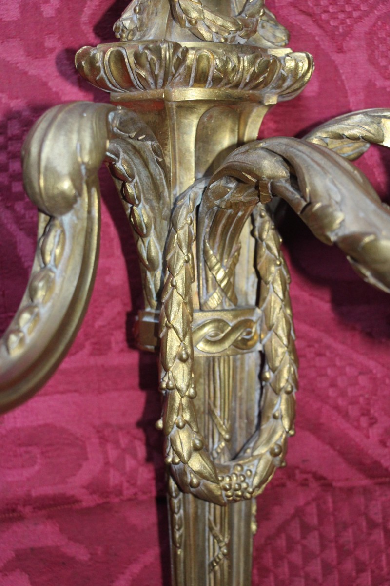 Très belle paire d'appliques en bronze doré à trois bras de lumières,