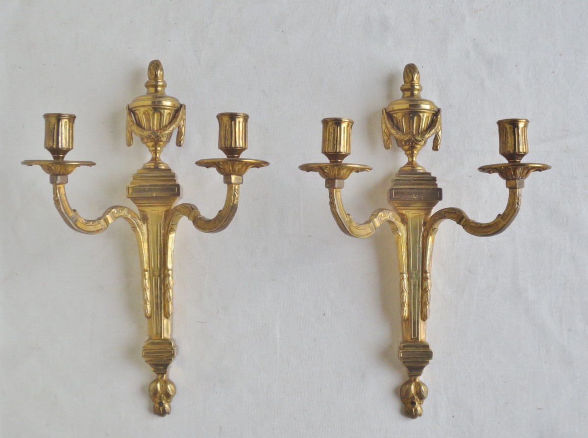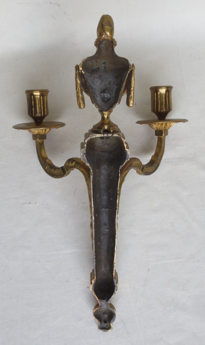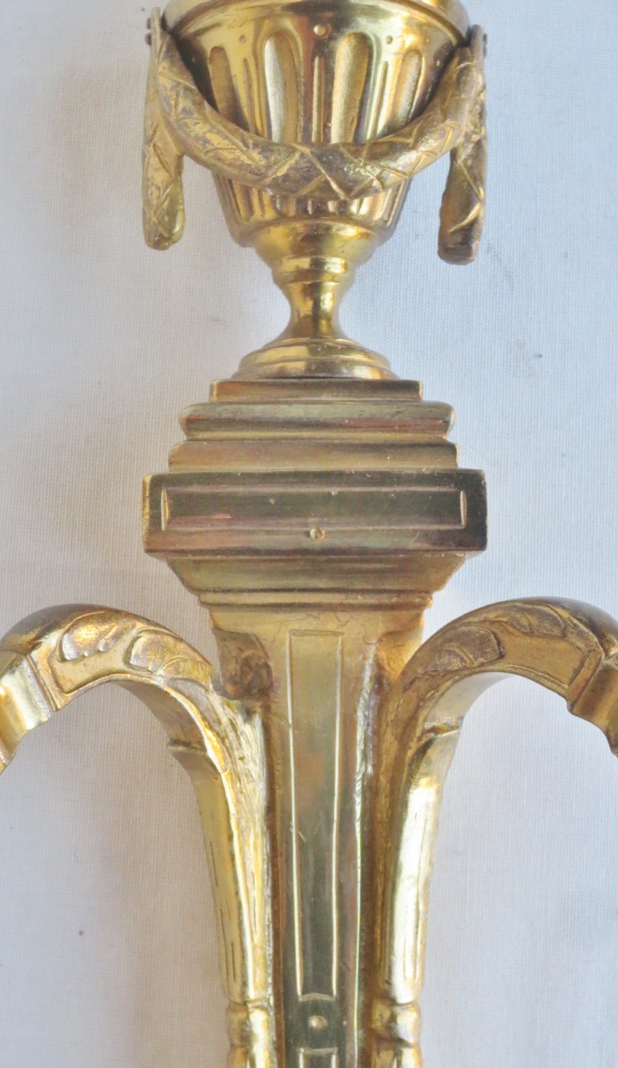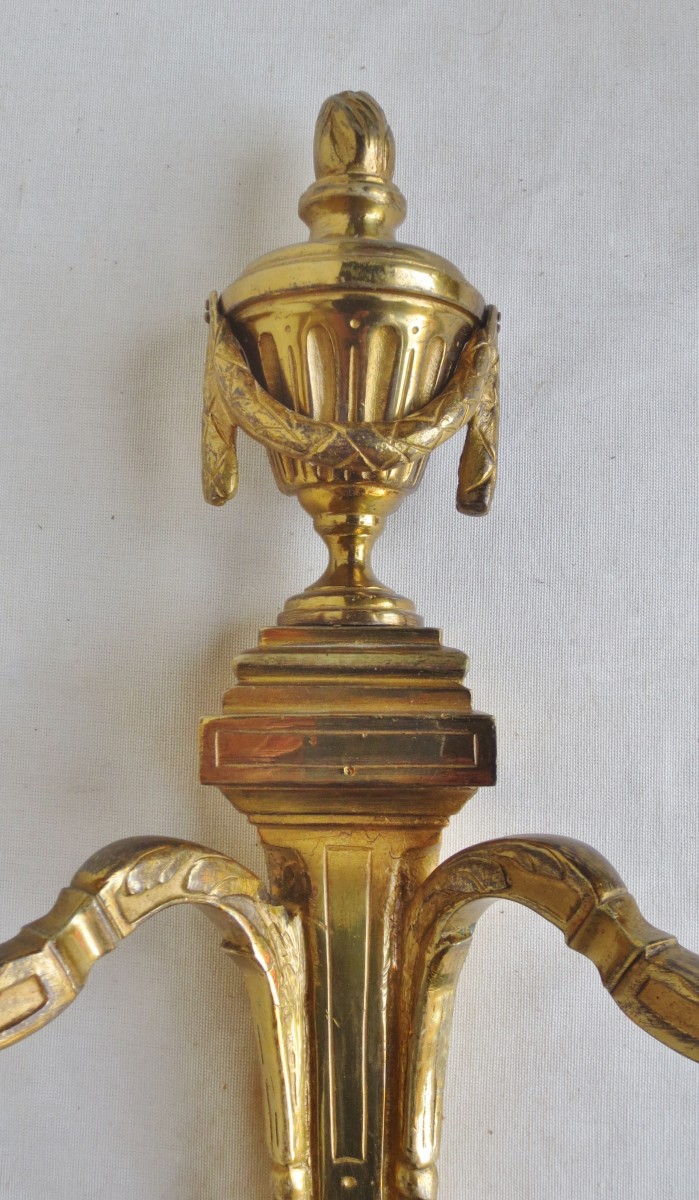 Ces élégantes appliques en bronze doré sont d'époque Louis XVI, elles sont à deux bras de lumière, la partie haute supporte un pot à feu orné d'une guirlande et la partie basse se termine par une graine. L' envers des bobèches sont en forme de pétales et et les binets sont cannelés, le verni doré qui a conservé un très bel éclat est légèrement usé sur les parties saillantes. De tout petits trous ont été percés dans les bobèches entre les pétales pour passer de très fins fils électriques, ils sont quasi invisibles.
