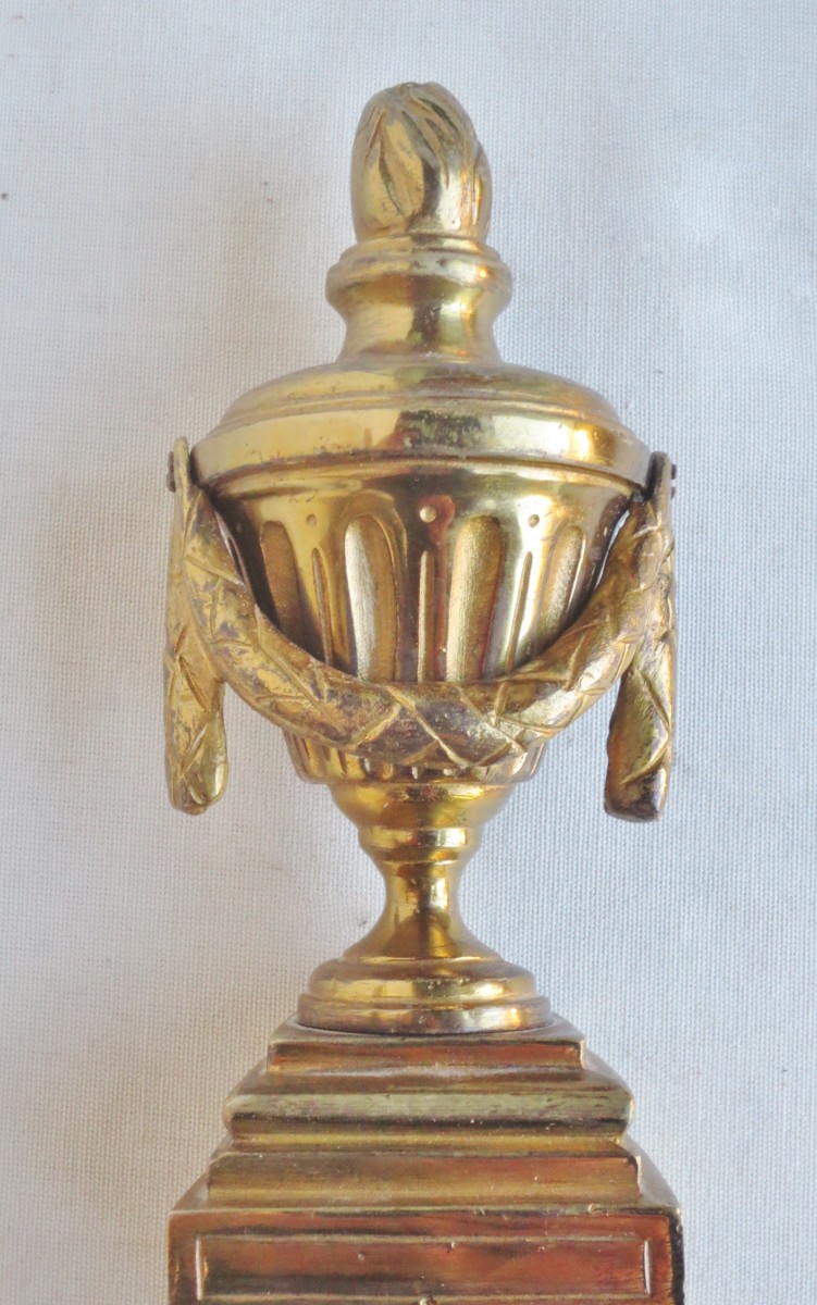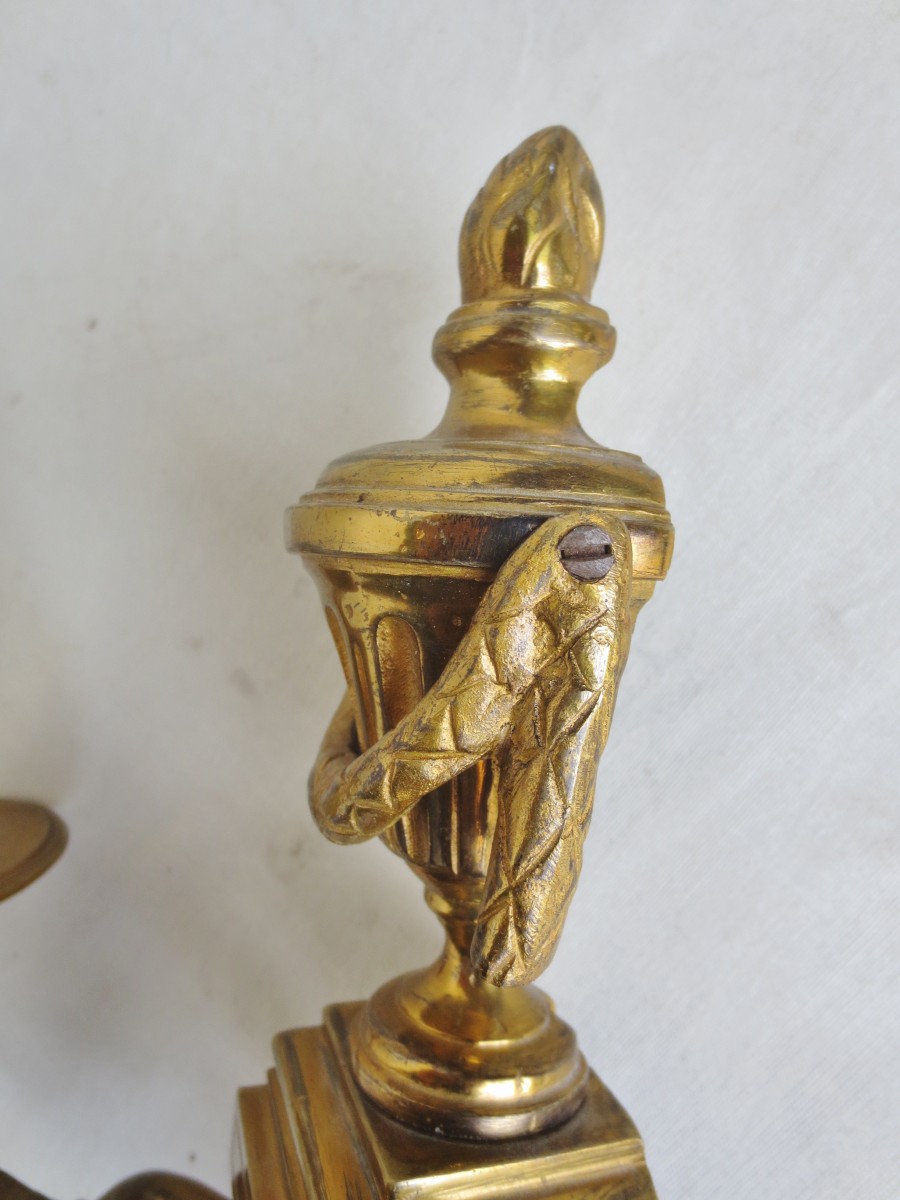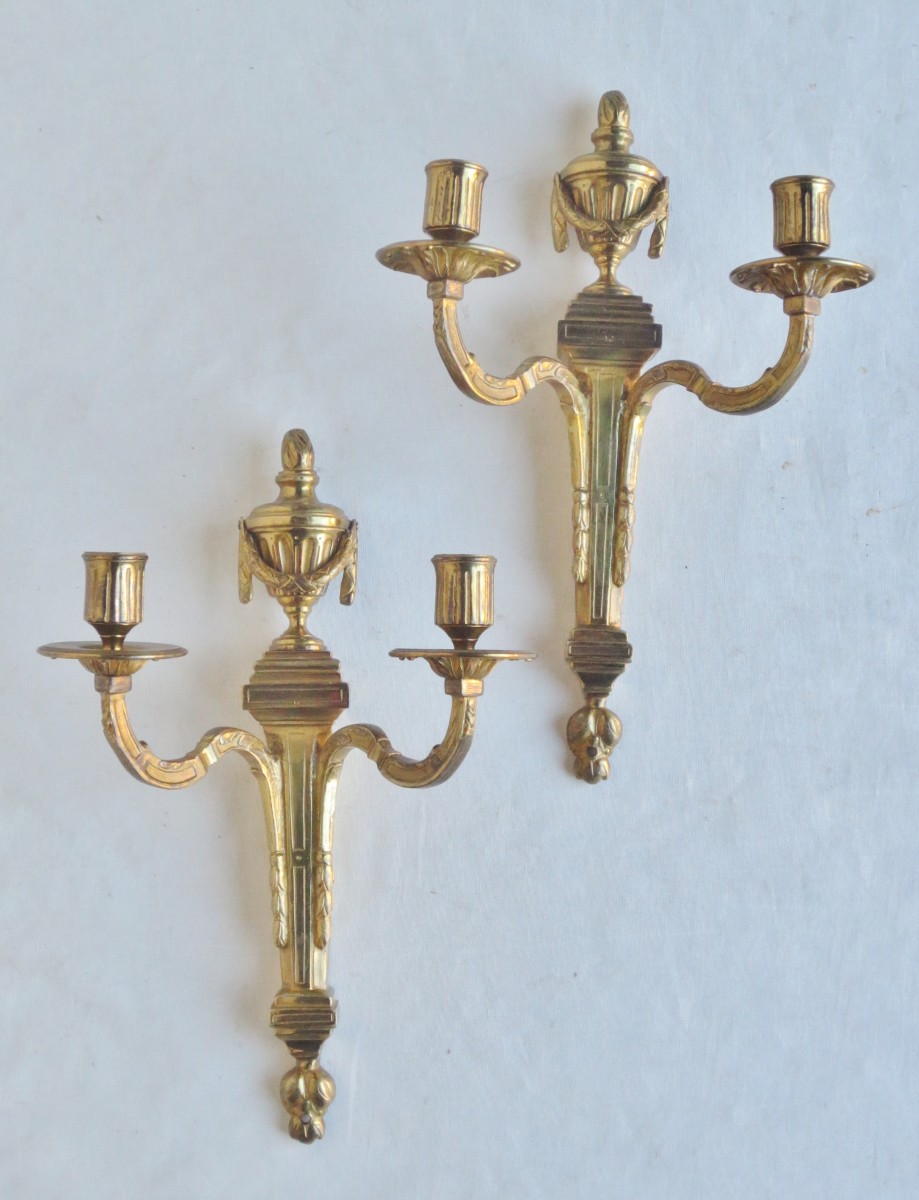 Ces élégantes appliques en bronze doré sont d'époque Louis XVI, elles sont à deux bras de lumière, la partie haute supporte un pot à feu orné d'une guirlande et la partie basse se termine par une graine. L' envers des bobèches sont en forme de pétales et et les binets sont cannelés, le verni doré qui a conservé un très bel éclat est légèrement usé sur les parties saillantes. De tout petits trous ont été percés dans les bobèches entre les pétales pour passer de très fins fils électriques, ils sont quasi invisibles.