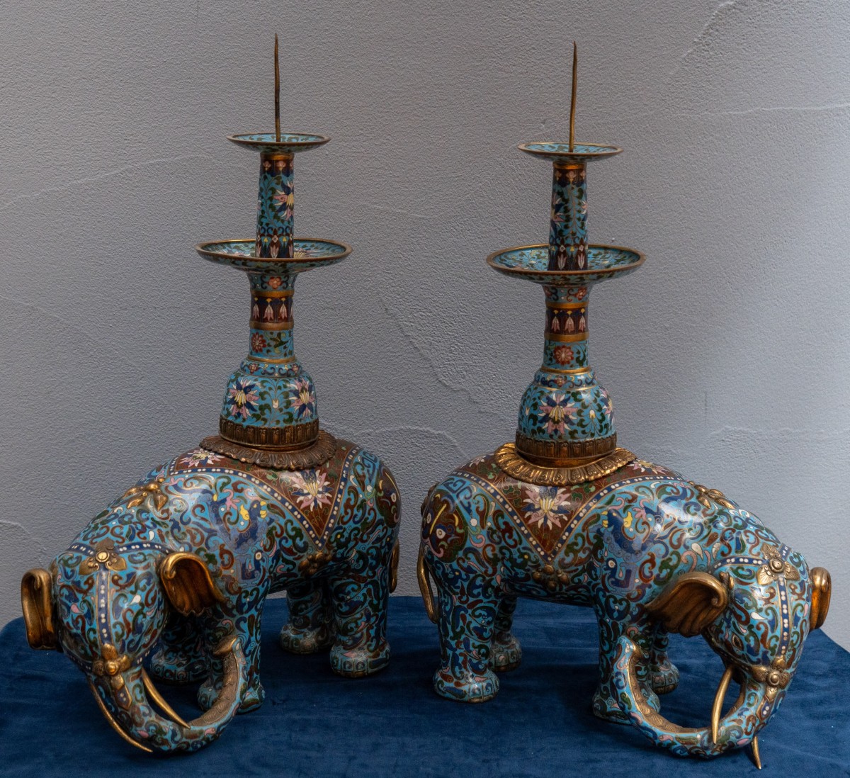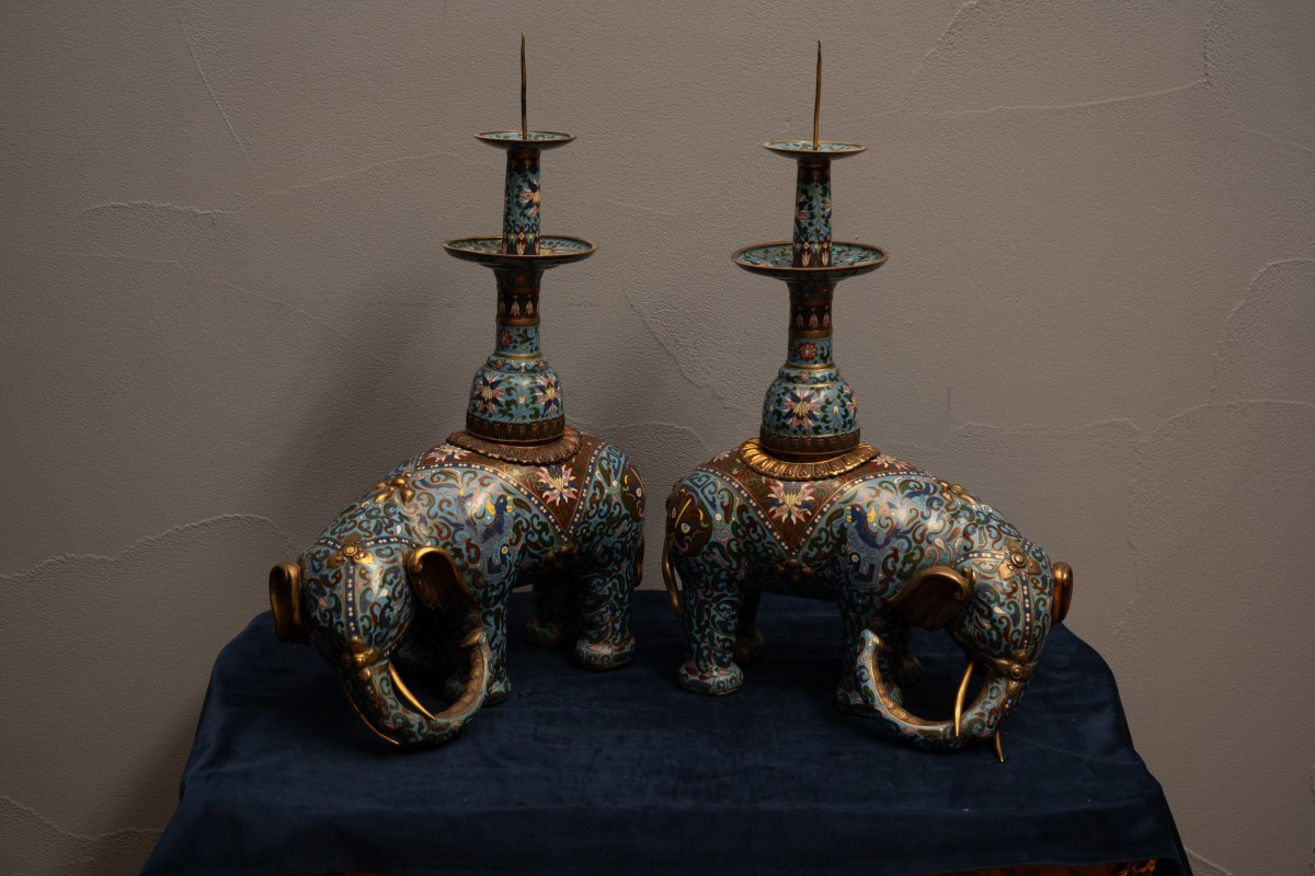 Chaque pièce est modelée en forme d'éléphant agenouillé, la trompe recourbée vers le bas, le corps entièrement travaillé en émail cloisonné sur fond turquoise, orné d'arabesques de lotus et de rinceaux feuillagés en émaux polychromes — bleu marine, aubergine, vert sauge, rose, blanc et jaune —, le caparaçon réservé de médaillons de lotus sur fond bleu foncé. Les détails en bronze doré sont omniprésents : défenses coulées, pointes des oreilles et de la trompe ciselées, et un col feuillagé en repoussé séparant l'éléphant de la tige de bougeoir amovible. La tige élancée, de forme étranglée, émaillée en suite avec des motifs de lotus et de nuages, présente deux plateaux étagés pour recueillir les gouttes de cire et se termine par une pointe en fer pour la fixation de la bougie. Les tiges sont d'origine.