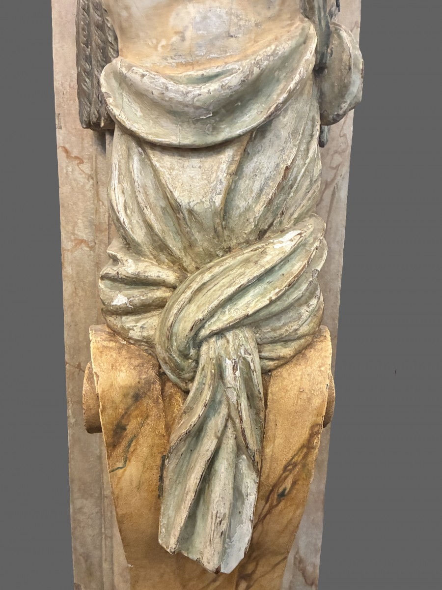 Importante paire d'anges en bois sculpté et polychromé, formant gaines en bois peint à l'imitation du marbre.