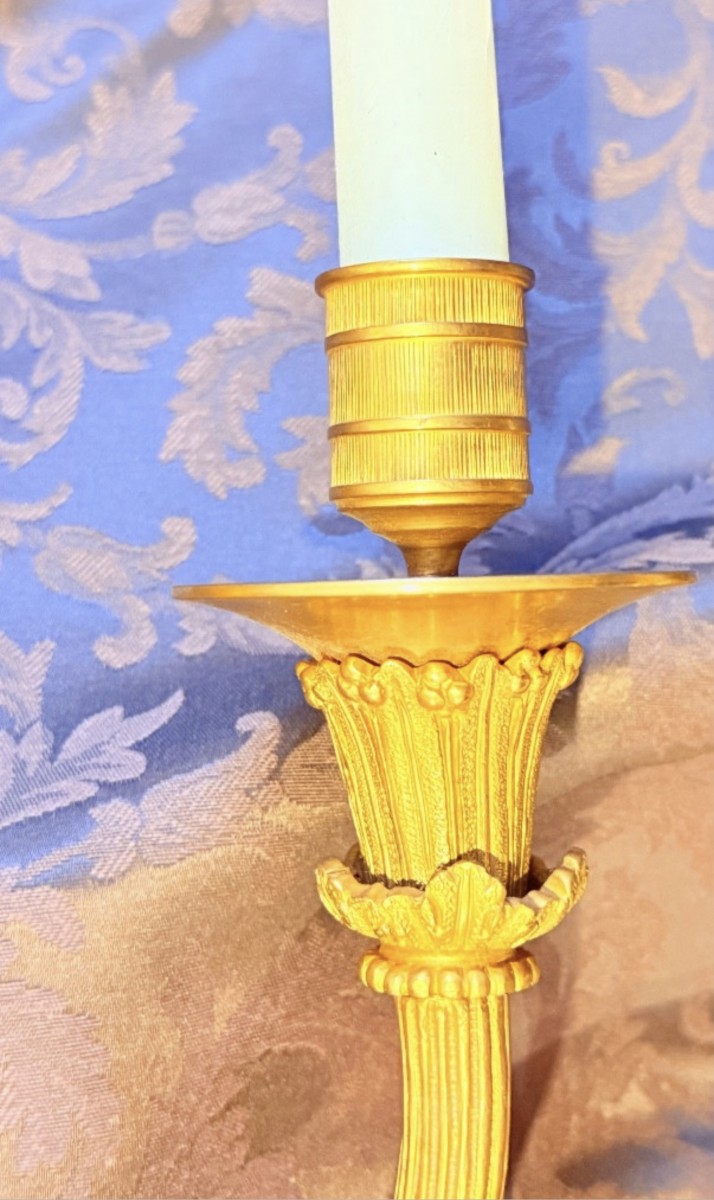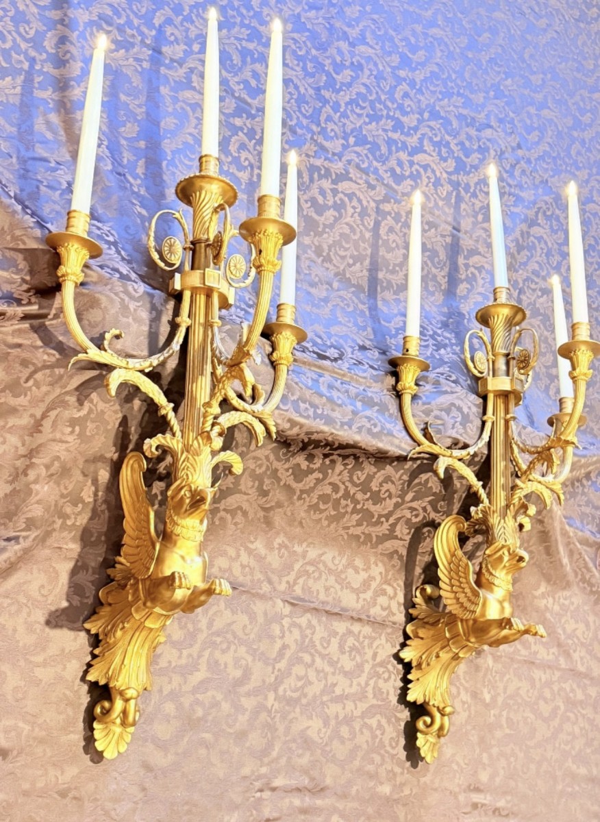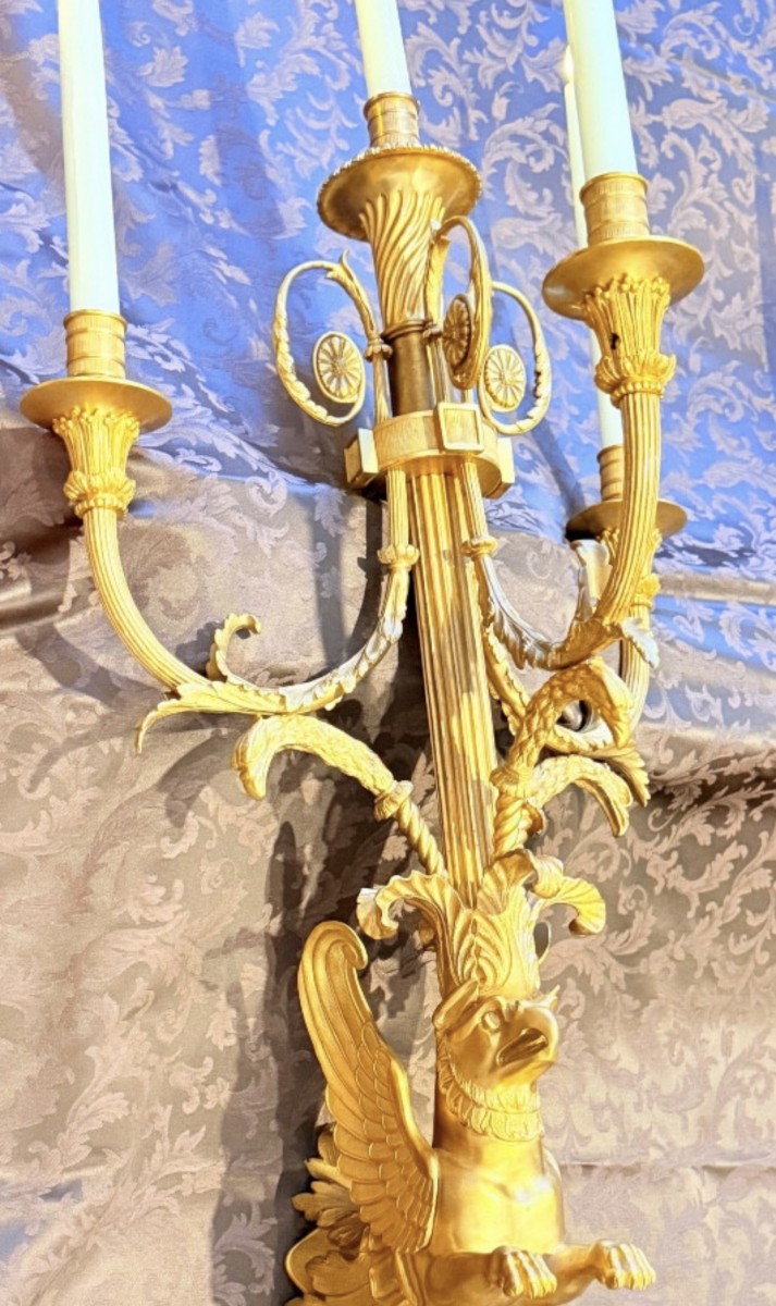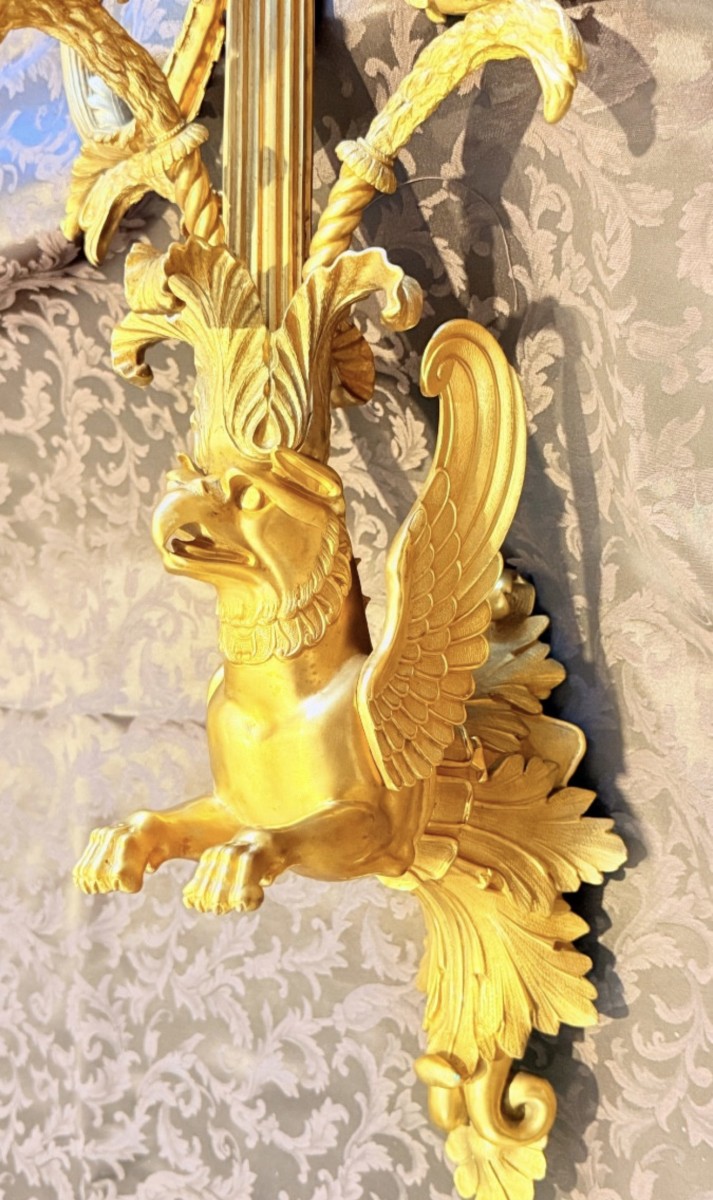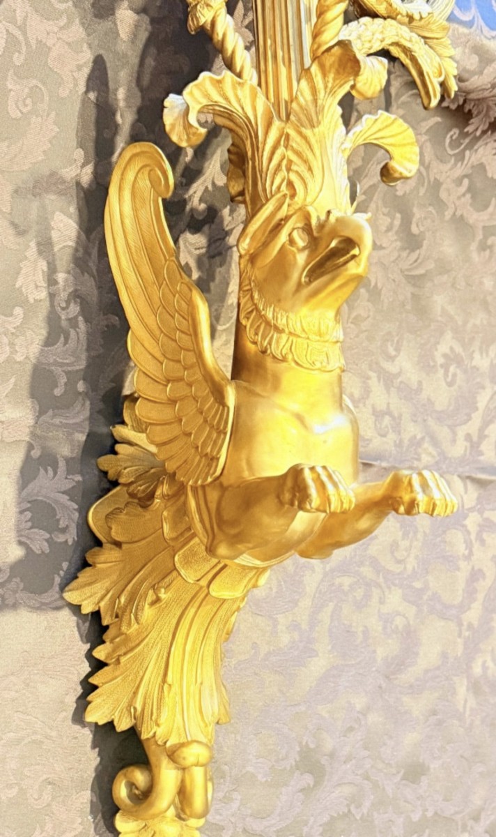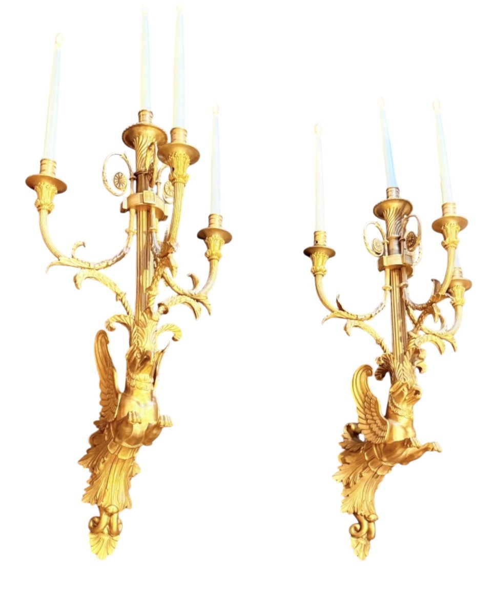 Exceptionnelle et Très Grande Paire d´Appliques en Bronze Doré aux Griffons ailés , à 4 Feux .