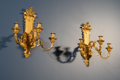 Cette charmante paire d’appliques en bronze doré a été fabriquée en France vers la fin du XIXe siècle dans le style Régence. Finement ciselés, ils se composent d’une partie centrale avec une frise lambrisses ornée d’éléments feuillus, de volutes et d’éléments phytomorphes qui retombent sur les côtés. Au centre se trouve une tête meulière avec une chevelure ornée de perles et encadrée de volutes et de deux grandes feuilles. Dans la partie inférieure, d’un anneau «baccellate», descendent enfermées en grappes quelques feuilles d’acanthe. Au-dessus de la tête féminine se trouvent trois bras ondulés sur lesquels se greffent des figures anthropomorphes et d’où proviennent les bobèches importées richement ciselées avec des ornements végétaux et des motifs géométriques. La dorure est faite d’or mat et d’or brillant, fini avec de la pierre d’agate.