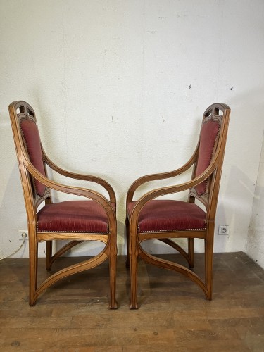 Retrouver le mobilier ou les objets d''art similaires à « Paire de fauteuils Art nouveau en frêne, 'École de Nancy » présenté par Galerie Vaudemont, antiquaire à Nancy dans la catégorie Fauteuil & Bergère Art nouveau, Sièges.