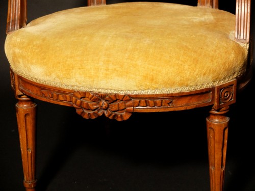 Paire de fauteuils en bois de noyer reposant sur 4 pieds Louis XVI cannelés, rudentés et se terminant par des cercles sculptés dans les dés de raccordements aux ceintures. Le piètement inclus dans la ceinture de forme circulaire, ne présente pas d'angle contrairement à la plupart des sièges de cette époque.