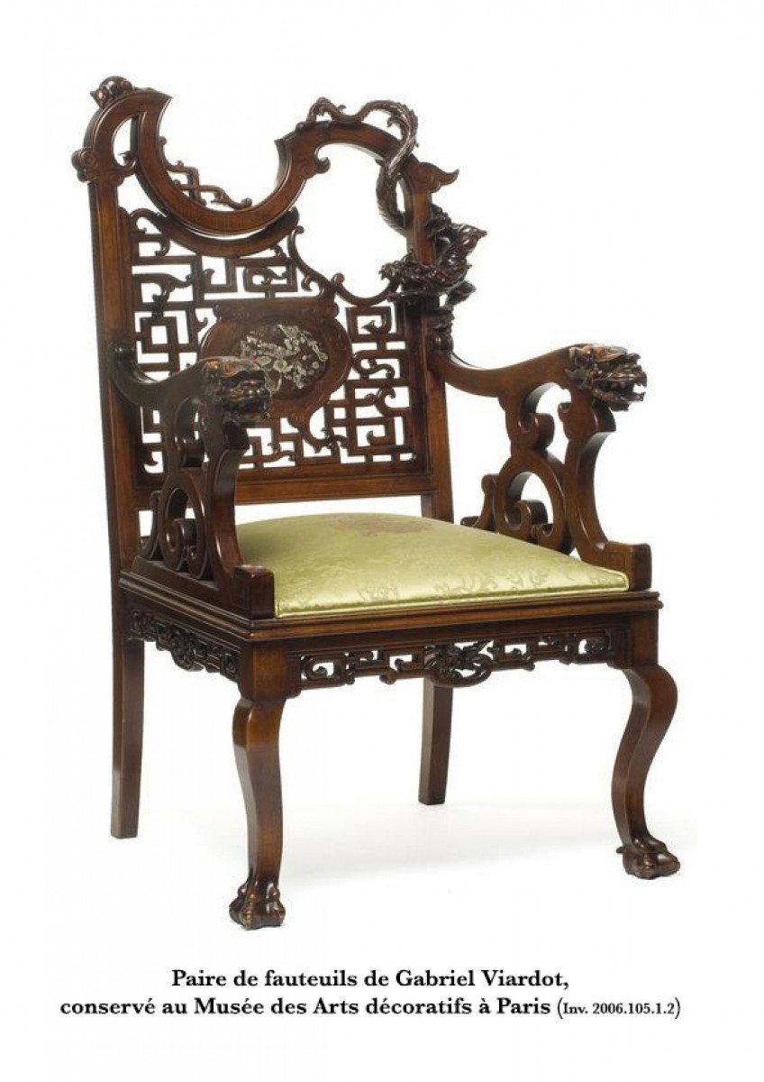 Ces fauteuils en aulne teinté sont à rapprocher d’une paire de fauteuils de Gabriel Viardot, conservé au Musée des Arts décoratifs à Paris (Inv. 2006.105.1.2). Ils présentent la même conception asymétrique du siège et une égale qualité de sculpture avec notamment son dragon s’enroulant sur le dossier.