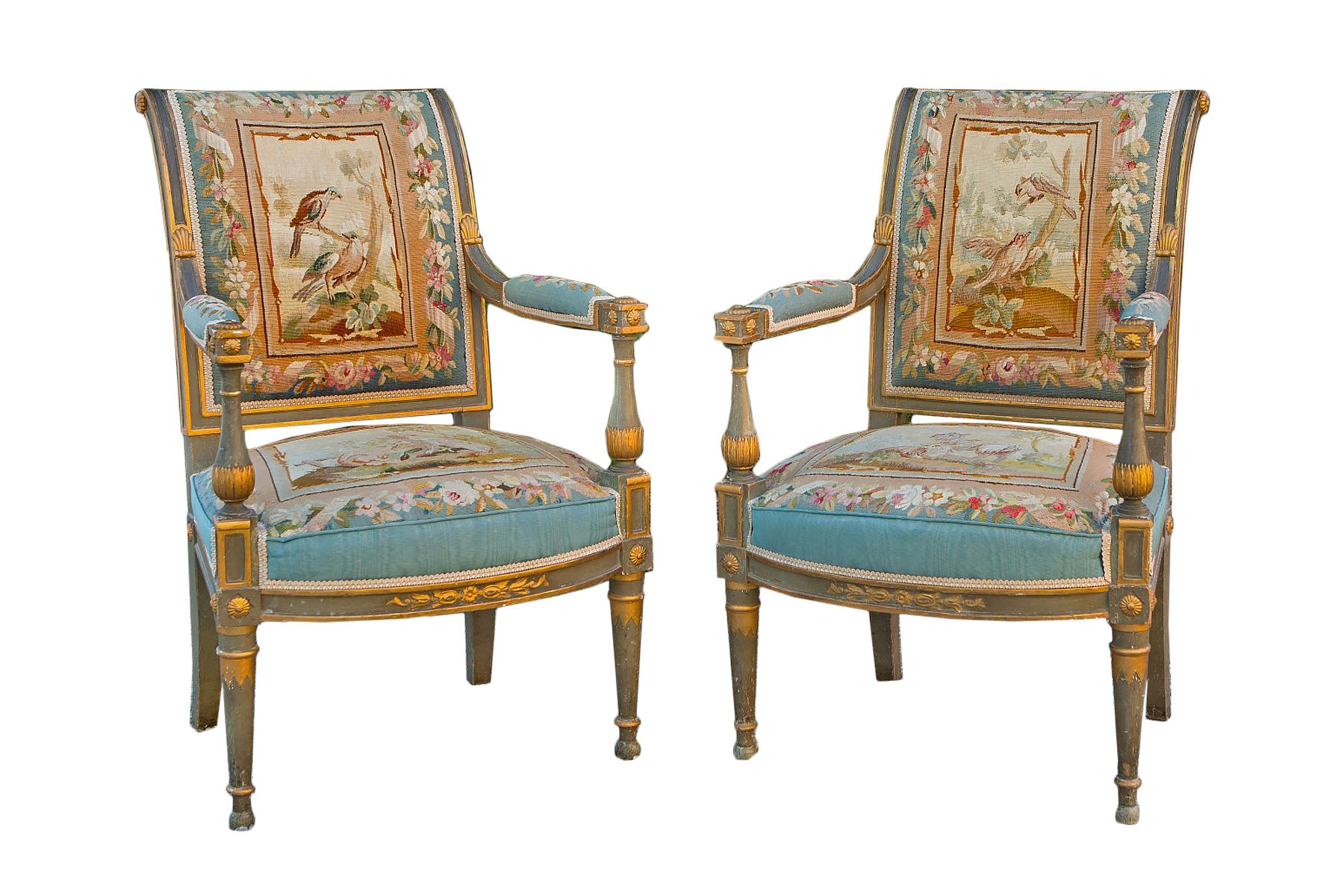 Retrouver le mobilier ou les objets d''art similaires à « Paire de fauteuils laqués » présenté par Frédéric Brossy, antiquaire à Rolle dans la catégorie Fauteuil & Bergère Directoire, Sièges.