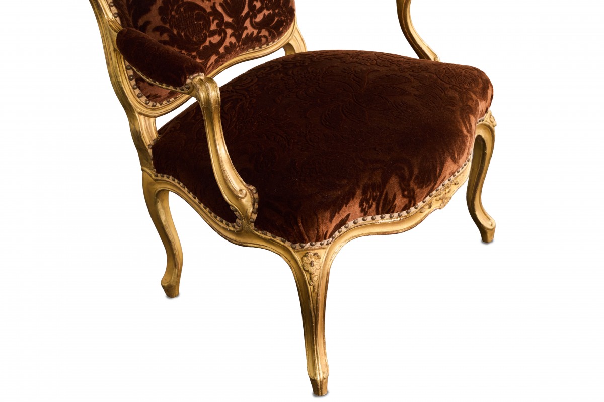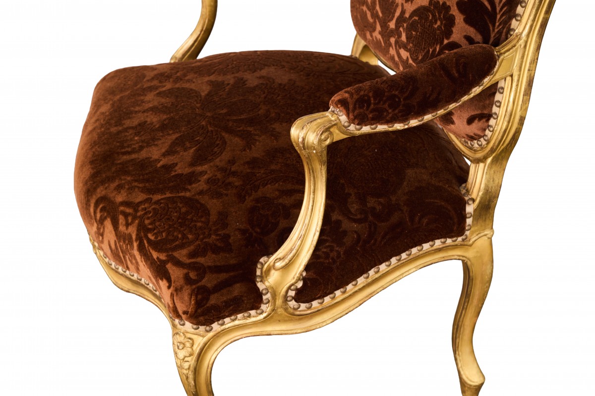 Les fauteuils à dossier cabriolet se présentent par de gracieuses lignes mouvementées. Ils reposent sur quatre pieds cambrés sculptés de fleurs en chute . La ceinture, finement travaillée, se déploie en courbes et arbore au centre un fin travail représentant une association de deux fleurs et de feuillage.