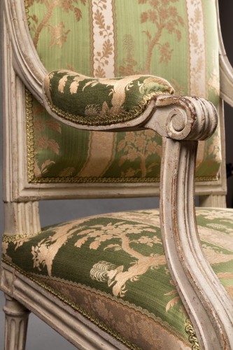 Rarissime paire de fauteuils à dossier plat, dit à la reine, en bois de hêtre laqué gris Trianon.