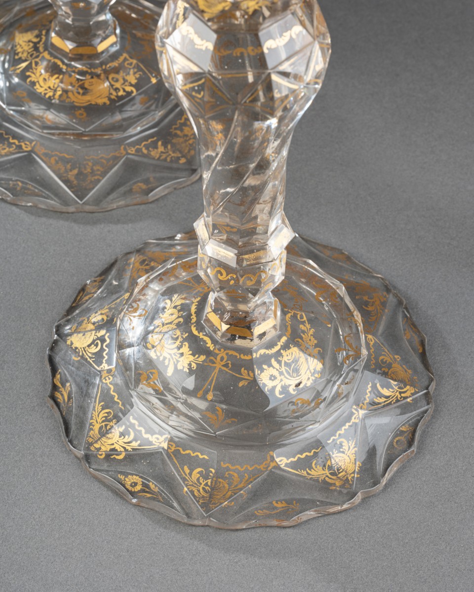 Rare paire de flambeaux en cristal finement taillé à décor géométrique, reposant sur une base à pans coupés et facettes rayonnantes, surmontée d’un fût balustre à pans alternés et d’un binet gravé et rehaussé d’or.
