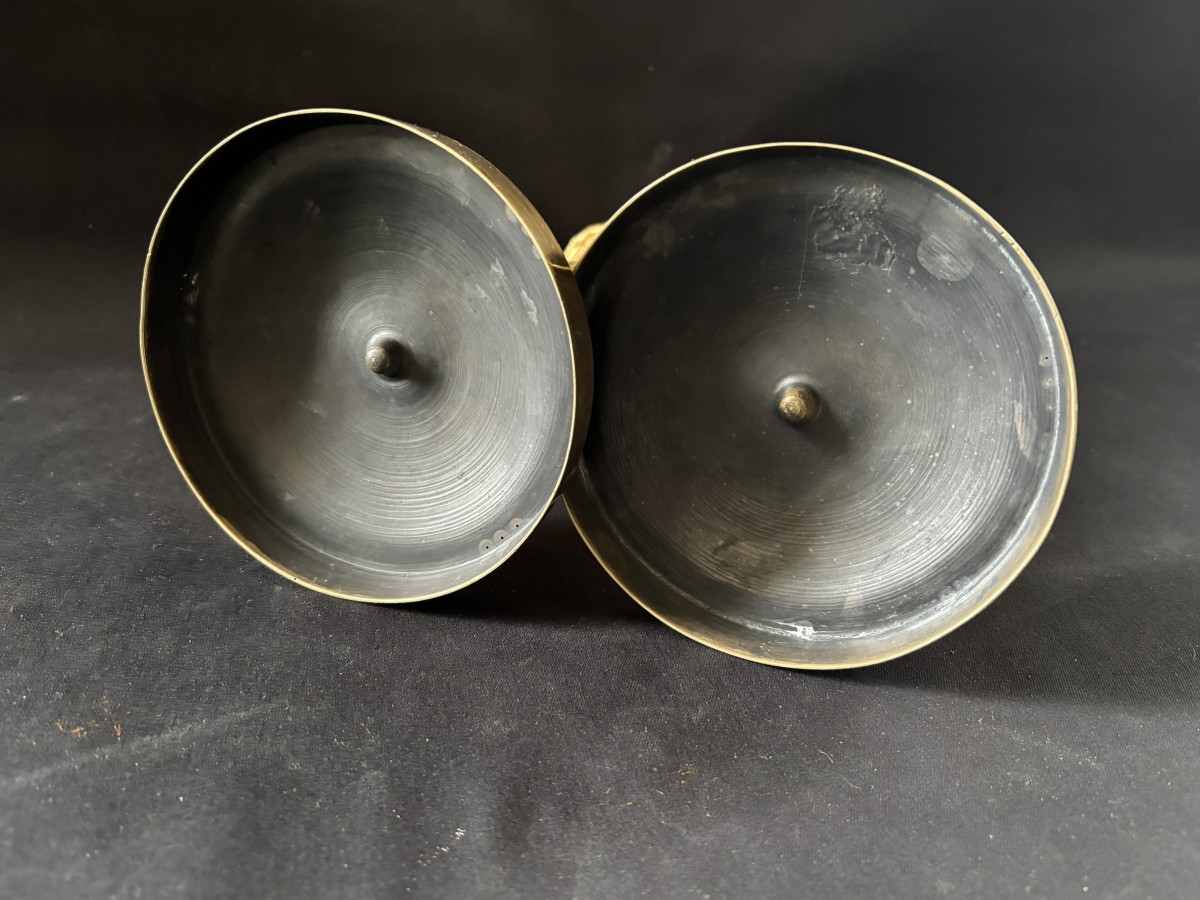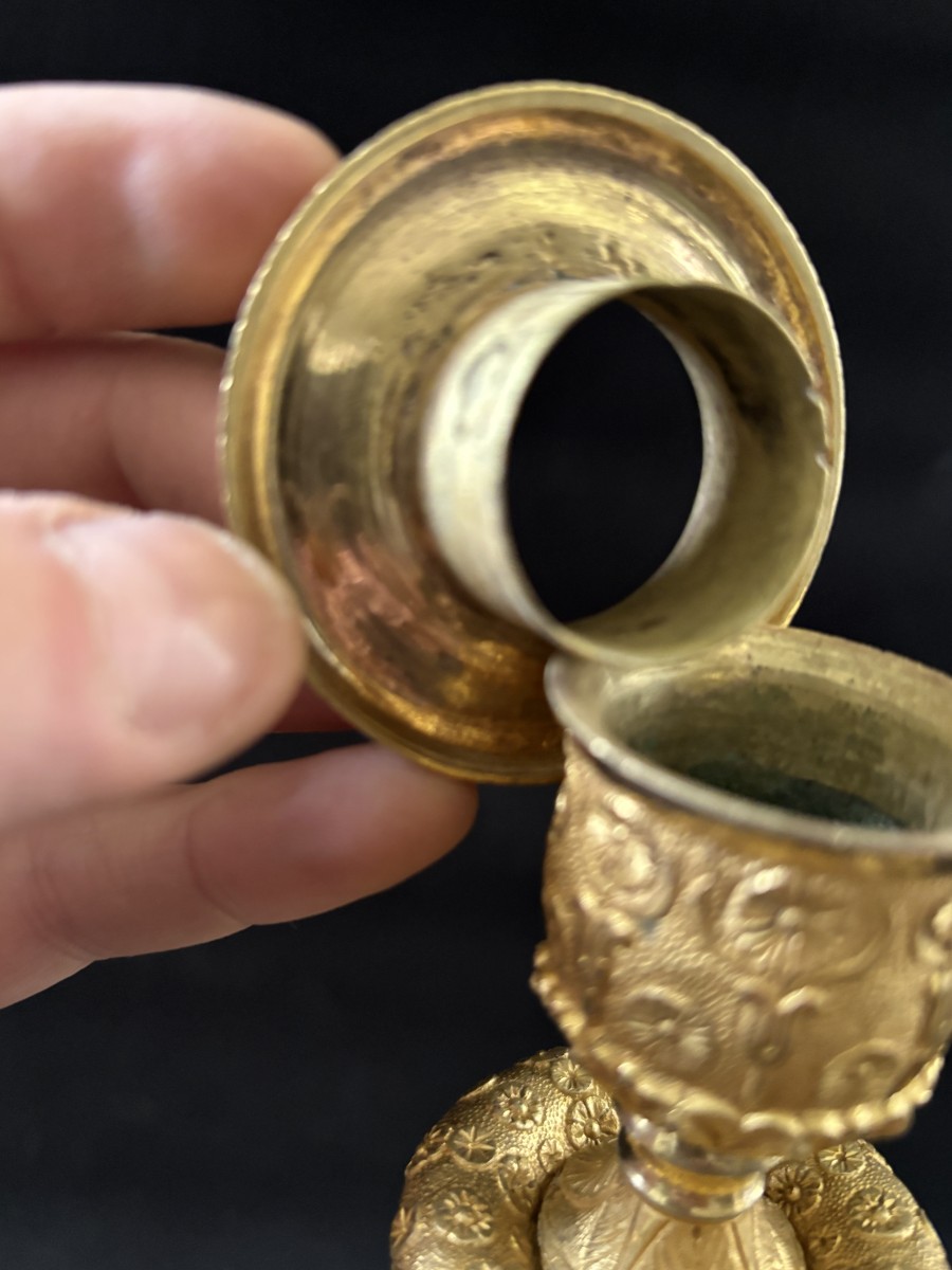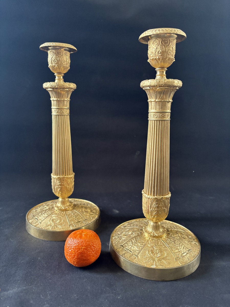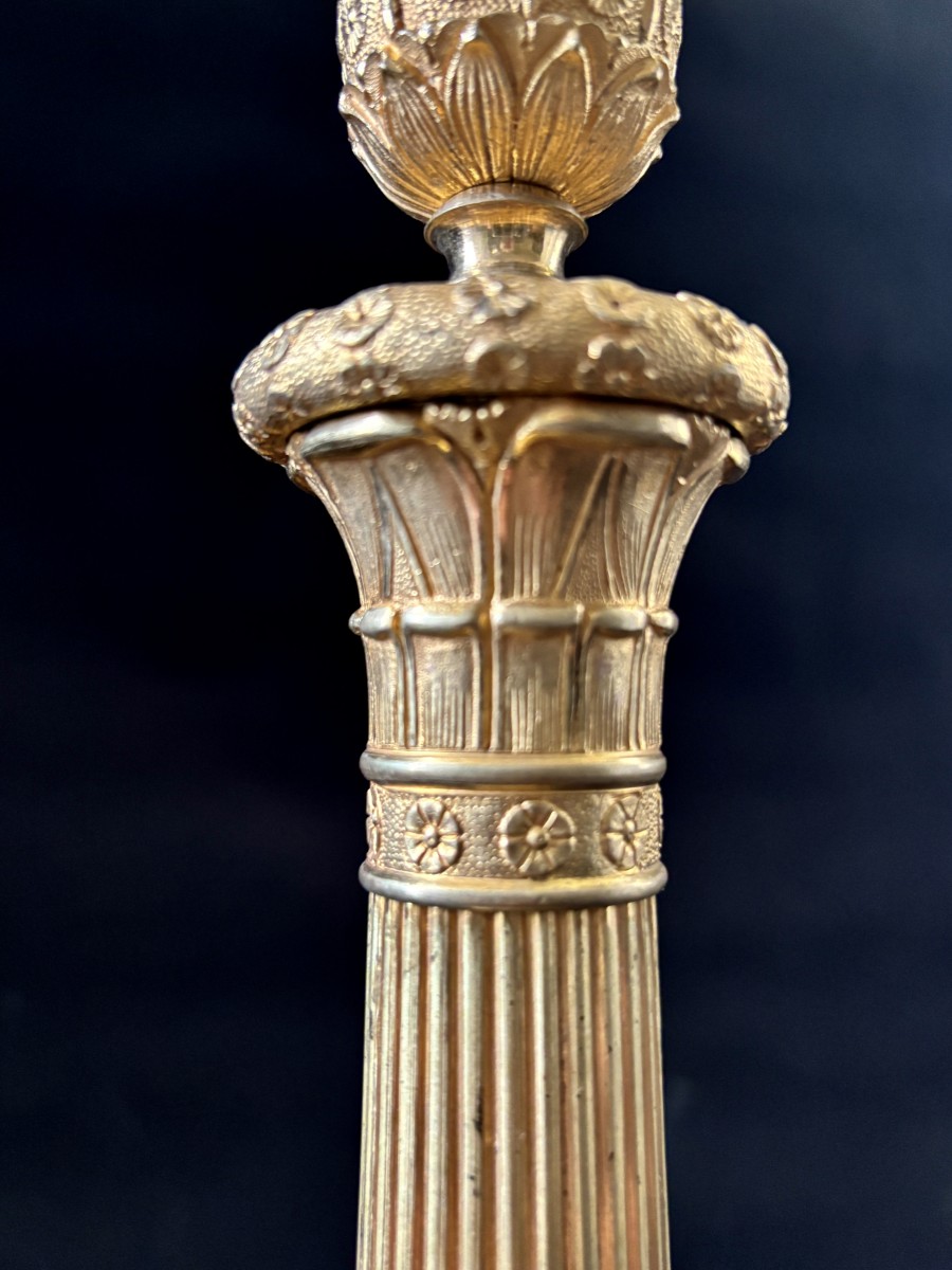 Retrouver le mobilier ou les objets d''art similaires à « Paire de flambeaux Empire en bronze doré » présenté par Jullion Antiquités, antiquaire à Port d'envaux dans la catégorie Bougeoirs et Chandeliers Empire, Luminaires.
