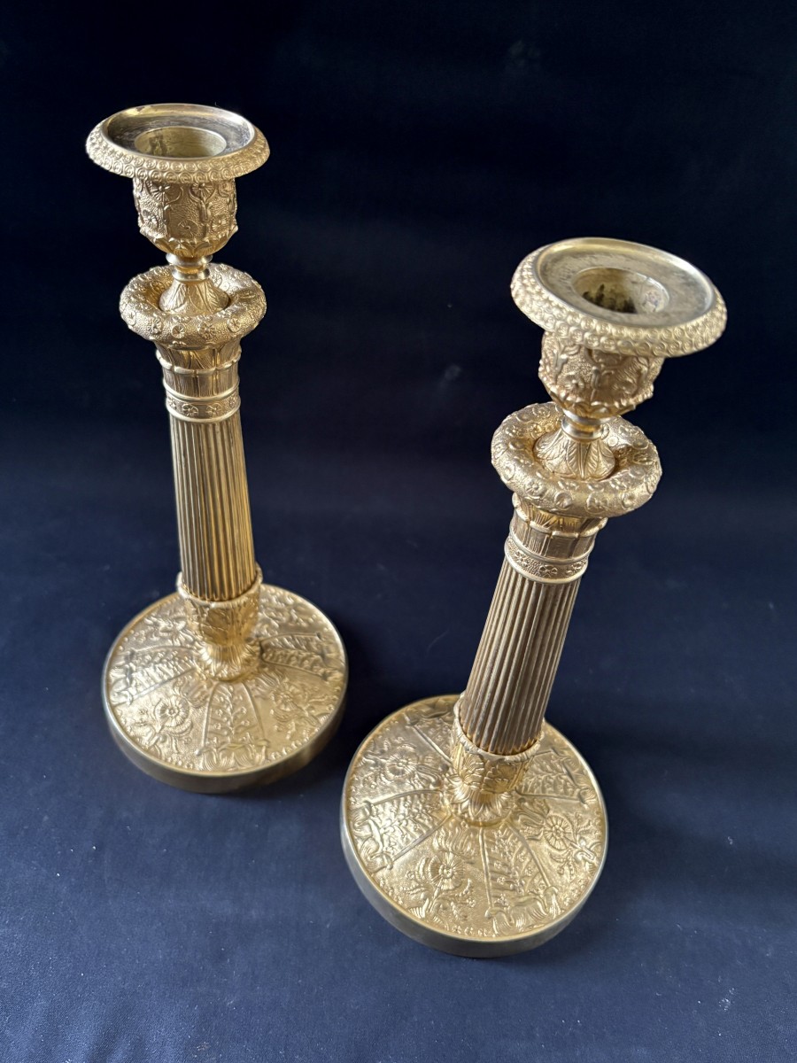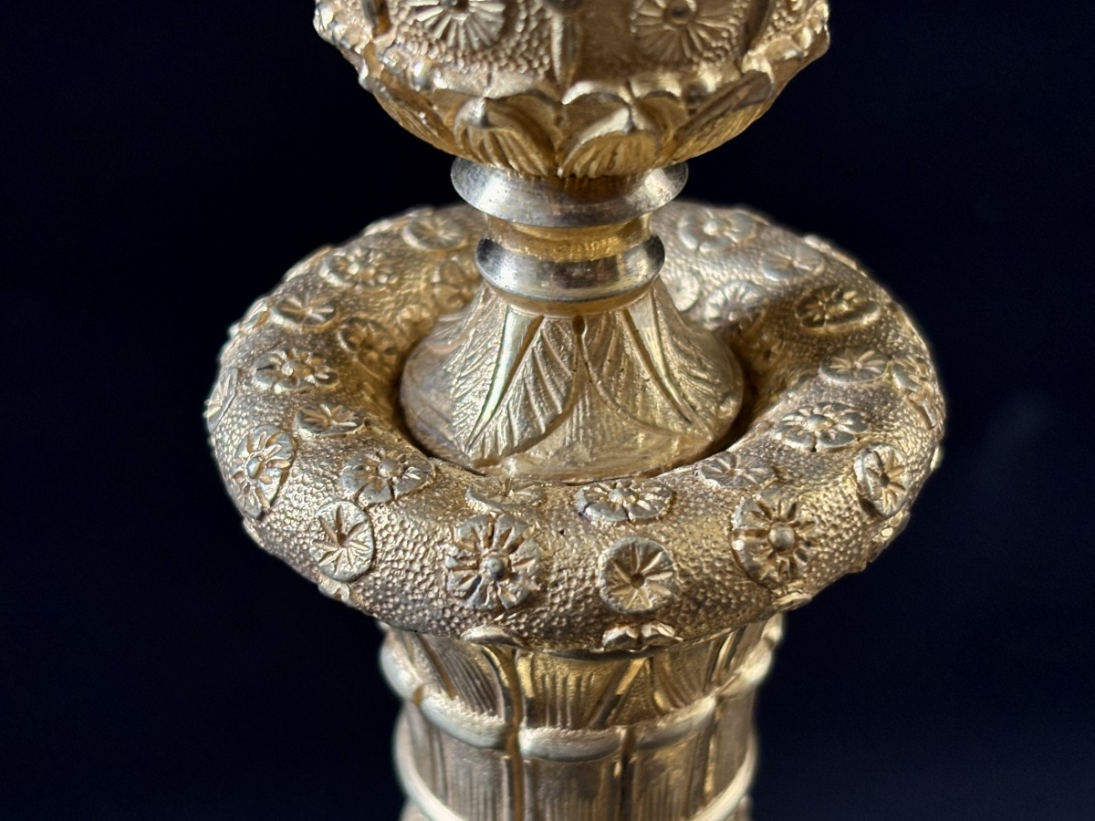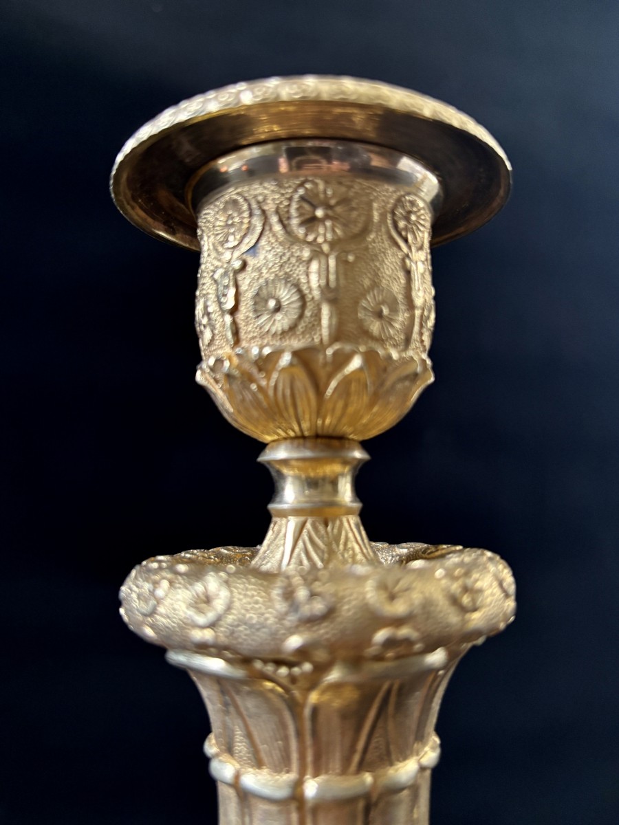 Paire de grands flambeaux en bronze ciselé et doré à deux tons de dorure