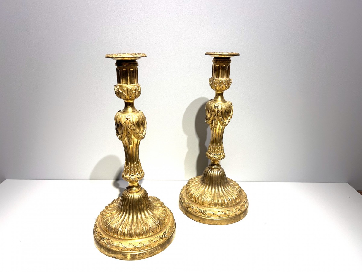 Paire de grands flambeaux en bronze finement ciselé et doré, avec leur binet. Dorure d'origine, présentant de légères usures. Travail parisien circa 1780-1790.