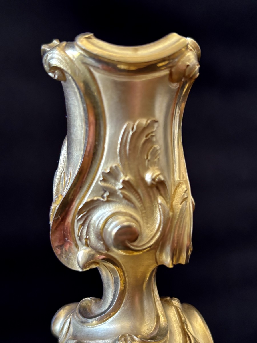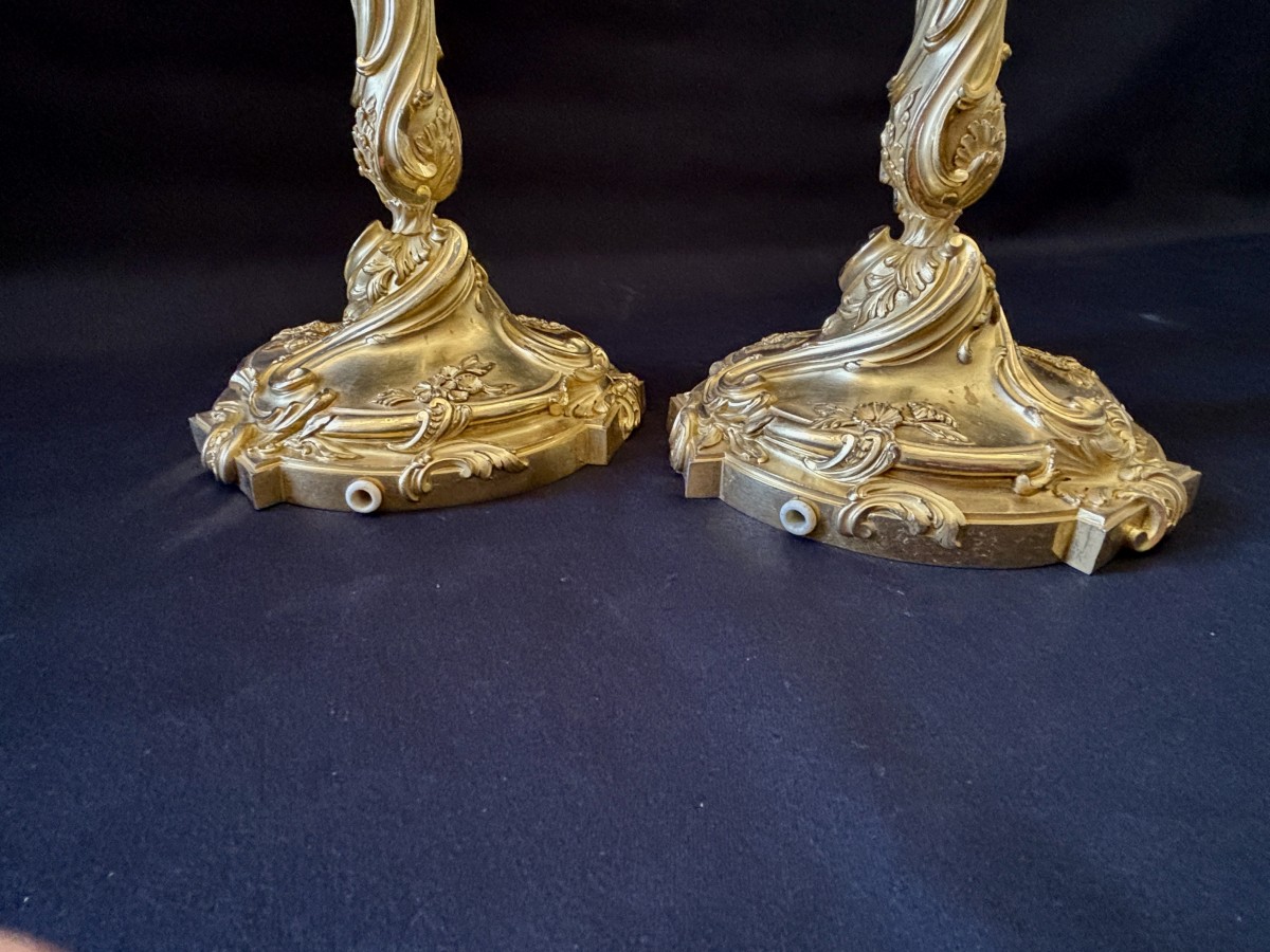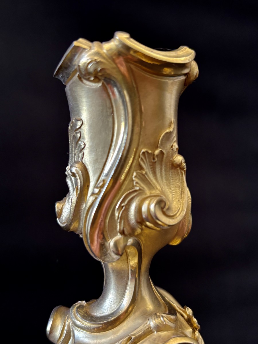 Paire de grands bougeoirs à décor rocaille en bronze finement ciselé et doré à deux tons de dorure.