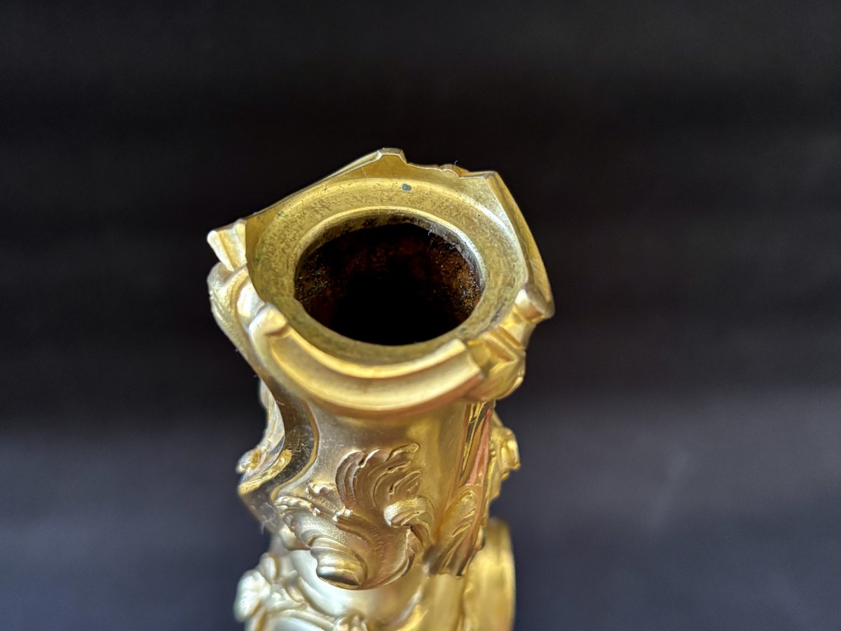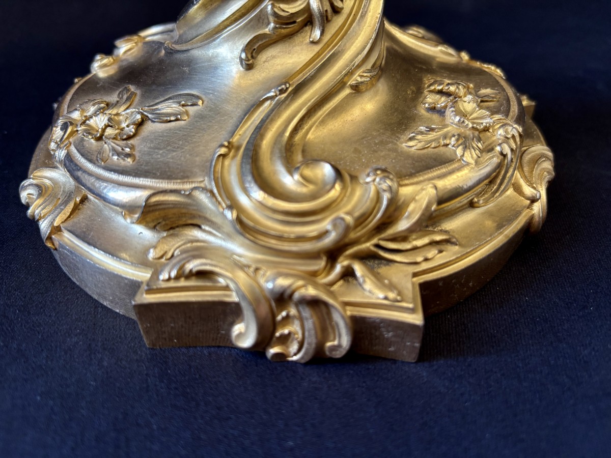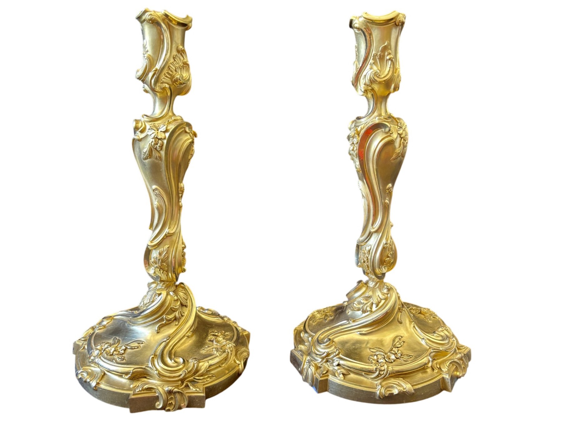 Paire de grands bougeoirs à décor rocaille en bronze finement ciselé et doré à deux tons de dorure.