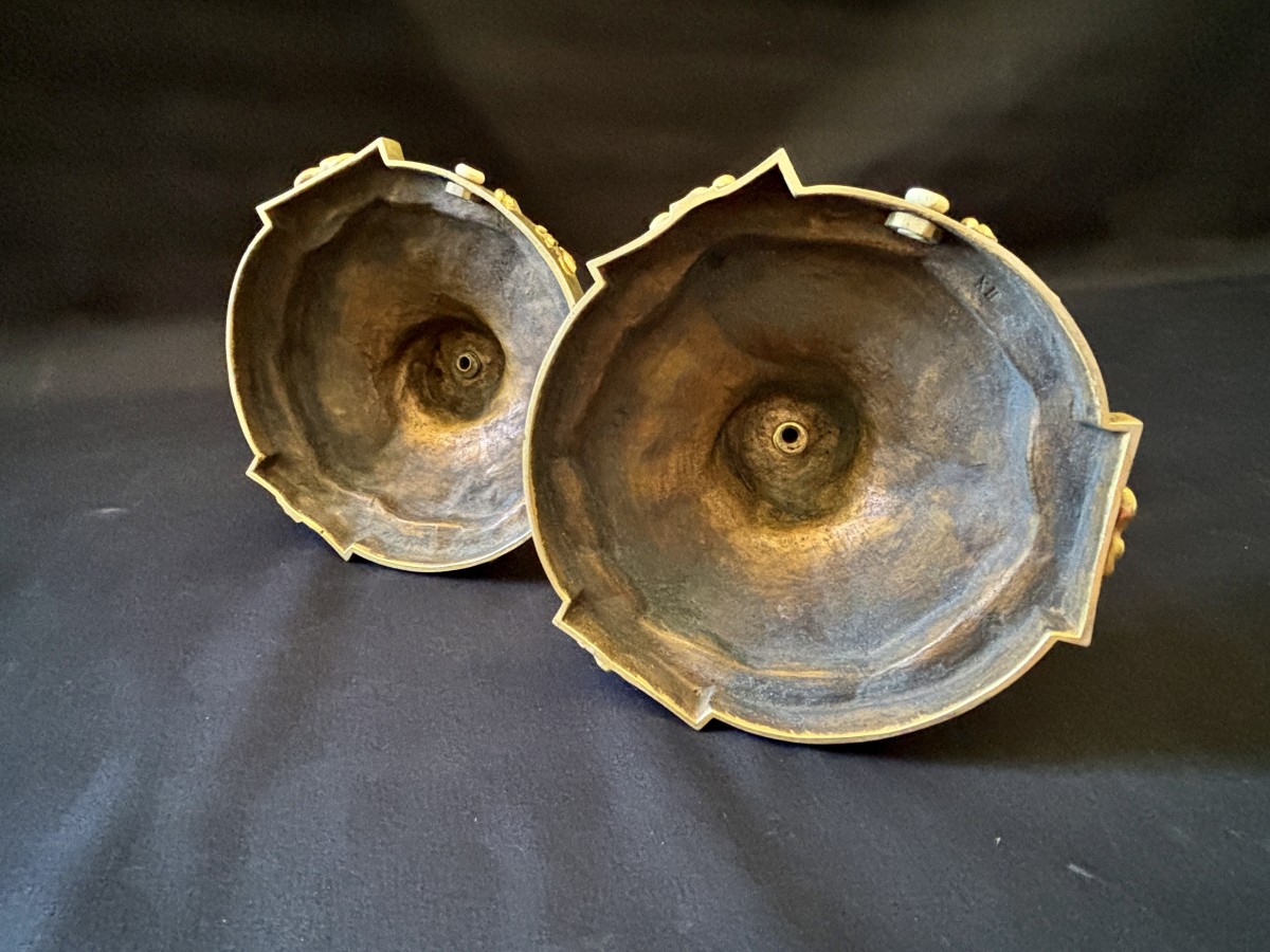 Retrouver le mobilier ou les objets d''art similaires à « Paire de flambeaux en bronze doré fin 19e d'après un dessin de Meissonnier » présenté par Jullion Antiquités, antiquaire à Port d'envaux dans la catégorie Bougeoirs et Chandeliers Napoléon III, Luminaires.