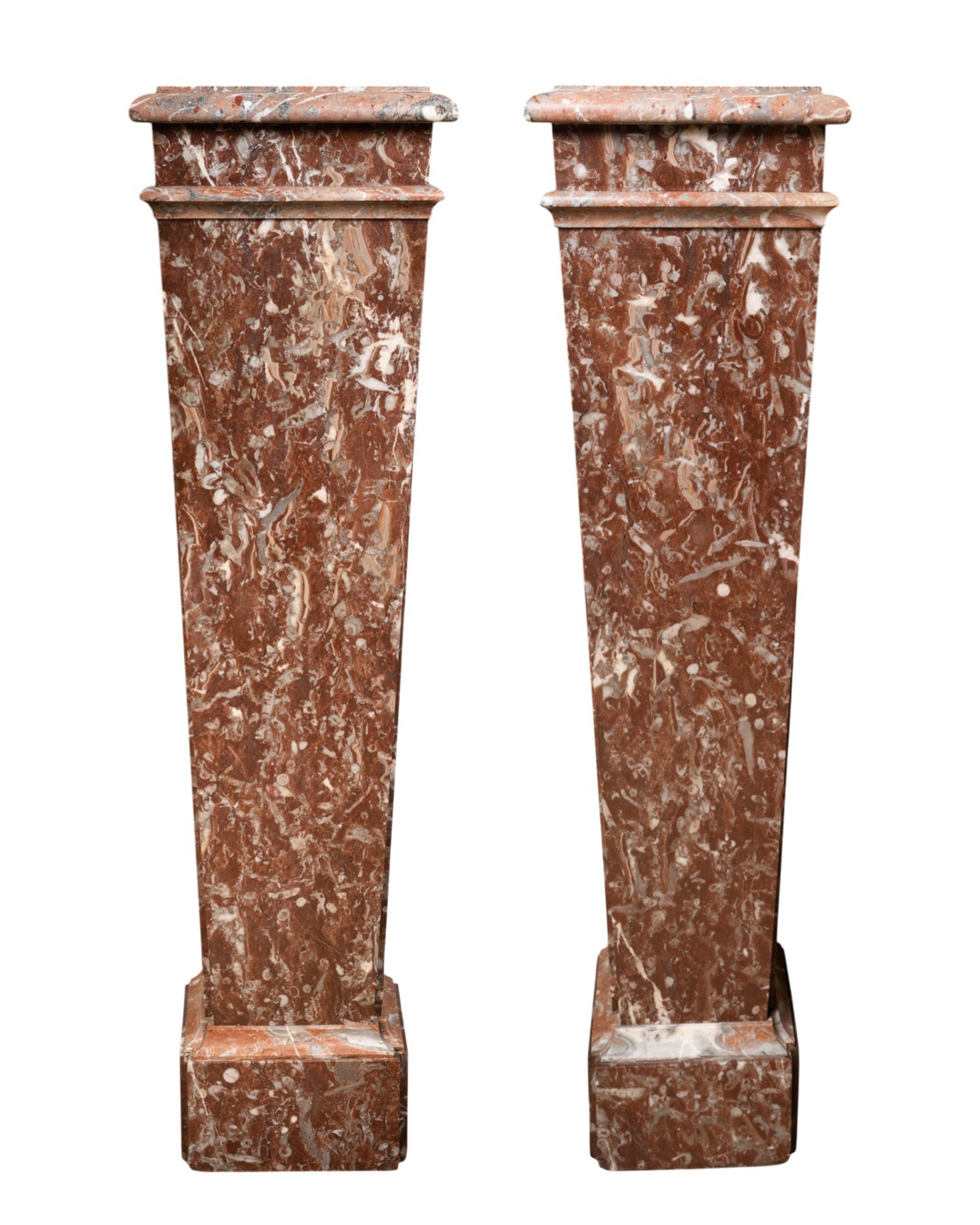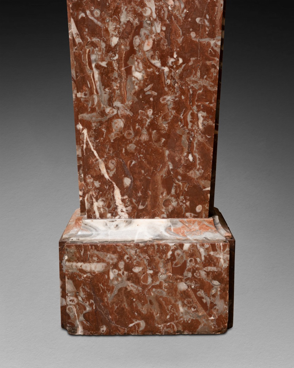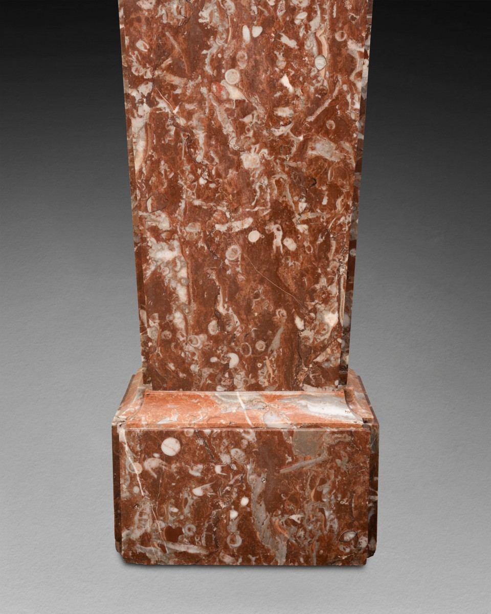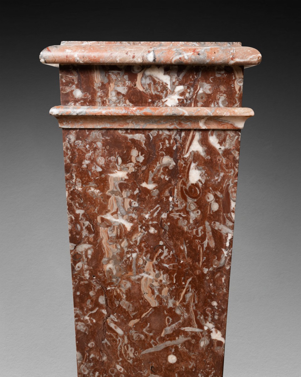 Paire de gaines de forme trapézoïdale en marbre "Rouge de Rance" pour le corps de la gaine et "Rouge de Caunes" pour la tablette supérieure et la moulure.