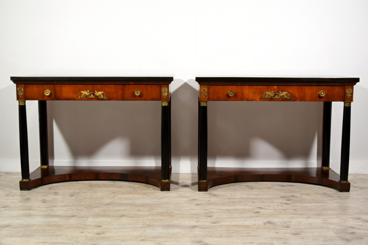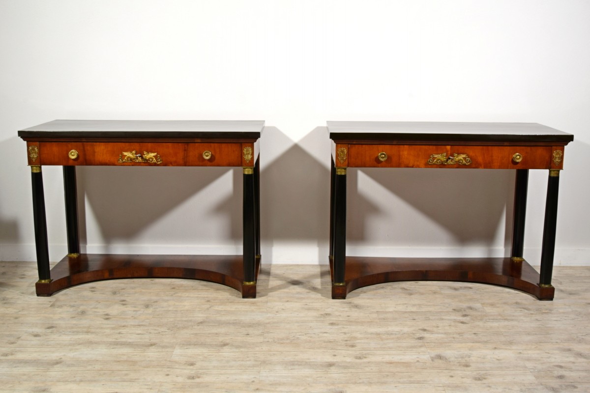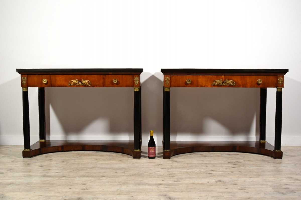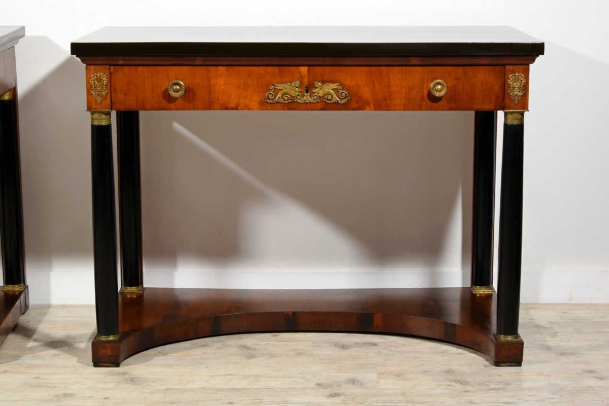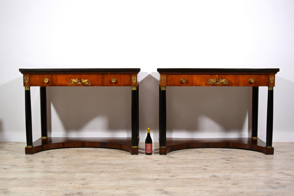 Cette élégante paire de grandes consoles Empire a été réalisée en Toscane au début du XIXe siècle. Les consoles présentent un plateau de forme rectangulaire en bois laqué noir. La façade est dotée d’un grand tiroir en bois plaqué, orné de poignées et d'applications en bronze doré finement ciselé. Sur les côtés, on retrouve des lyres avec rubans et volutes, tandis qu'au centre, deux griffons encadrent symétriquement l'entrée de serrure, entourés de rinceaux et d’éléments feuillagés.