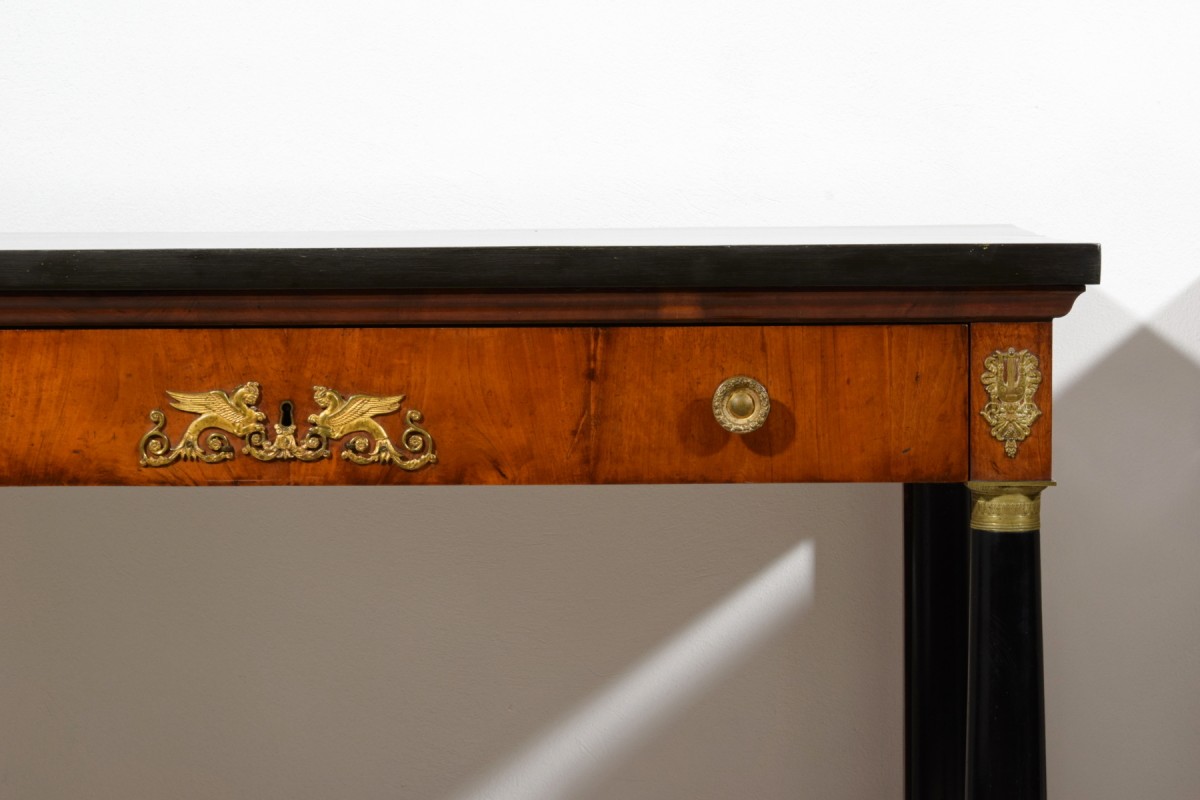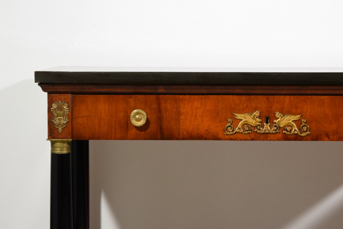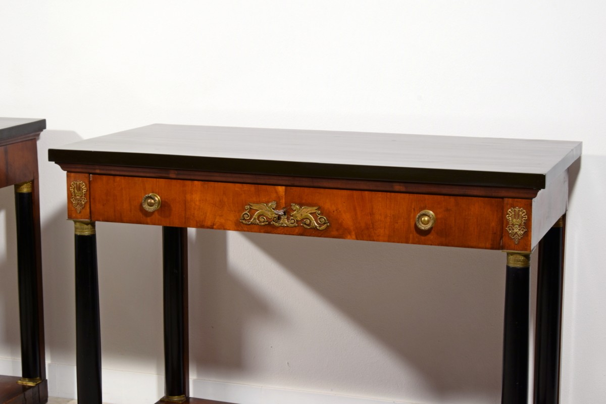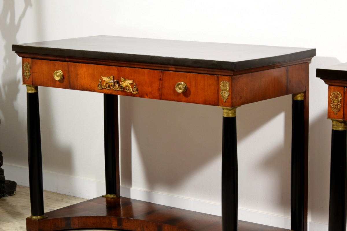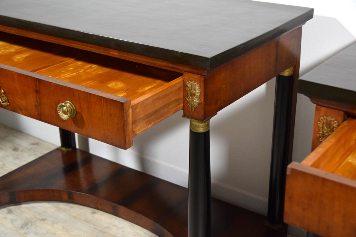 Cette élégante paire de grandes consoles Empire a été réalisée en Toscane au début du XIXe siècle. Les consoles présentent un plateau de forme rectangulaire en bois laqué noir. La façade est dotée d’un grand tiroir en bois plaqué, orné de poignées et d'applications en bronze doré finement ciselé. Sur les côtés, on retrouve des lyres avec rubans et volutes, tandis qu'au centre, deux griffons encadrent symétriquement l'entrée de serrure, entourés de rinceaux et d’éléments feuillagés.