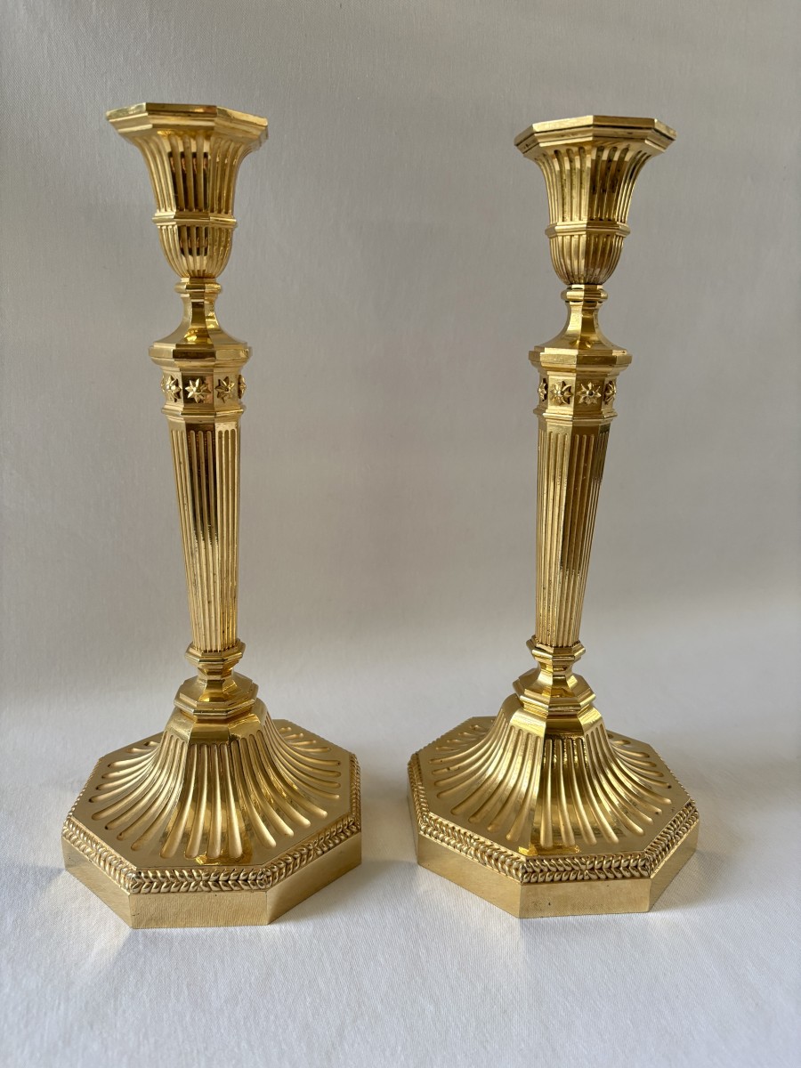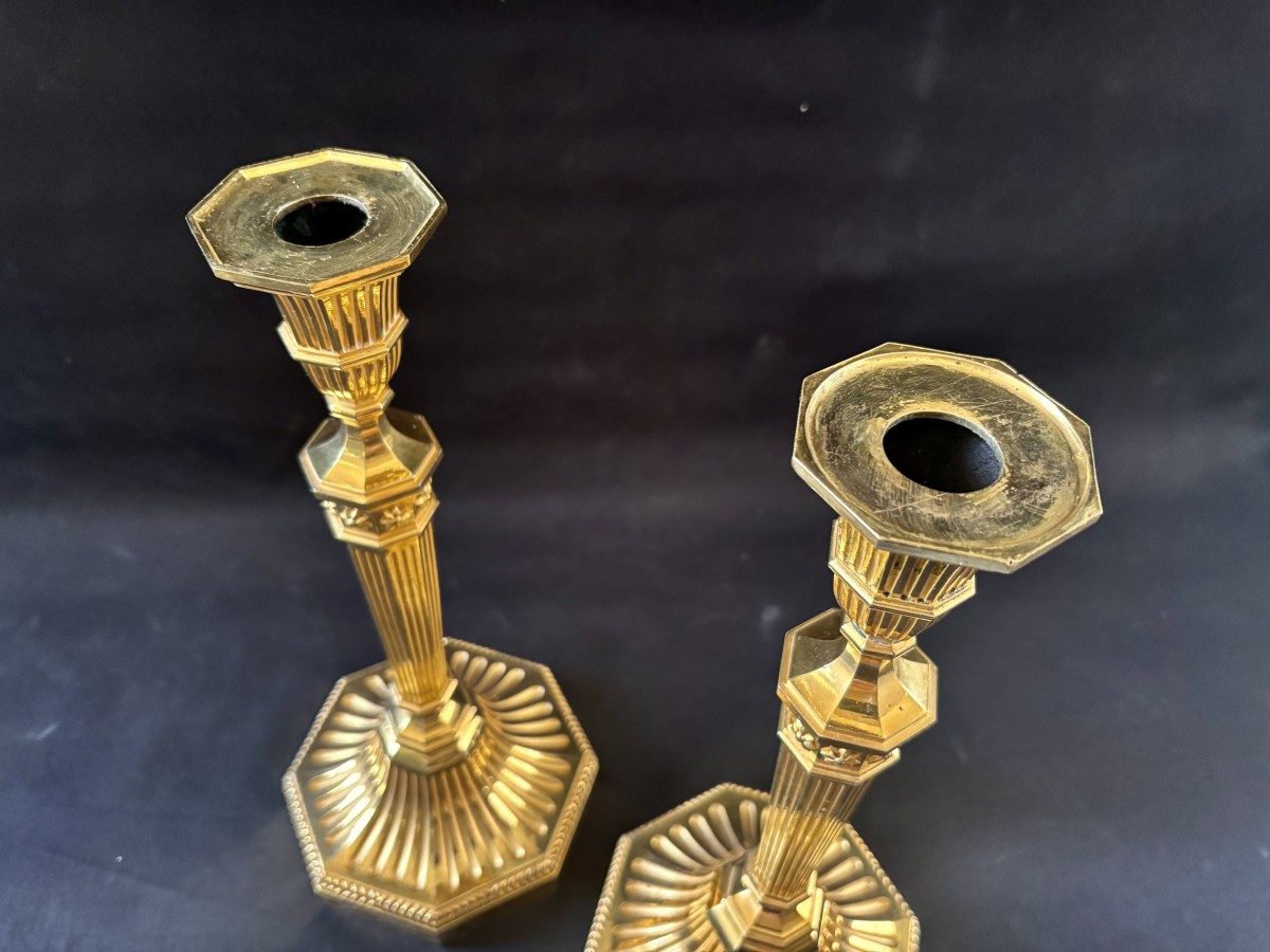 Paire de grands bougeoirs en bronze ciselé et doré à décor de cannelures.
