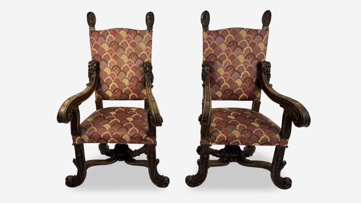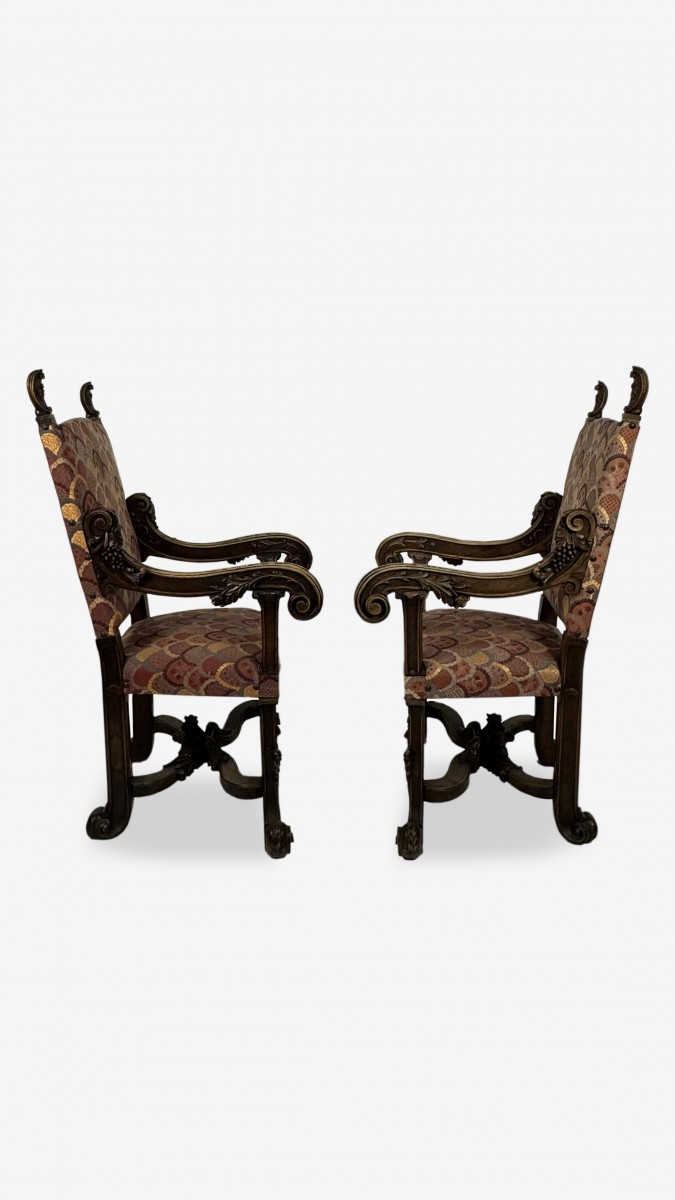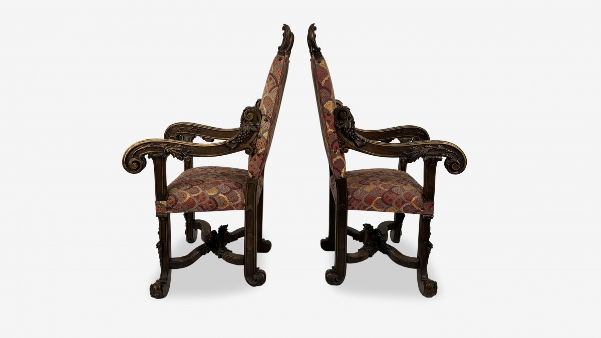 Paire de grands fauteuils en noyer, XXe siècle, de style Brustolon, accoudoirs et montants galbés, ornés de sarments de vigne terminés en volutes, pieds avant en volute ornés de motifs de feuilles et de fleurs en relief sur des extrémités recourbées, traverse en forme de X à motif végétal central, cartouches à petites fleurs, dossier et assise rembourrés recouverts de tissu patchwork, 145,5 x 93 x 80 cm