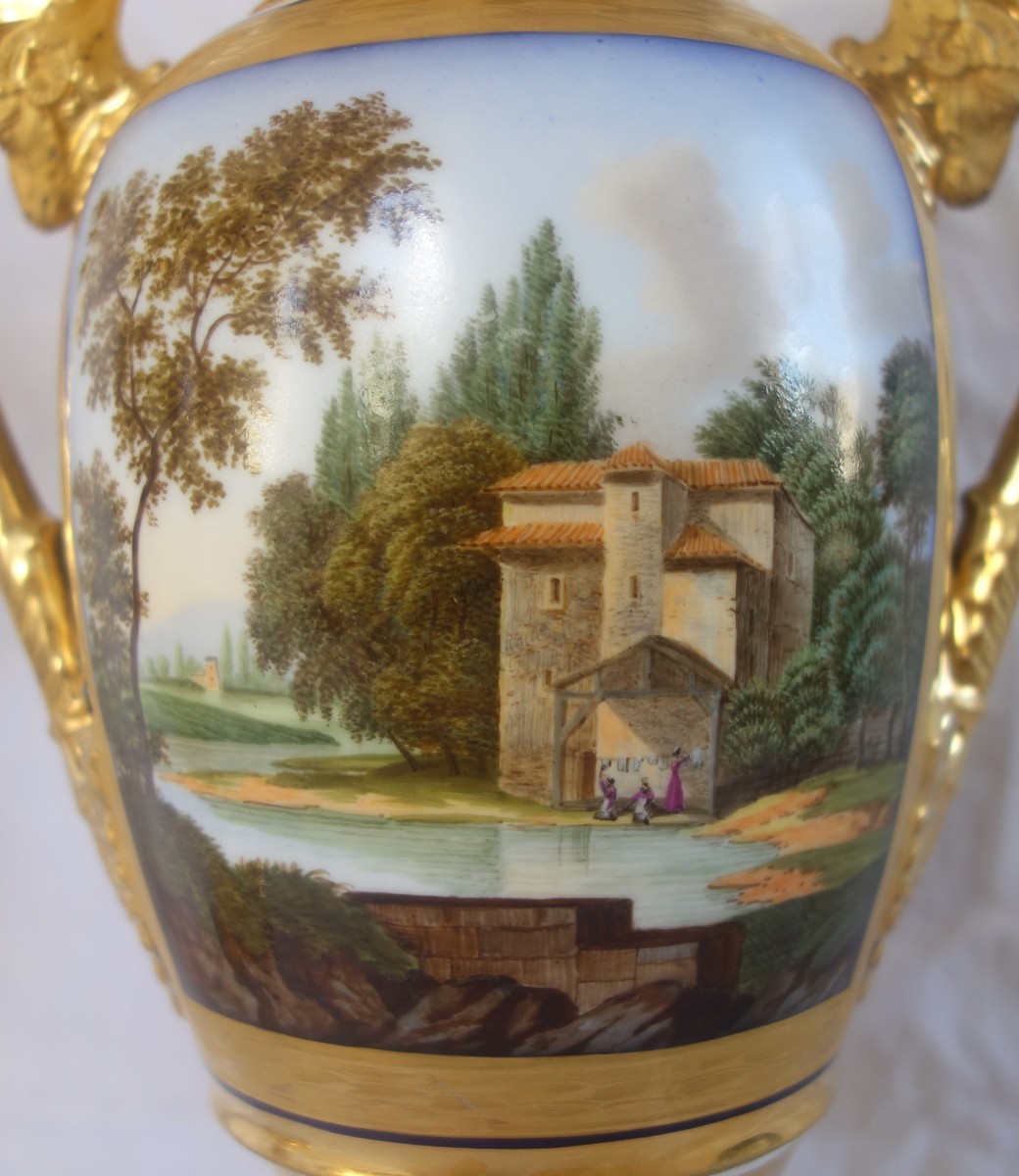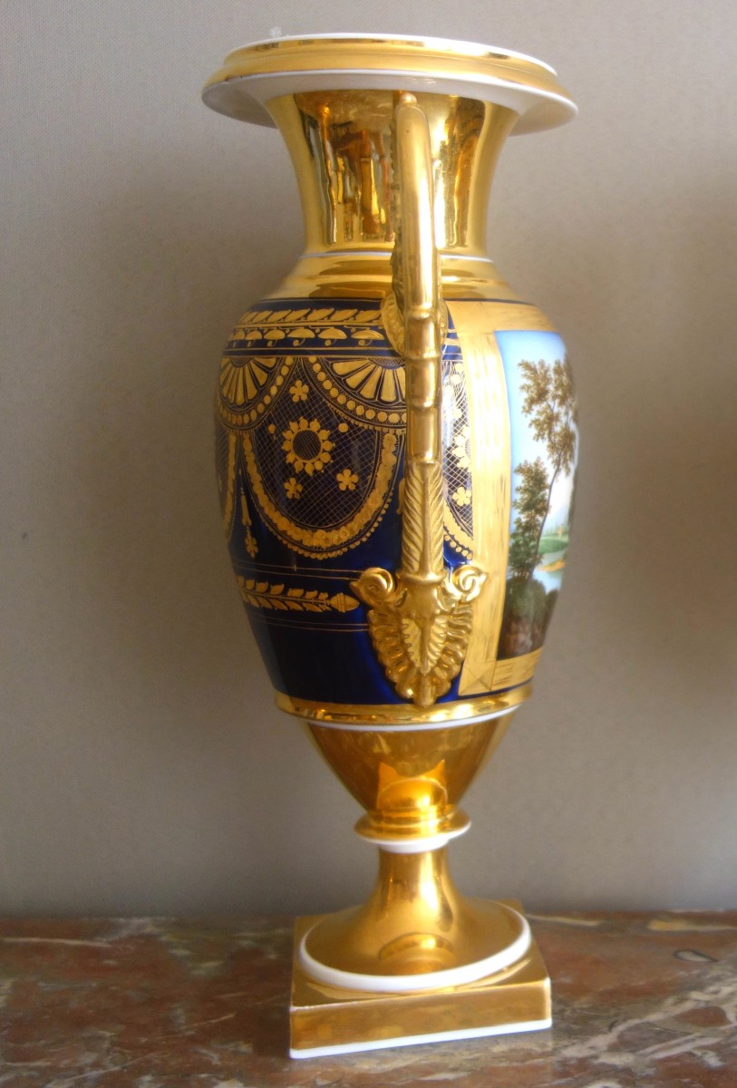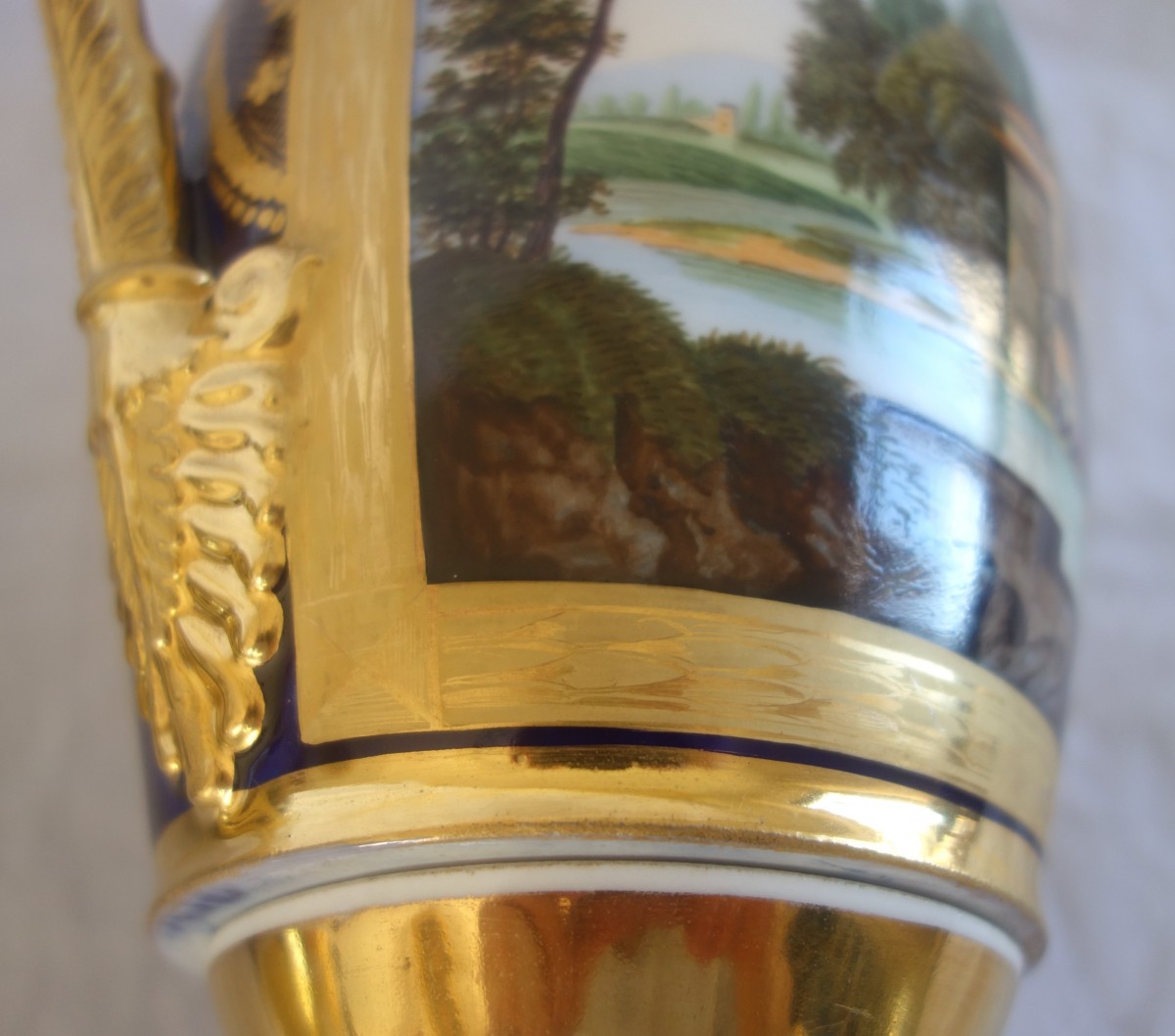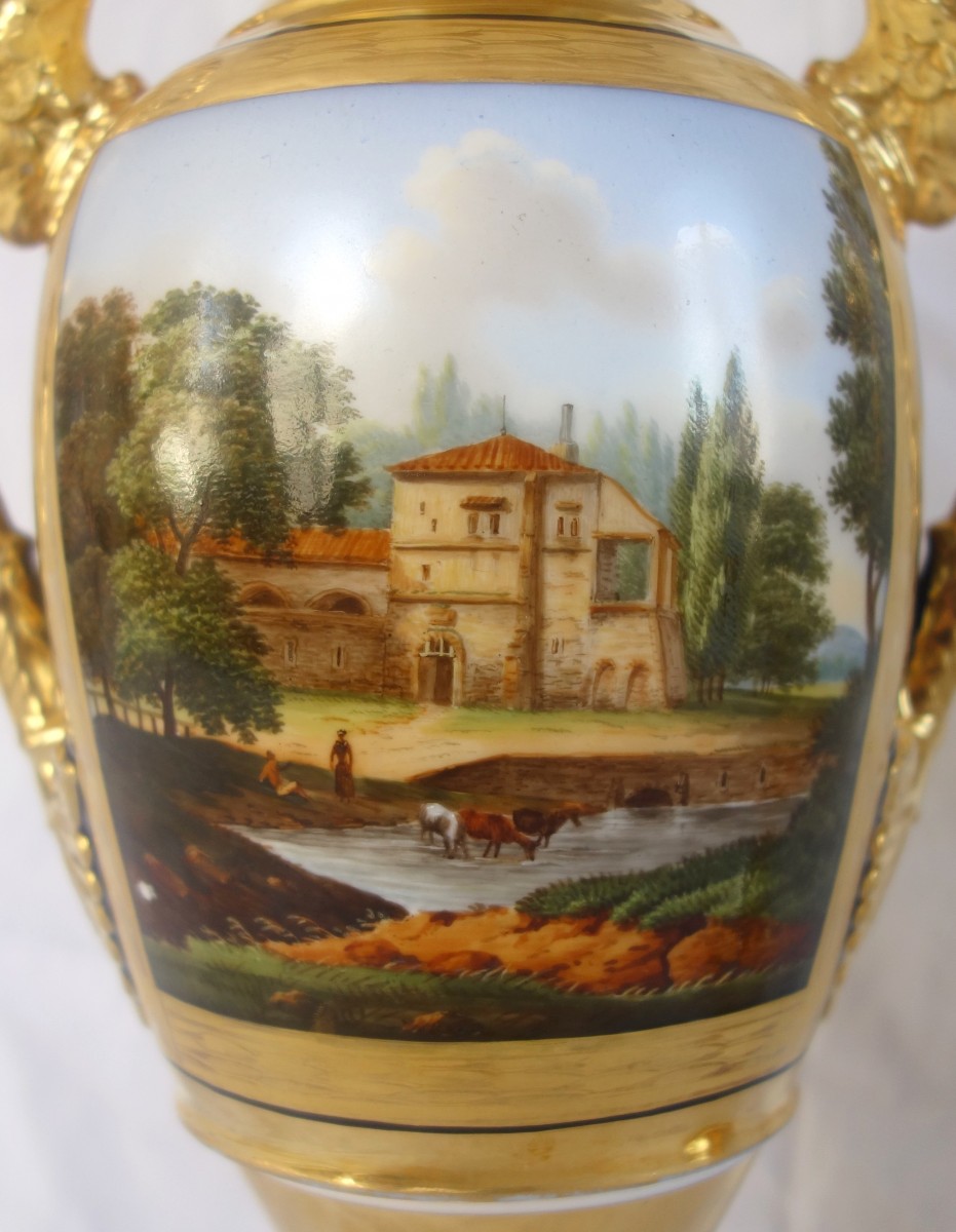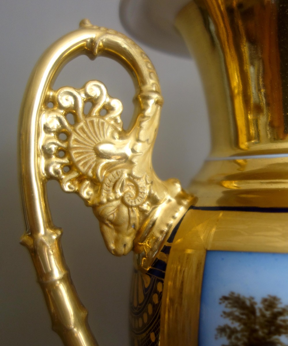 Beau décor de paysages Italiens dans des encadrements dorés en mat et brillant sur fond de couleur bleu de Sèvres, poignées latérales à masques de béliers. Nos vases ont deux faces, qui leur permet un double usage : d'un côté des paysages finement peints, de l'autre un fin treillage doré sur fond bleu de Sèvres.