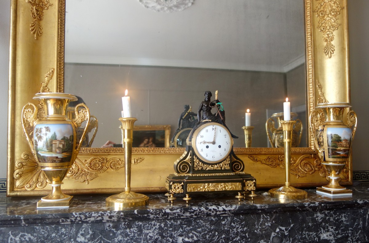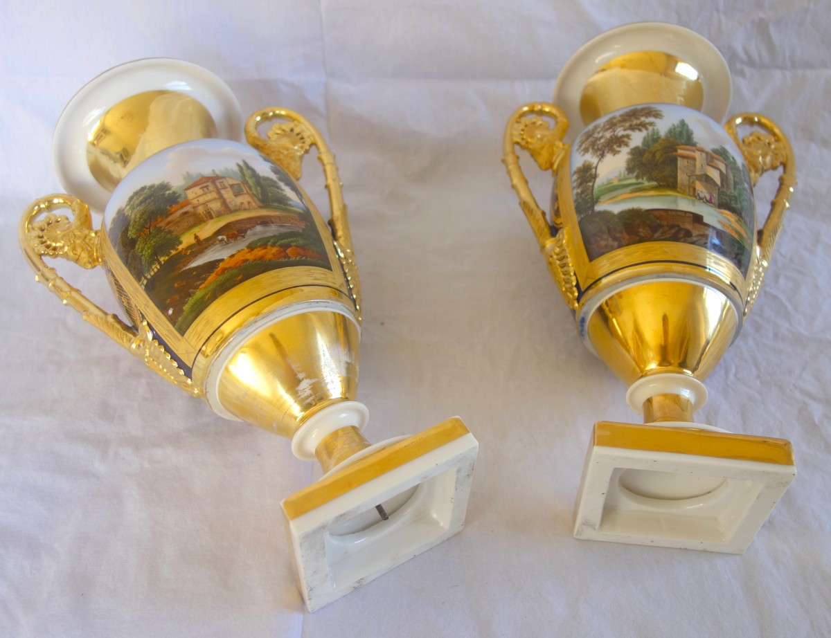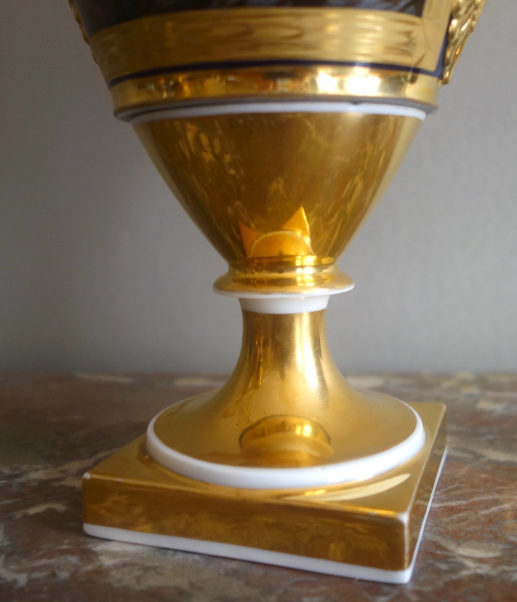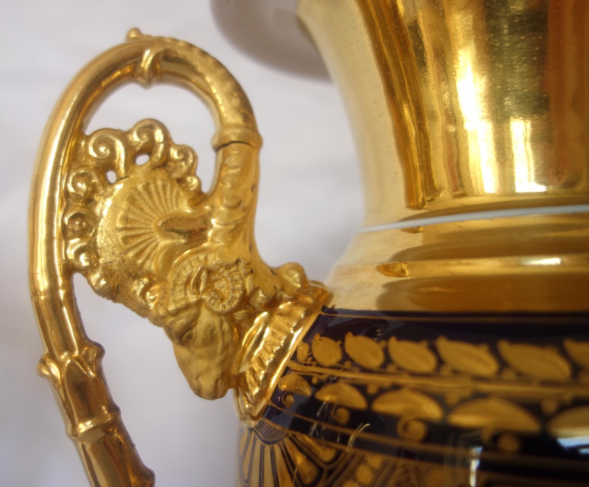 Superbe dorure à l'or en mat et brillant. Beaux vases de grand format ; la profondeur des couleurs les rend très décoratifs. Idéaux pour orner une cheminée ou une commode en complément d'une paire de bougeoirs, dans une décoration Empire.
