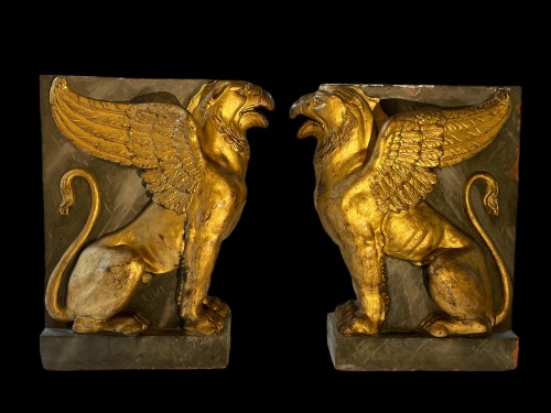 Paire de griffons en terre cuite dorée et peinte à l'imitation du marbre bleu turquin. Epoque début XIXe.
