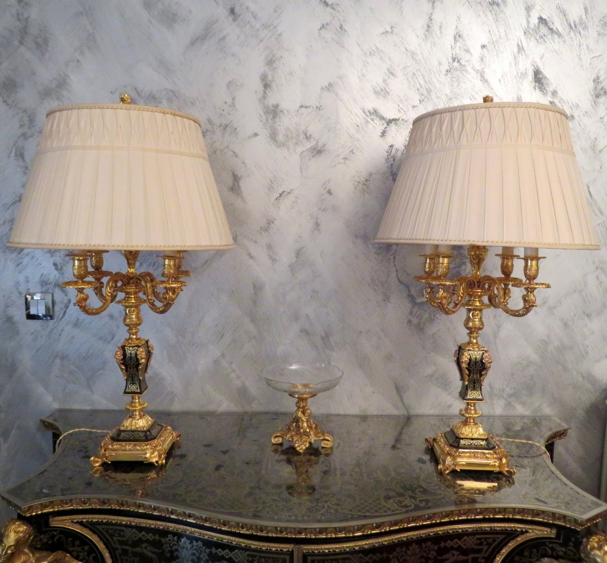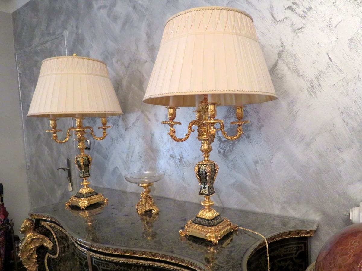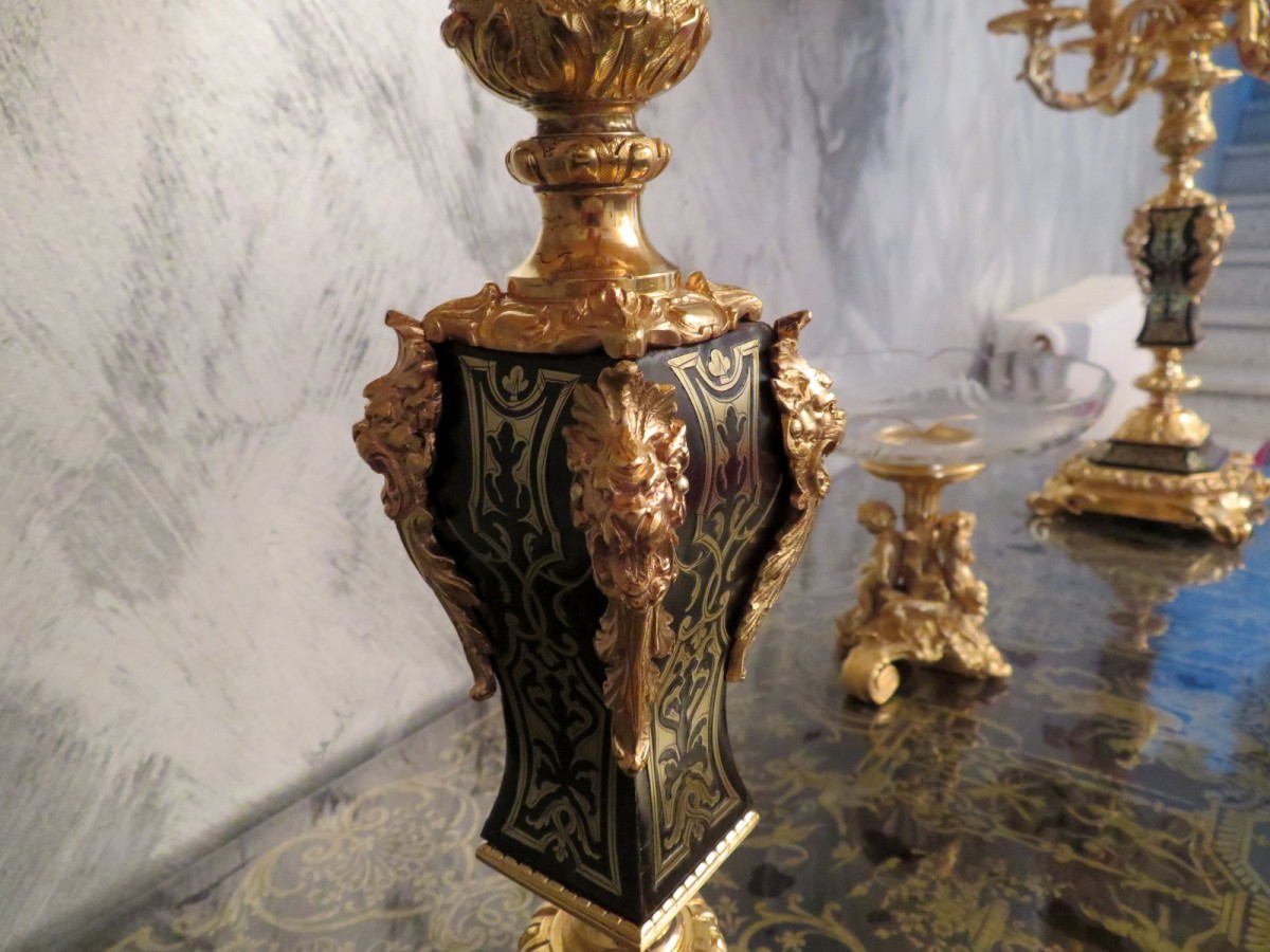 Retrouver le mobilier ou les objets d''art similaires à « Paire de Lampe Candelabre en marqueterie Boulle et en Bronze époque Napoléon III » présenté par Antiquités Biau, antiquaire à Manduel dans la catégorie Bougeoirs et Chandeliers Napoléon III, Luminaires.
