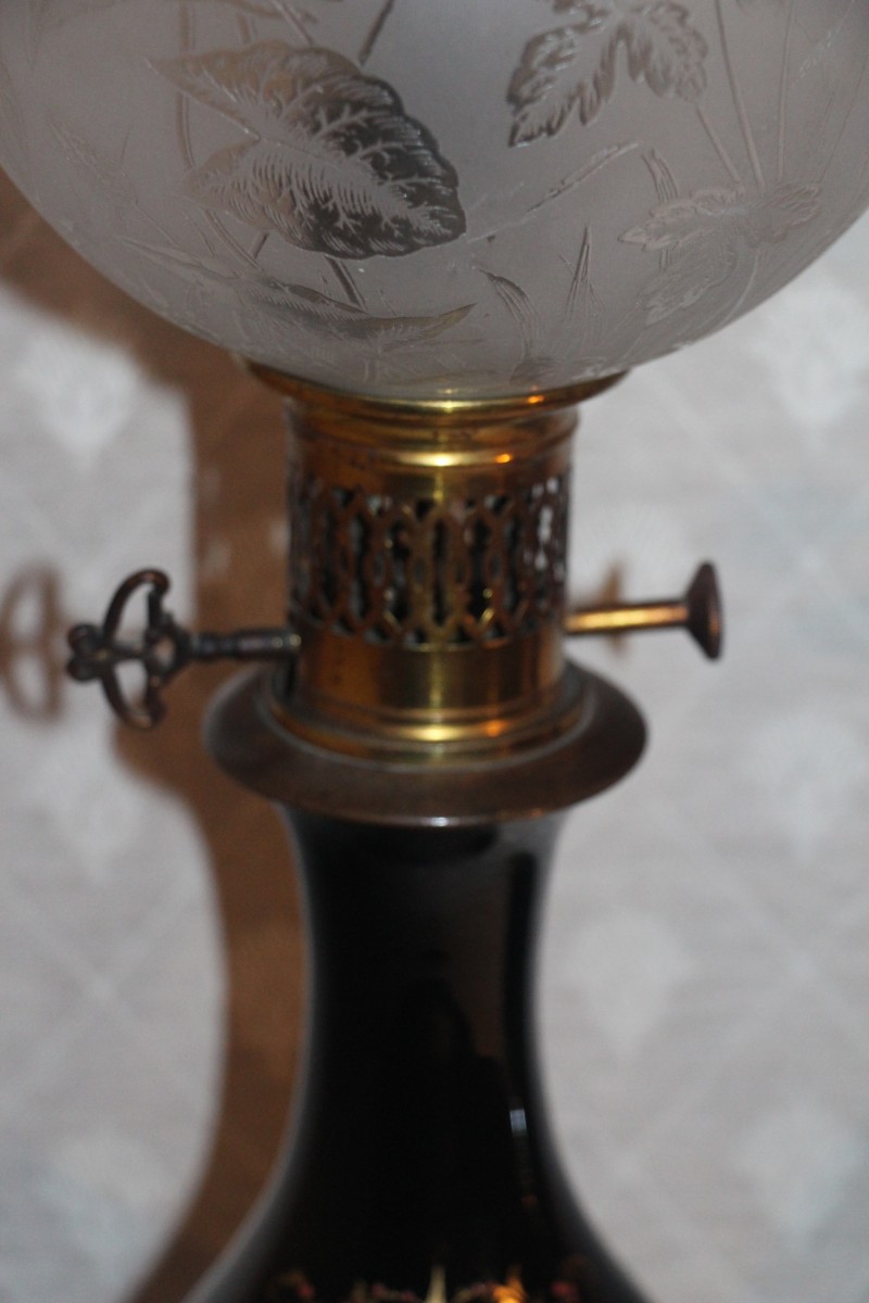 Belle et élégante paire de lampes en opaline noire décorée de motifs à rehaut d'or sous la forme d'arabesques et d'une coquille émaillée bleue.