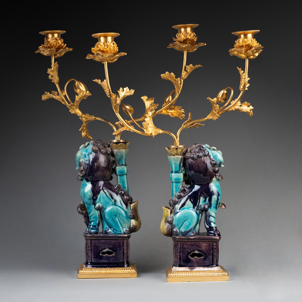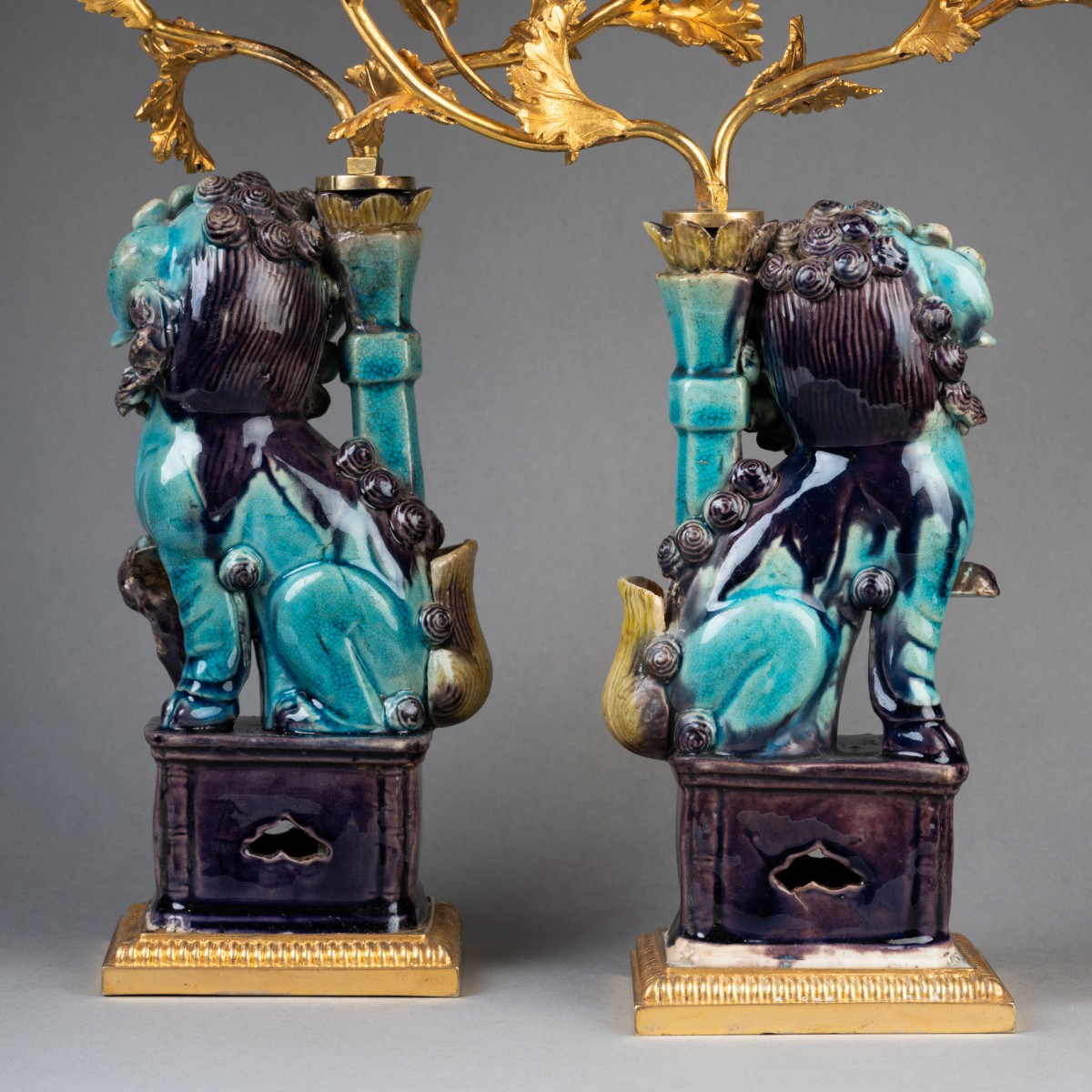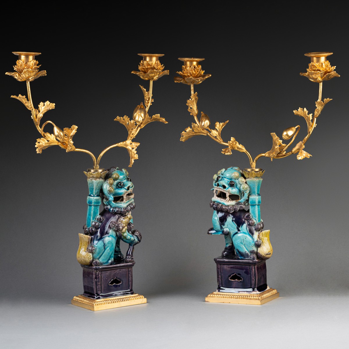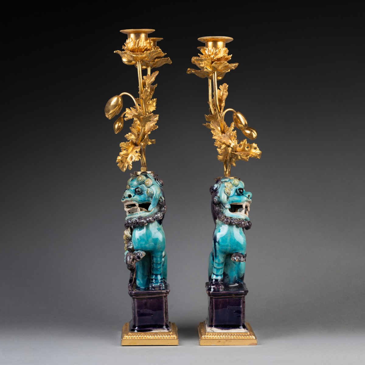 Deux lions bouddhiques en grès émaillé bleu turquoise dit "Sancai" ; ils reposent sur des terrasses de bronze doré et reçoivent, dans les porte-encens, un bouquet de branches de pavots en bronze doré formant luminaires. Travail de la fin du XVIIIe siècle.
