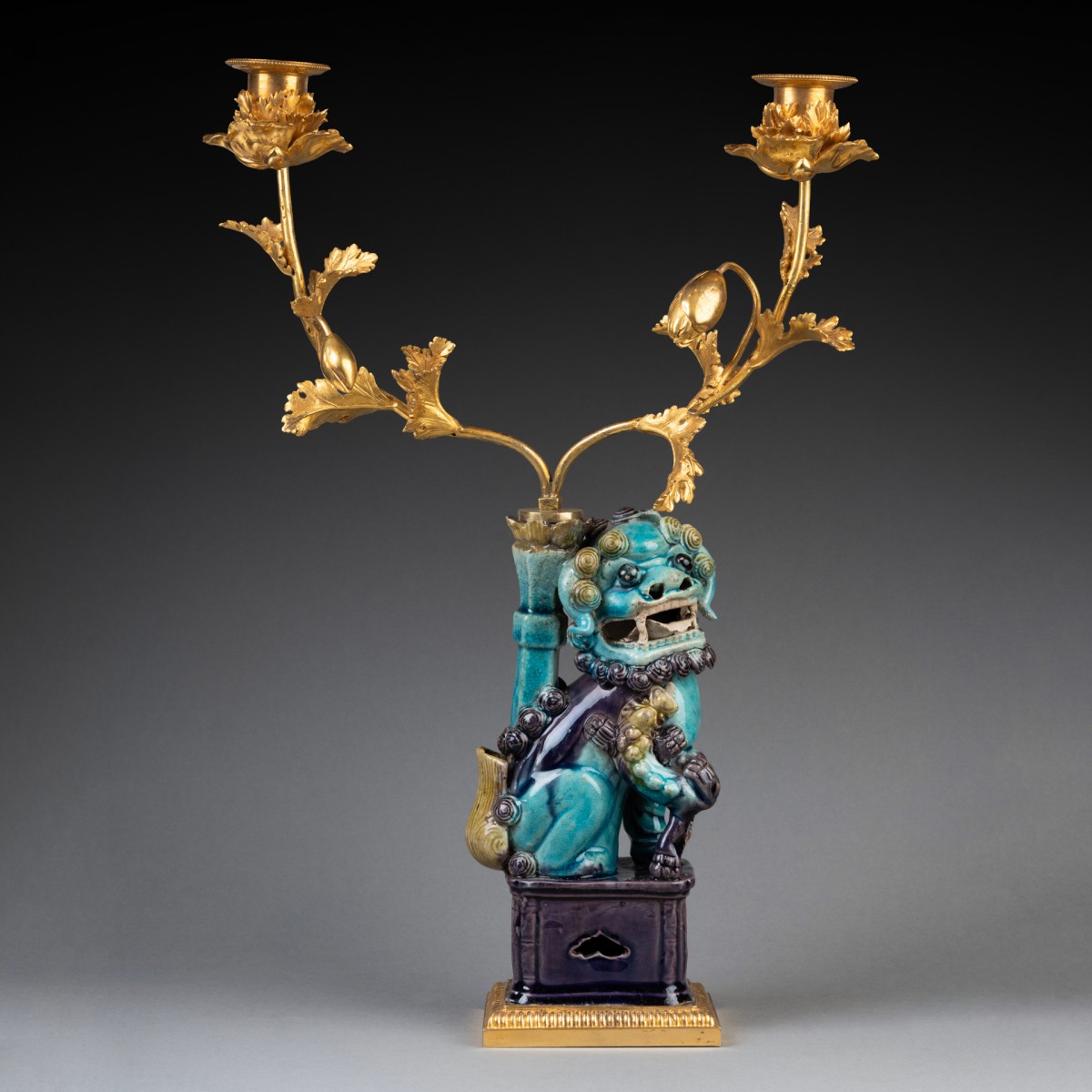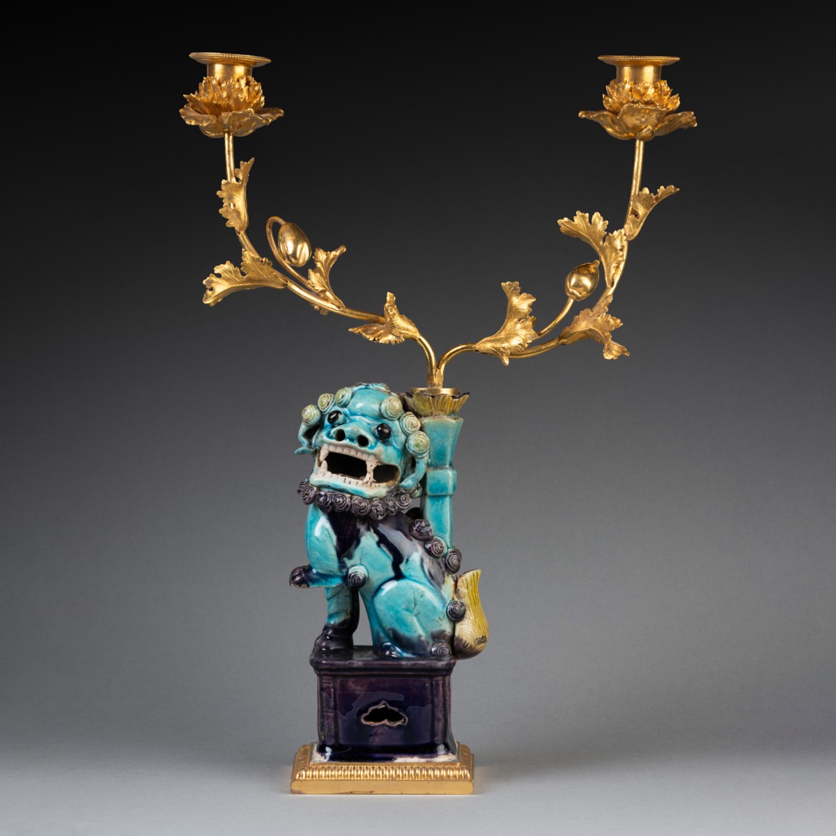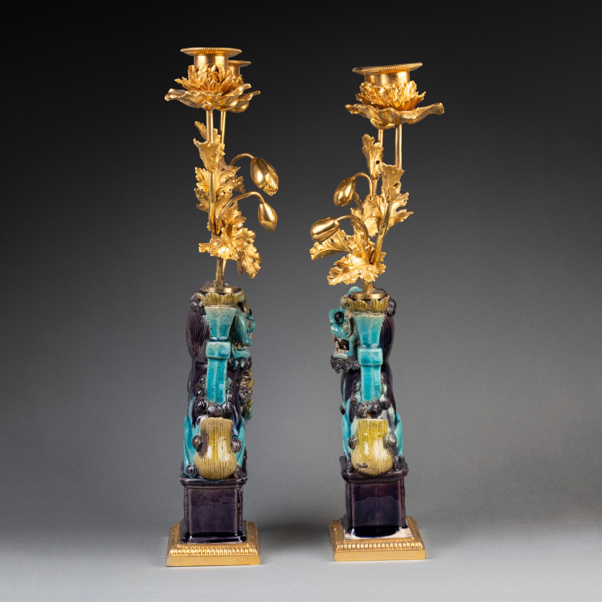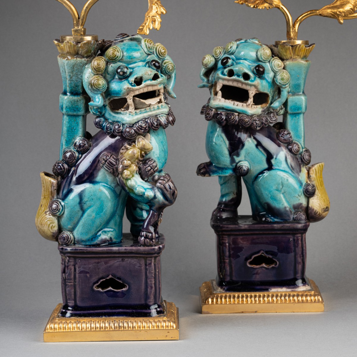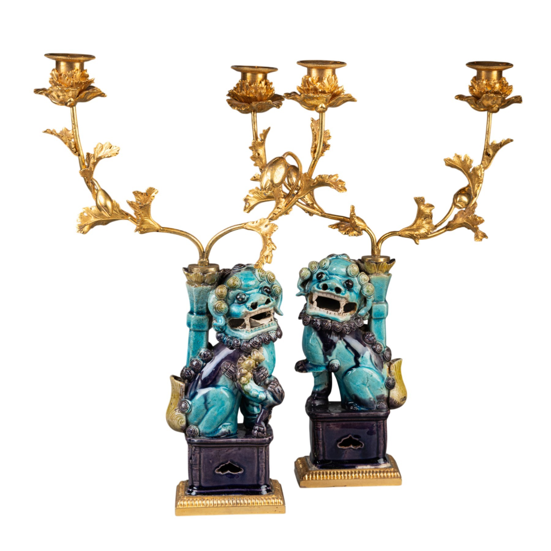 Deux lions bouddhiques en grès émaillé bleu turquoise dit "Sancai" ; ils reposent sur des terrasses de bronze doré et reçoivent, dans les porte-encens, un bouquet de branches de pavots en bronze doré formant luminaires. Travail de la fin du XVIIIe siècle.
