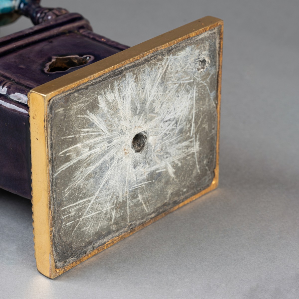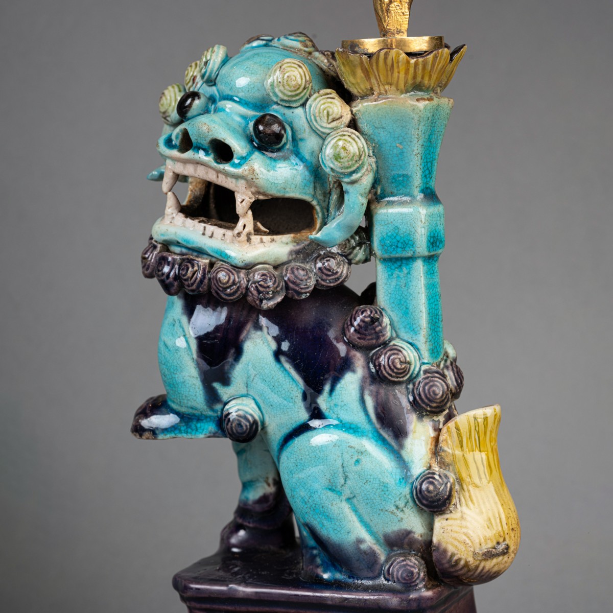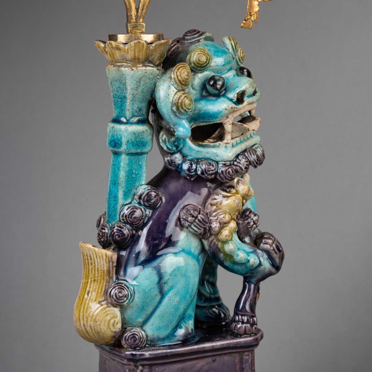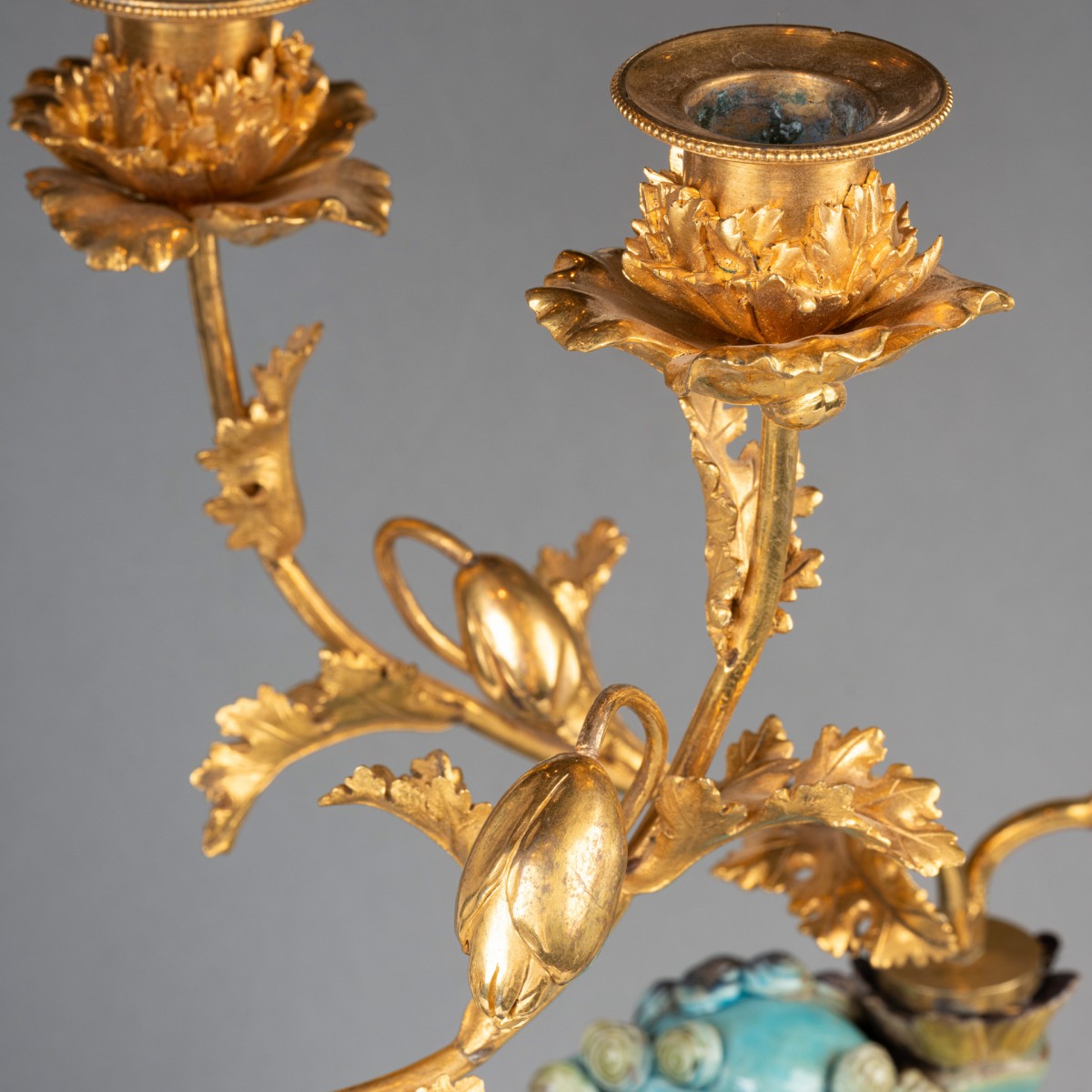 Deux lions bouddhiques en grès émaillé bleu turquoise dit "Sancai" ; ils reposent sur des terrasses de bronze doré et reçoivent, dans les porte-encens, un bouquet de branches de pavots en bronze doré formant luminaires. Travail de la fin du XVIIIe siècle.