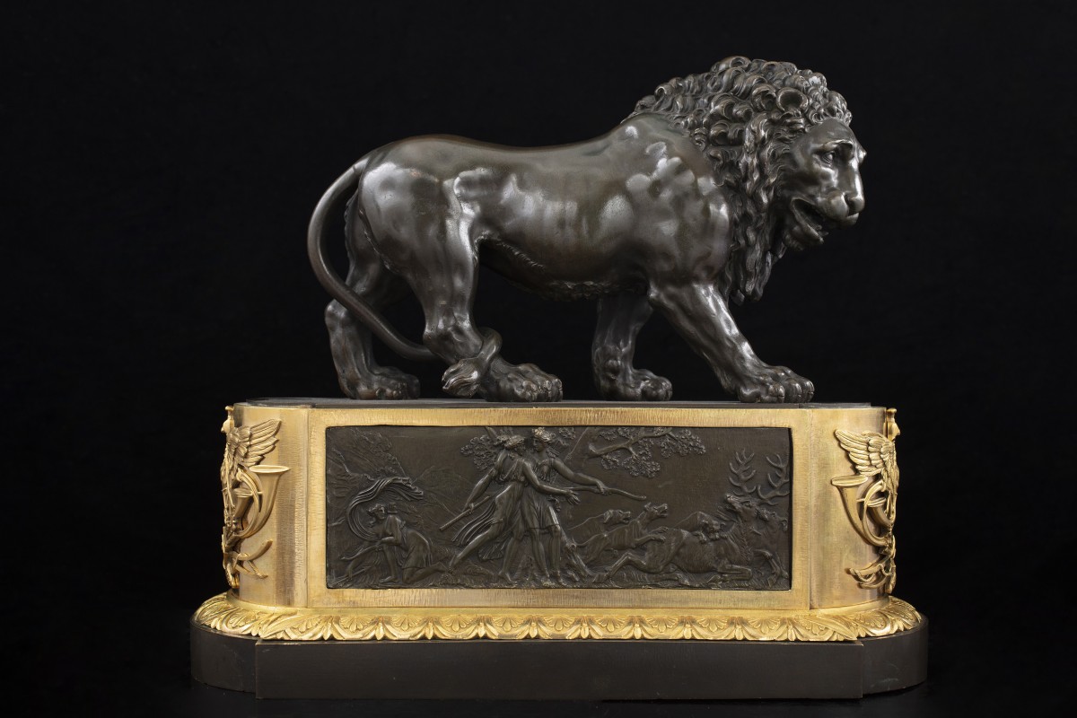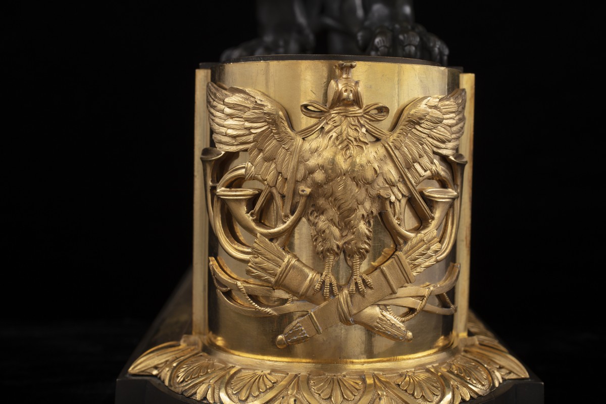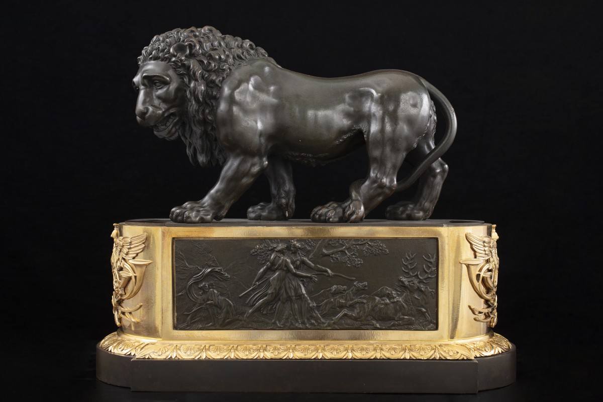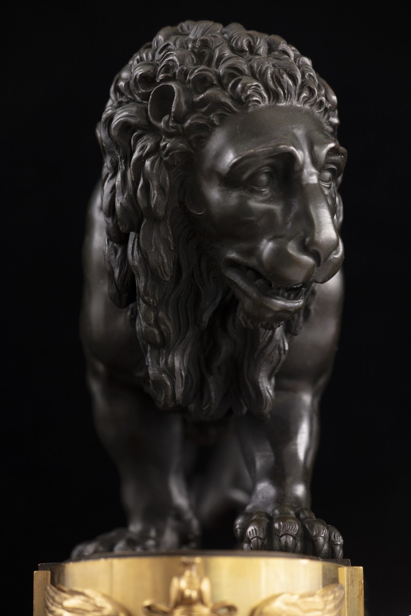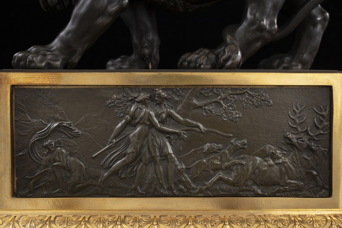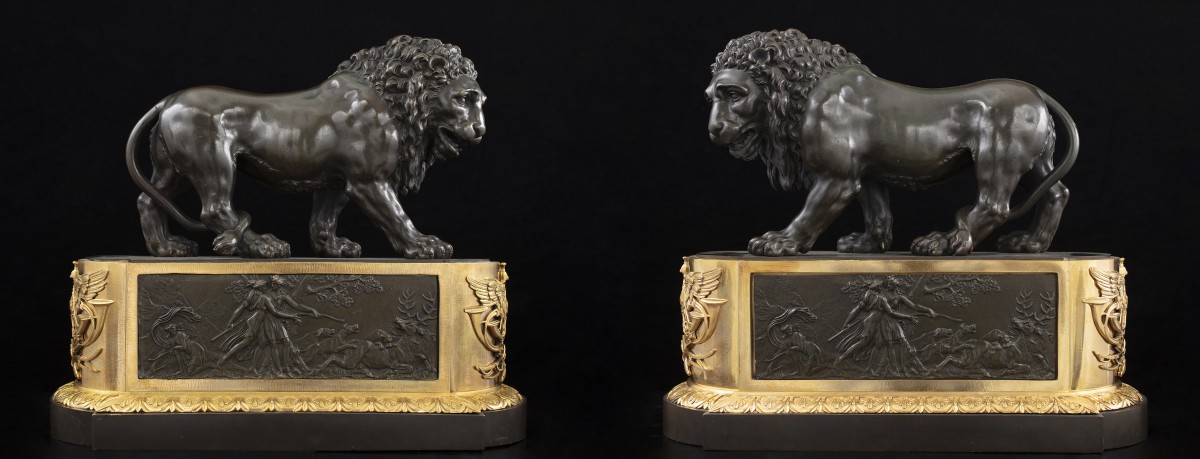 Paire de lions en bronze bruni posés sur un socle en bronze doré, les deux lions majestueux sont sculptés en train de rugir et tiennent fièrement une de leurs pattes avant vers l'avant et leurs queues enroulées autour d'une patte arrière. Les lions, figures typiquement associées à la fierté et à la force, sont en bronze bruni : ce choix crée un fort contraste avec le bronze doré du socle qui les surélève, comme pour confirmer leur position privilégiée. La base présente une frise, également en bronze bruni, représentant une scène de chasse composée de trois figures féminines, équipées d'arc et de flèches, décidées à tuer un cerf. Sur le devant de la base se trouve un blason composé de : un aigle aux ailes déployées qui tient quatre trompettes tandis qu'avec ses pattes il saisit deux carquois contenant des flèches. France. Époque : Empire. HxLxP : 36x40x18 cm.