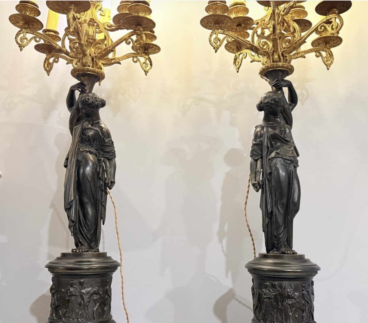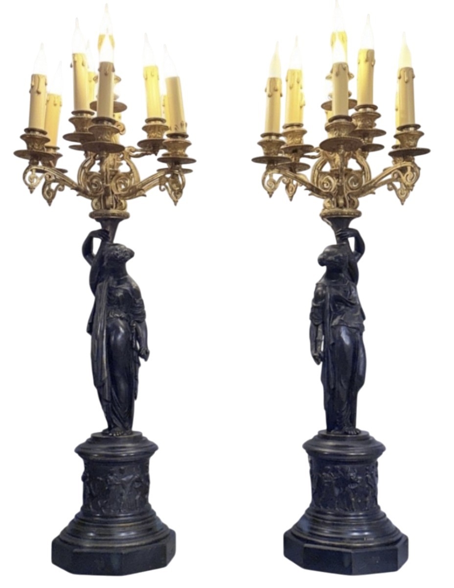 Importante et élégante paire de candélabres en bronze finement ciselé, reposant sur une composition allégorique de vestales drapées à l’antique, inspirées de l’esthétique gréco-romaine.