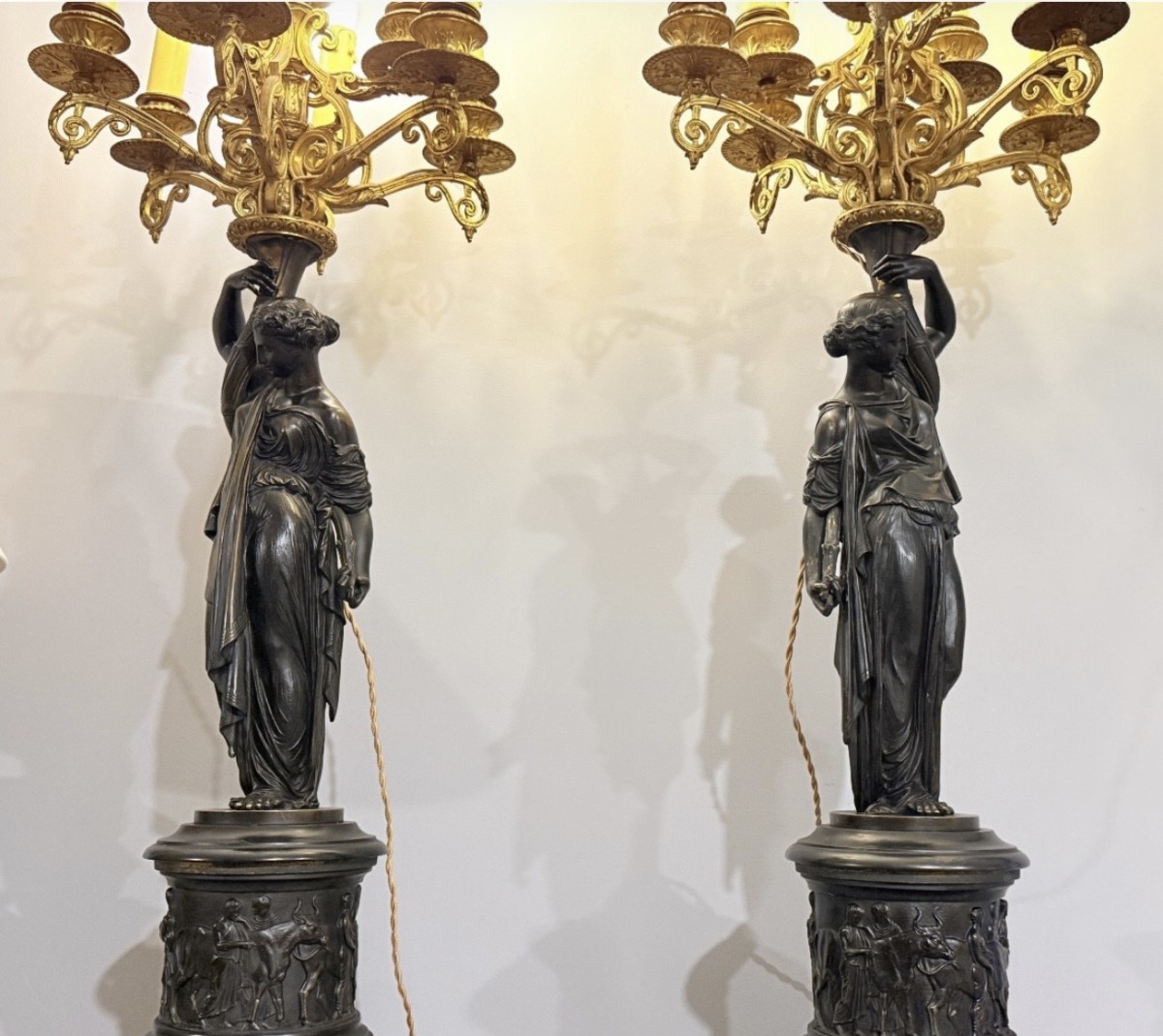 Chaque candélabre se compose d’une figure féminine en bronze patiné, debout, vêtue d’un long drapé à l’antique, tenant au-dessus de sa tête un fût supportant une riche garniture de lumières en bronze doré.